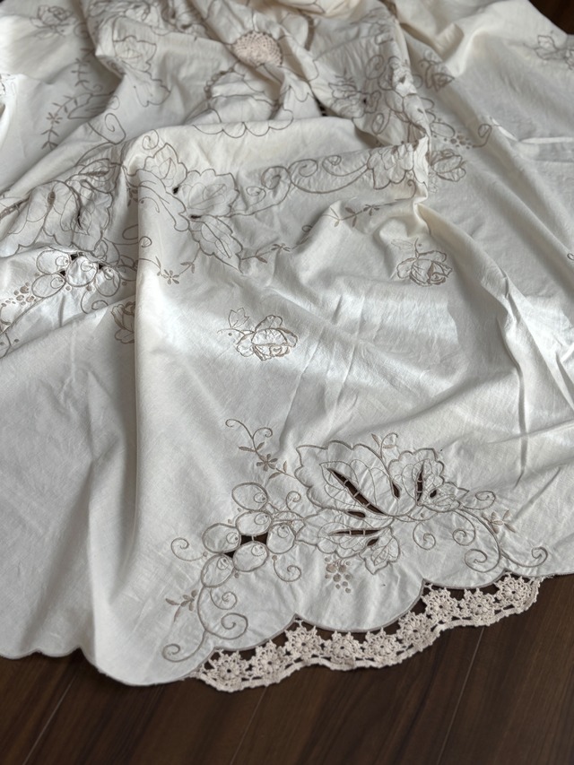 時を重ねたヴィンテージレースが描く、 静かに咲く白い花。 ヴィンテージクロスから仕立てた、 軽やかで柔らかなレースのトートバッグです。 繊細な編み模様から差し込む光、 手に取ったときに伝わるやさしい温もり。 新品にはない、長い時間を旅してきた布だけが持つ表情があります。 くしゅっと結ぶ持ち手が、 気取らない可愛らしさと抜け感をプラス。 エコバッグとしてはもちろん、 ワンピースに合わせて“装いの一部”としても楽しめます。 同じ柄は二度と出会えない、世界にひとつ。 日常の中で、そっとご機嫌を上げてくれる存在になりますように。 【size】 縦:約64cm 横:約62cm マチ:なし 【attention】 ・ヴィンテージ生地を使用しているため、 小さなほつれや風合いの違いが見られる場合があります ・繊細な素材で伸縮性のあるレースのため、重いものを入れる際はご注意ください ・一点一点、柄の出方が異なります
