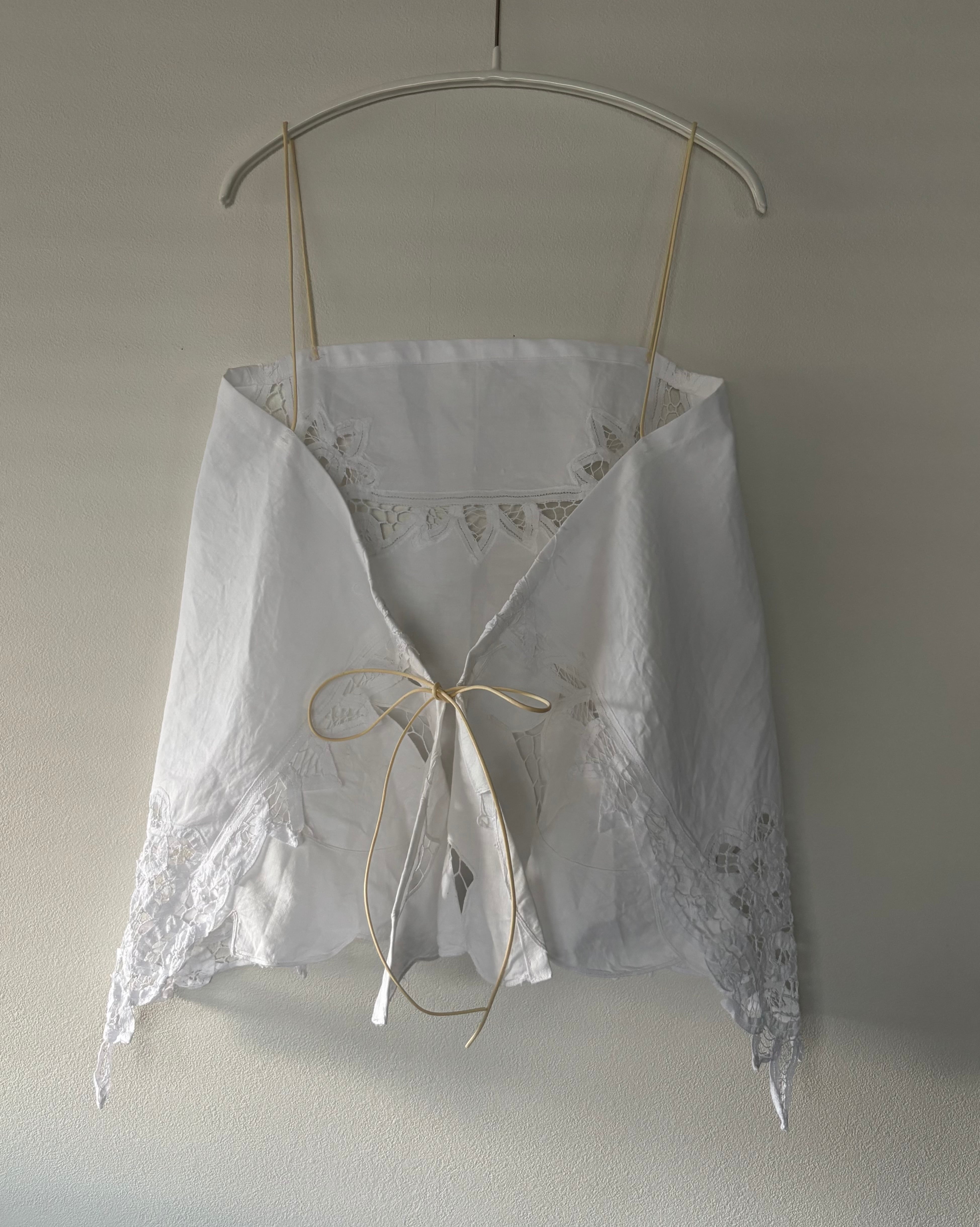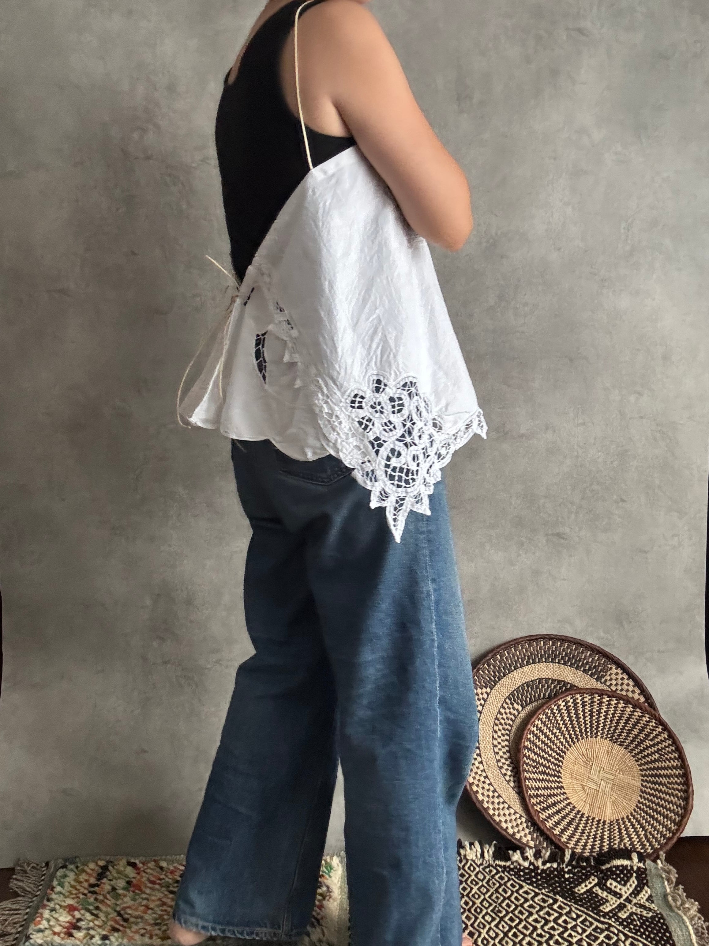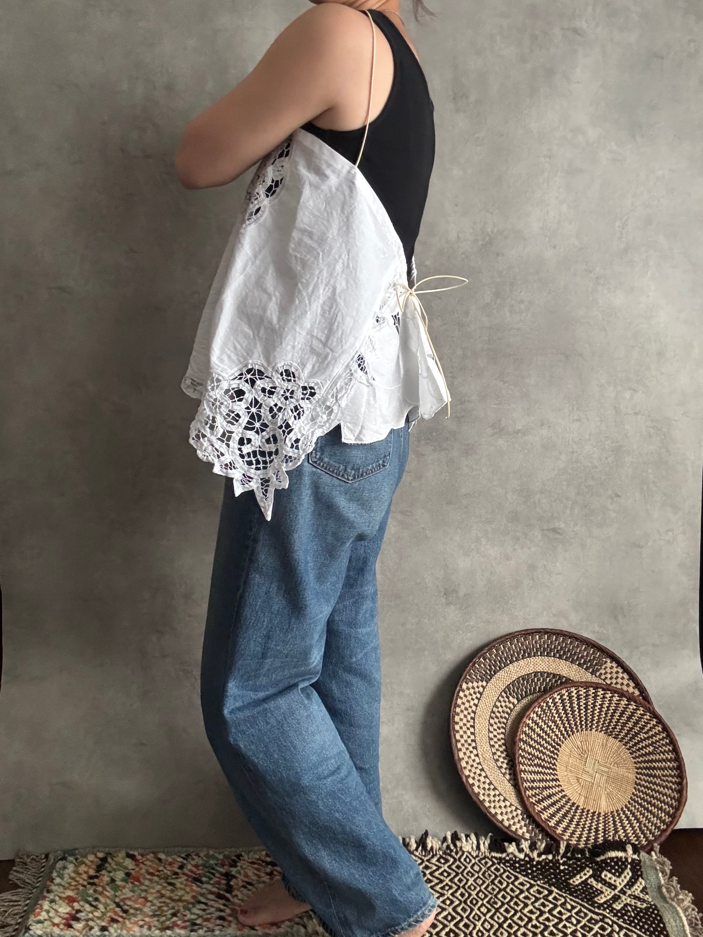 バテンレースの小さめなクロスと、以前お作りしたワンピースの残り布を組み合わせて作りました。