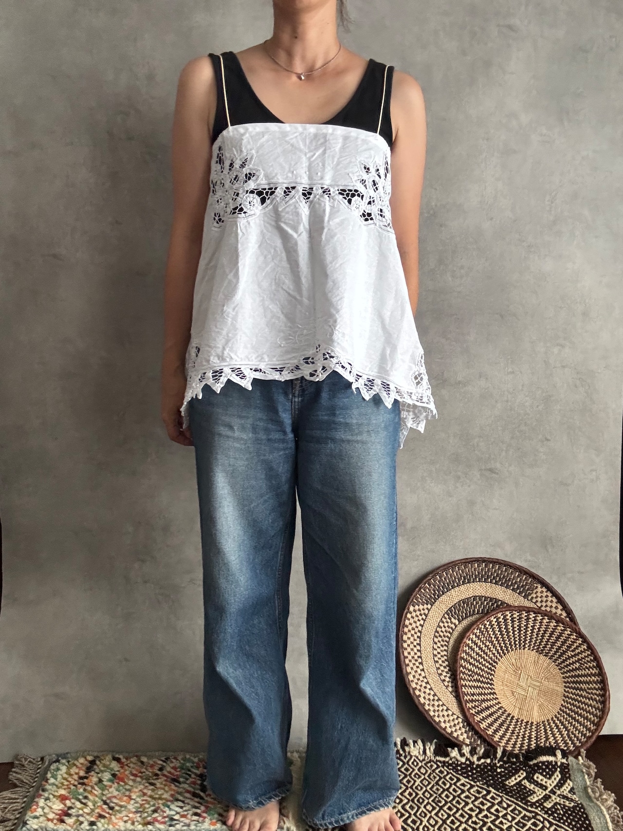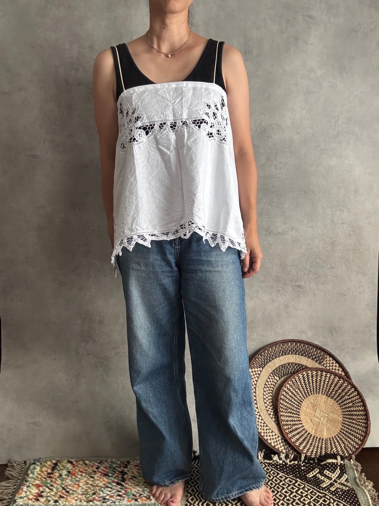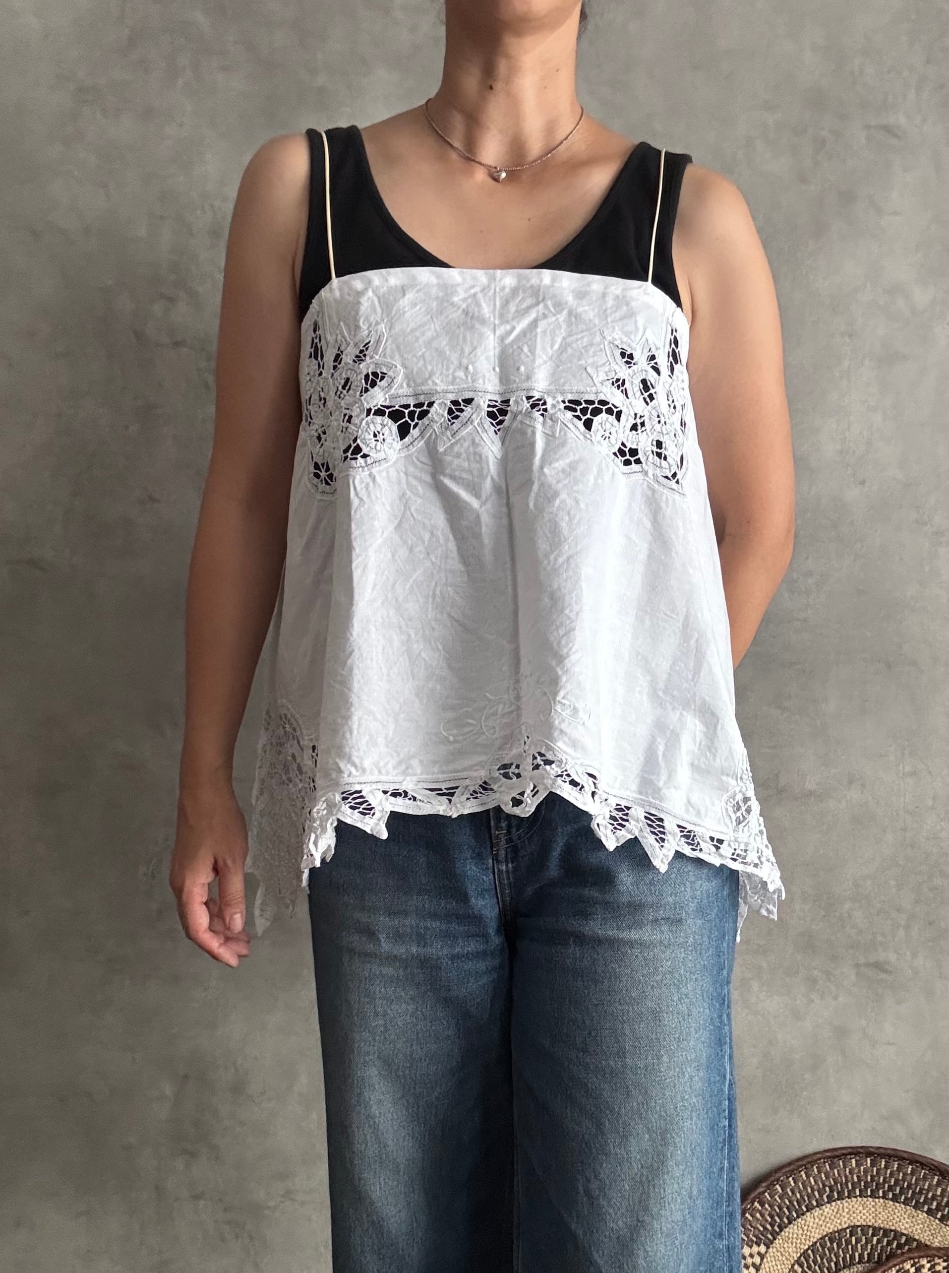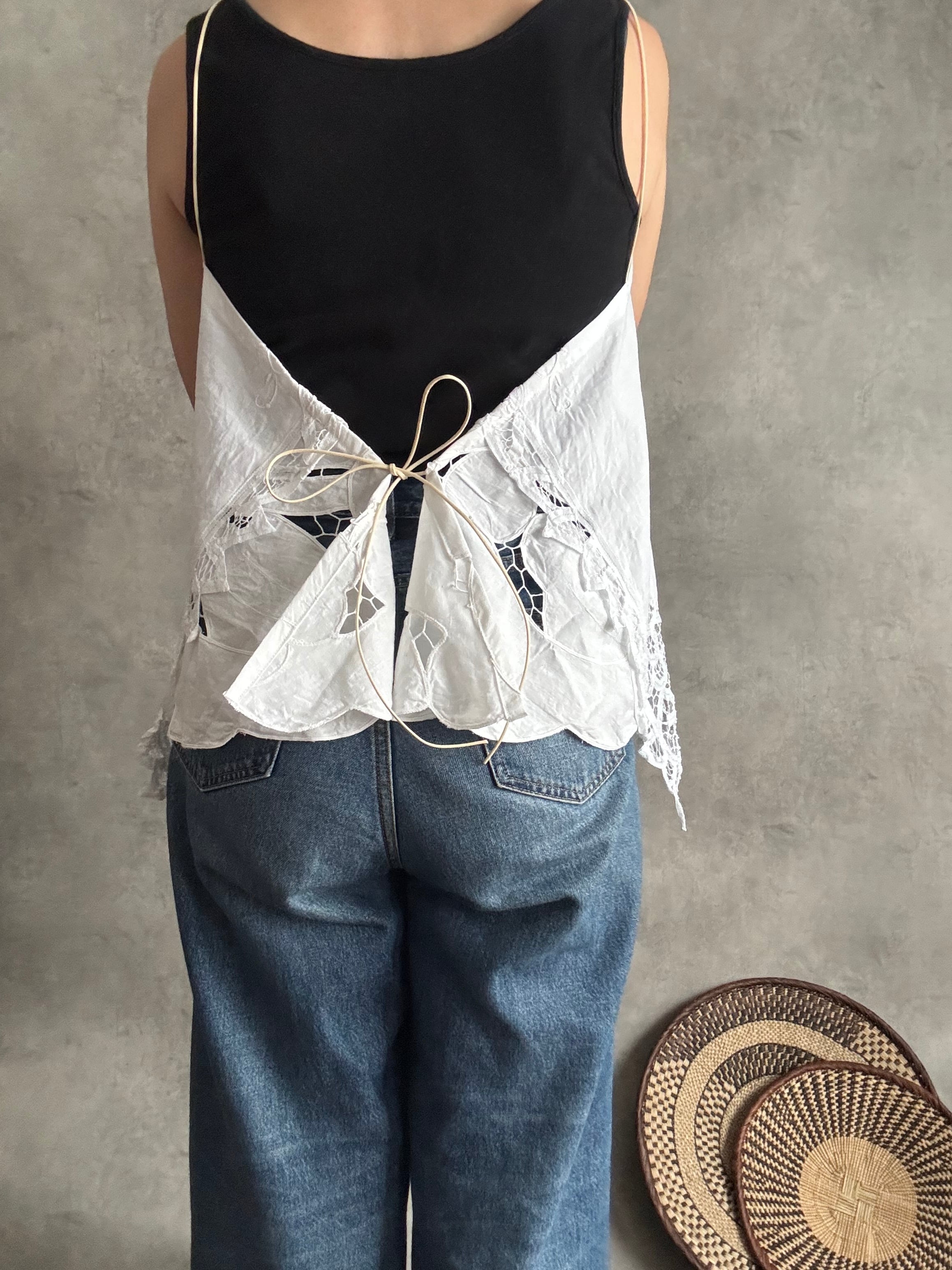 バテンレースの小さめなクロスと、以前お作りしたワンピースの残り布を組み合わせて作りました。