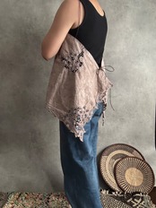 バテンレースの小さめなクロスと、以前お作りしたワンピースの残り布を組み合わせて作りました。