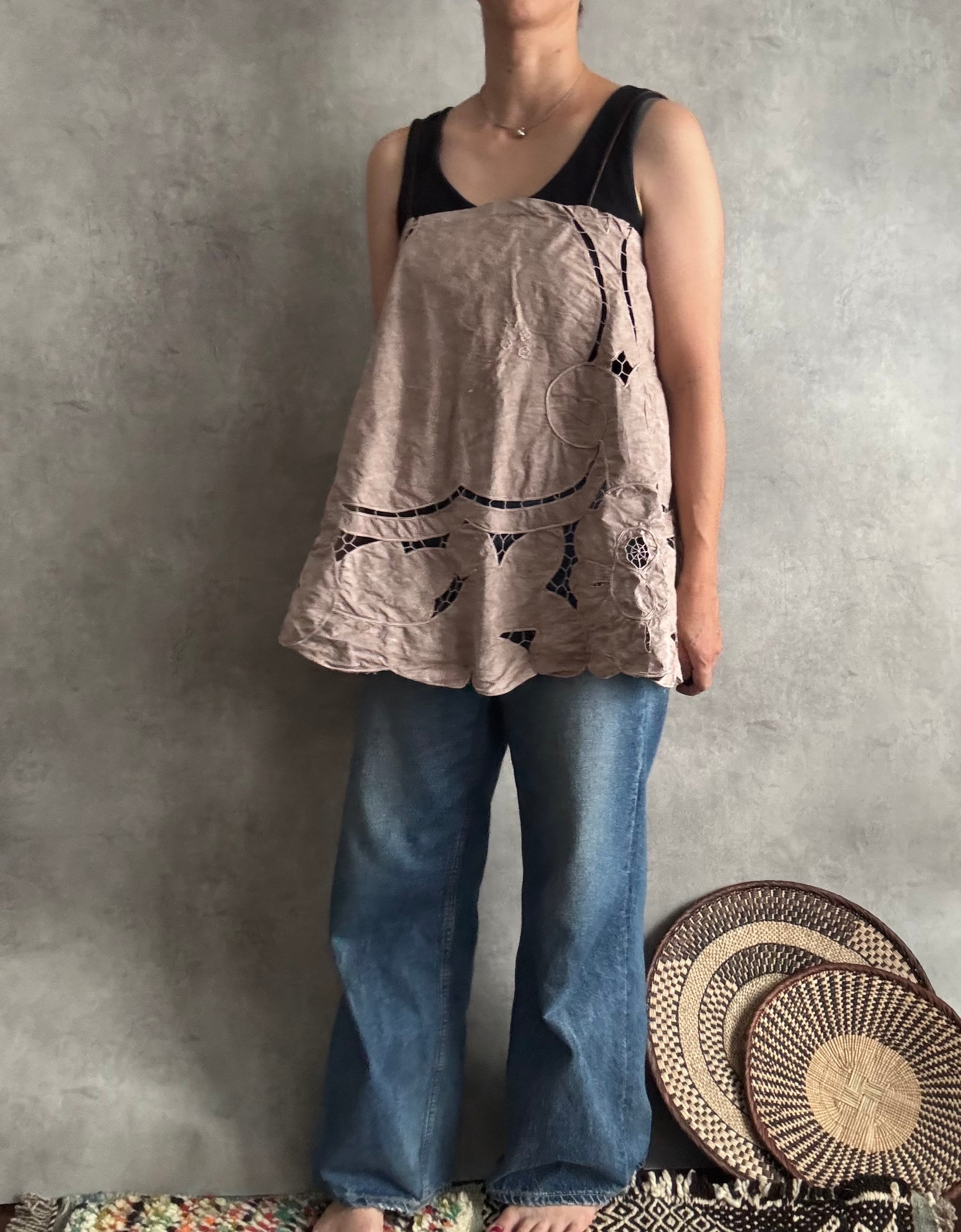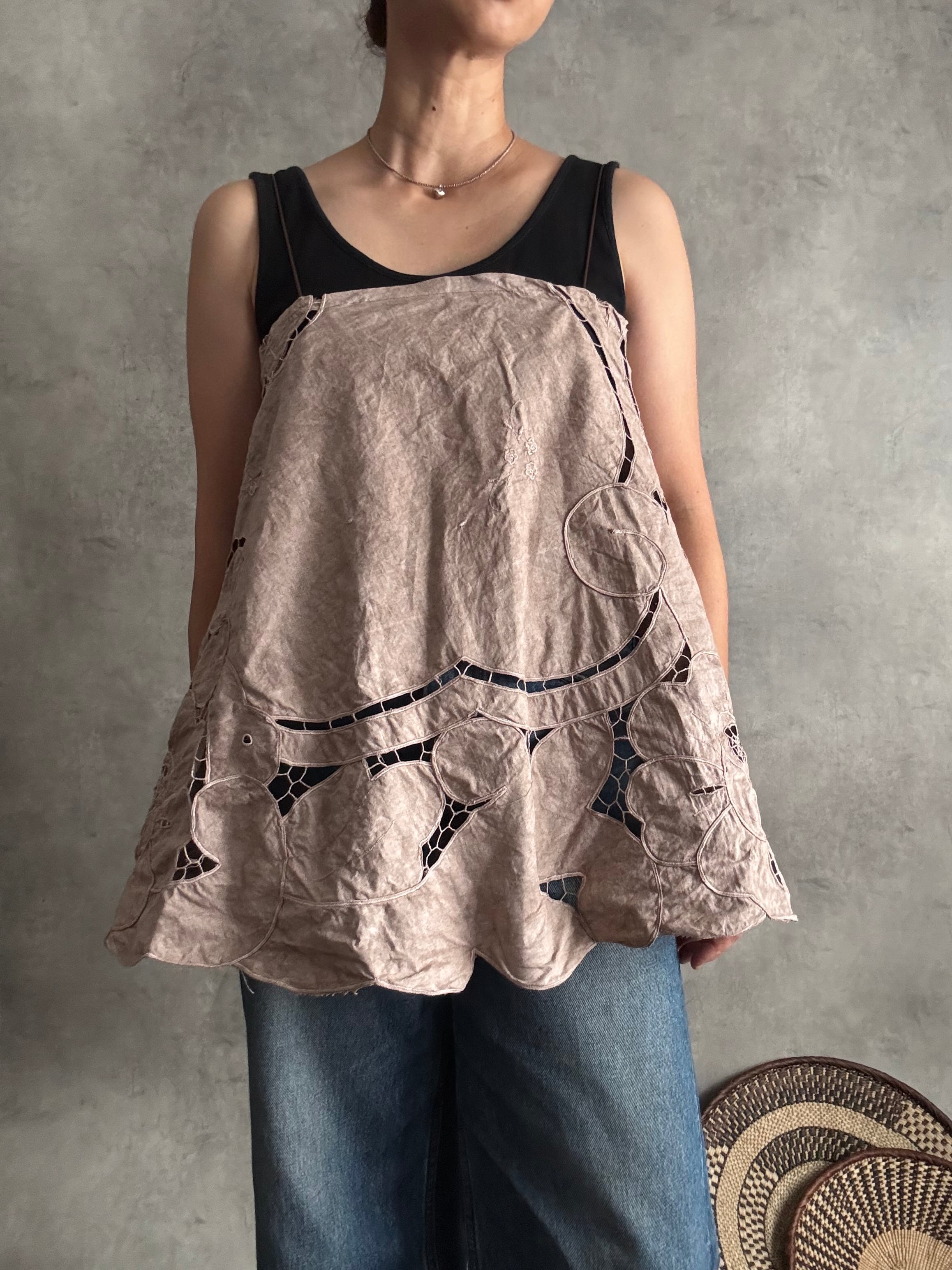 カットワークレースのラウンドキャミソール ブラウン