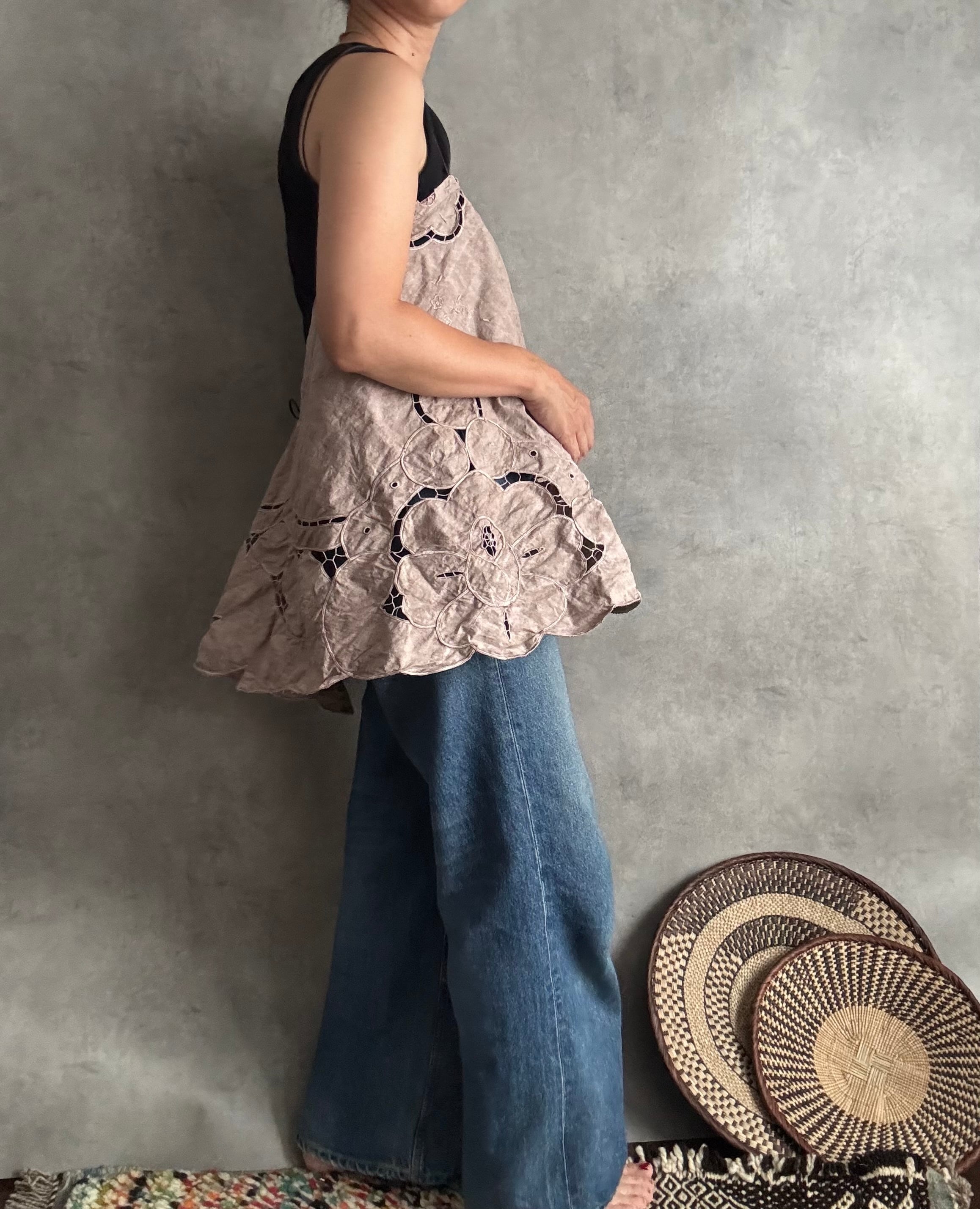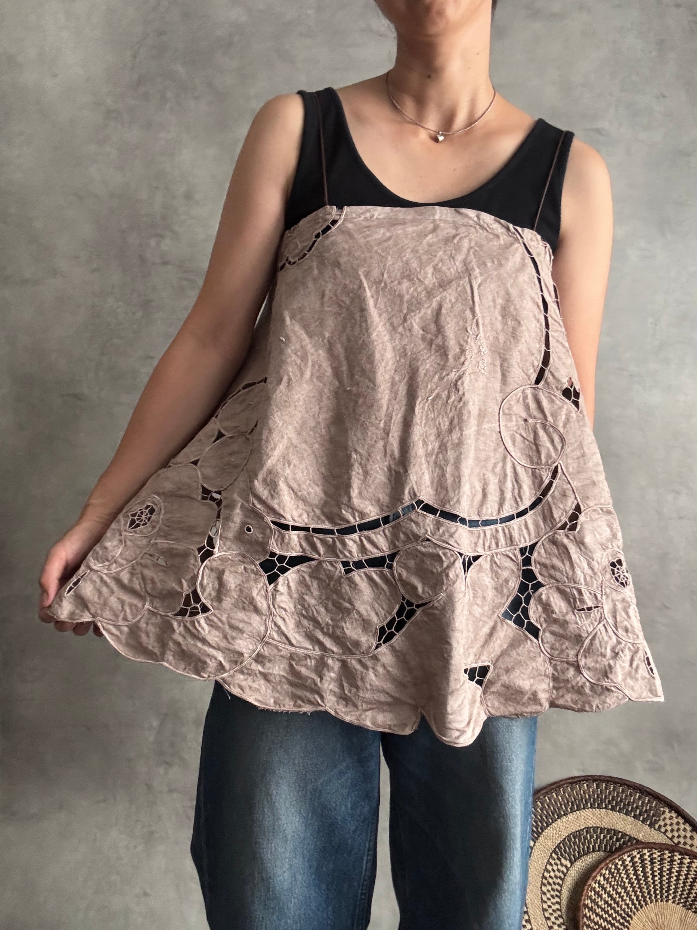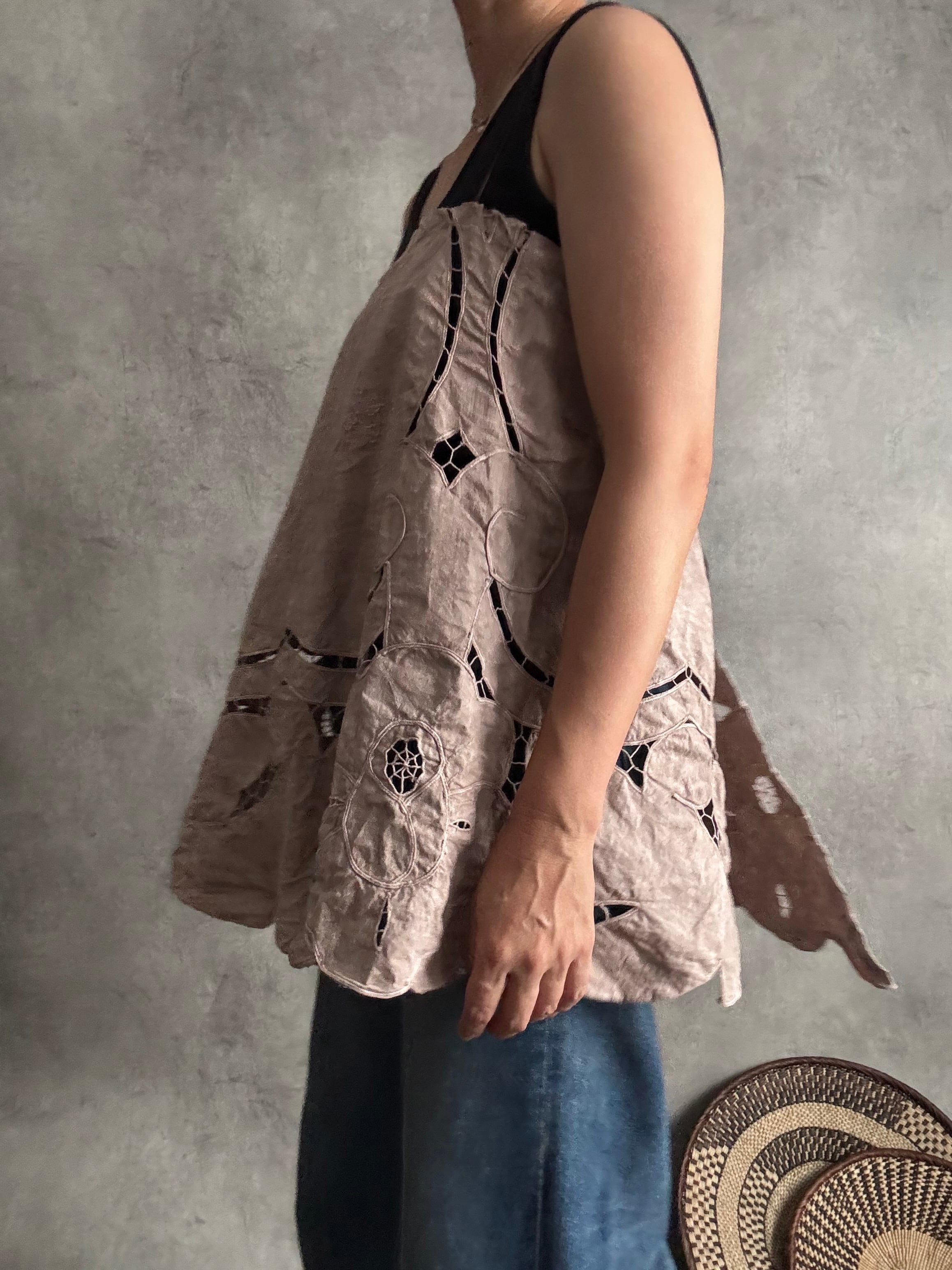 以前お作りした朝影ワンピースの残り布がきれいにラウンド型だったのでキャミに仕立てました!