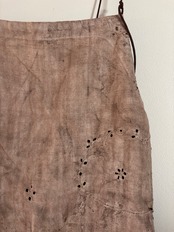 べんがら染めでブラウンに染めており、クロスの状態なのか、濃く染まった部分と薄く染まった部分でムラが出ています。(画像16.17枚目)