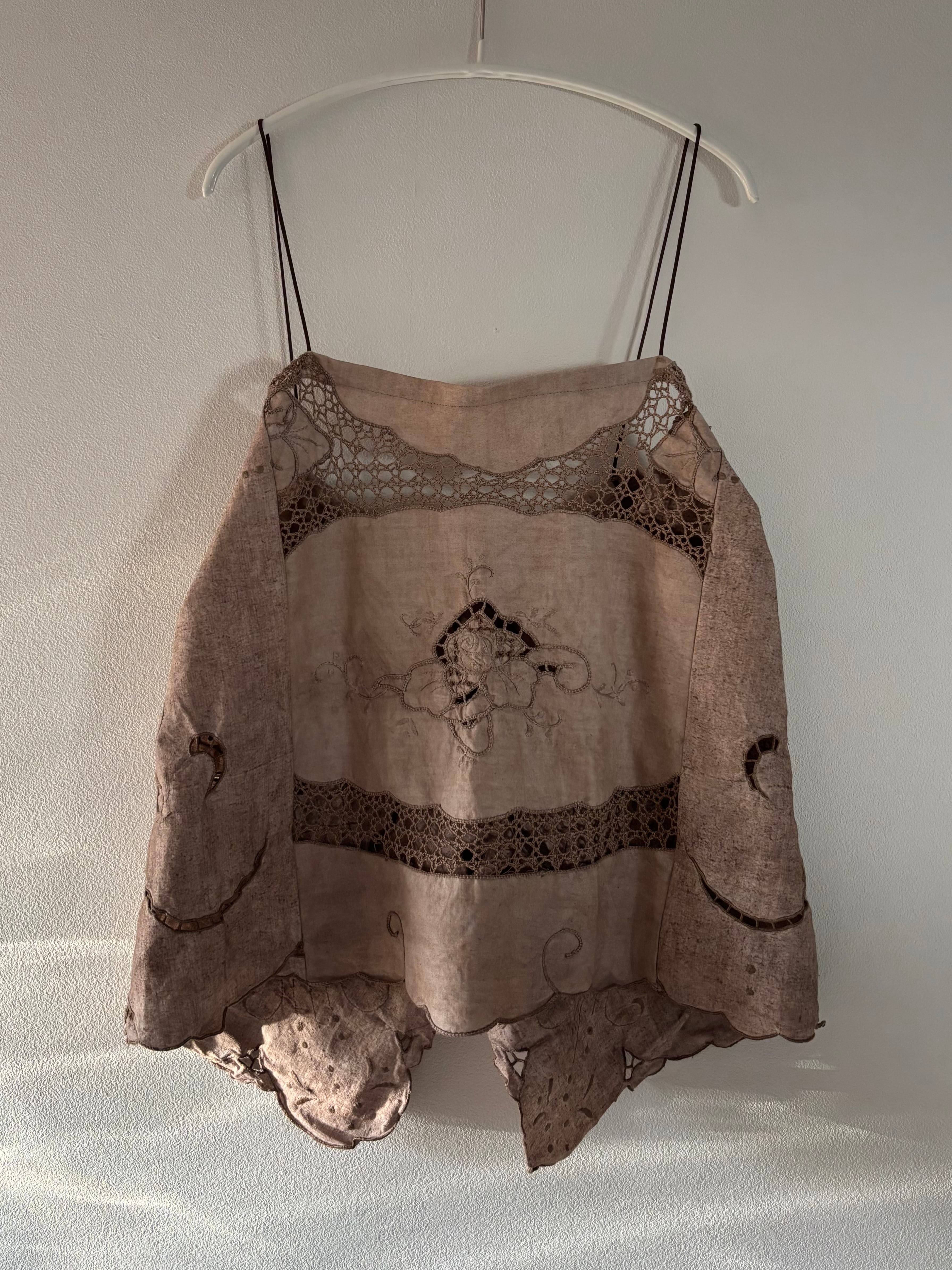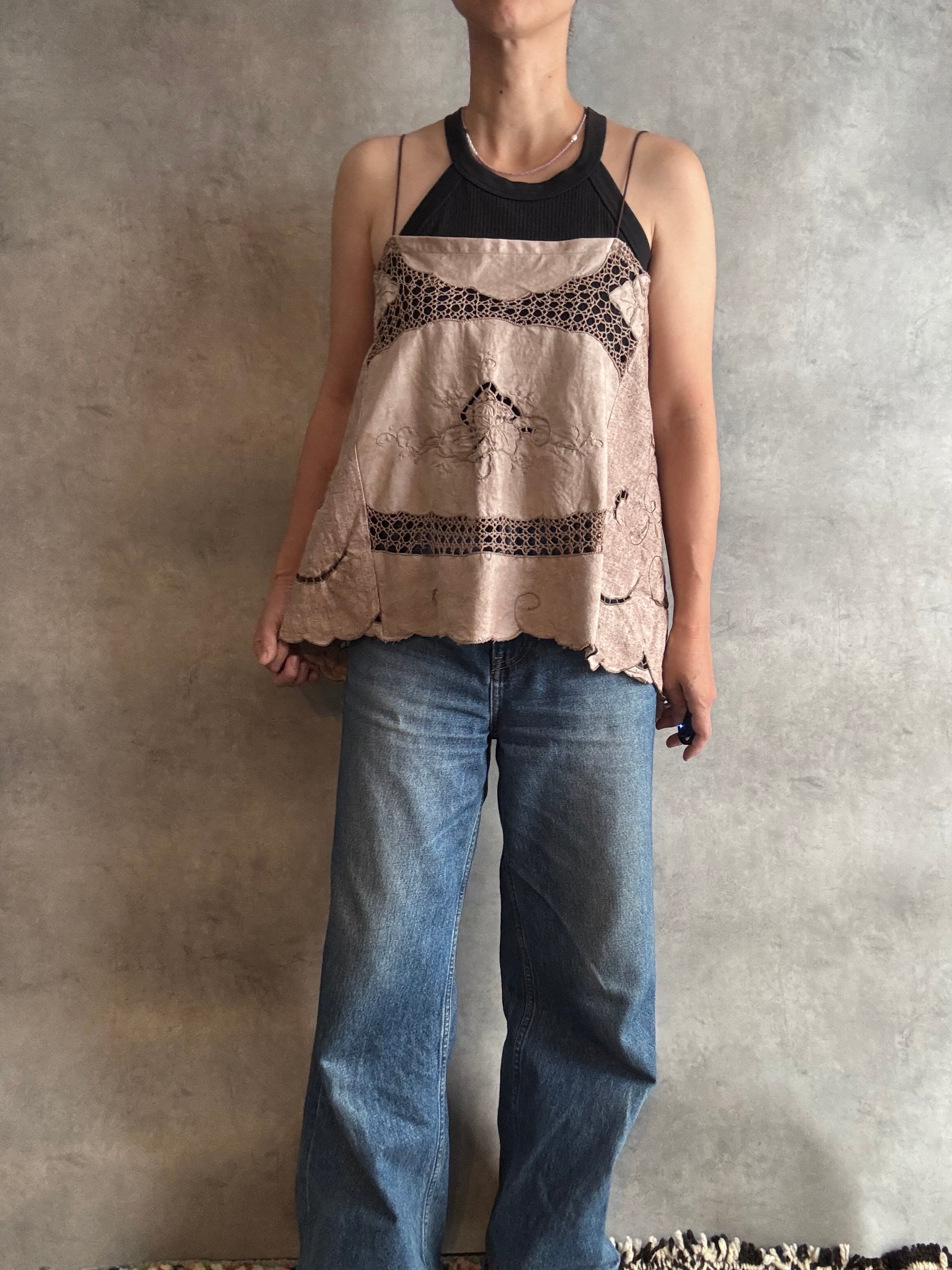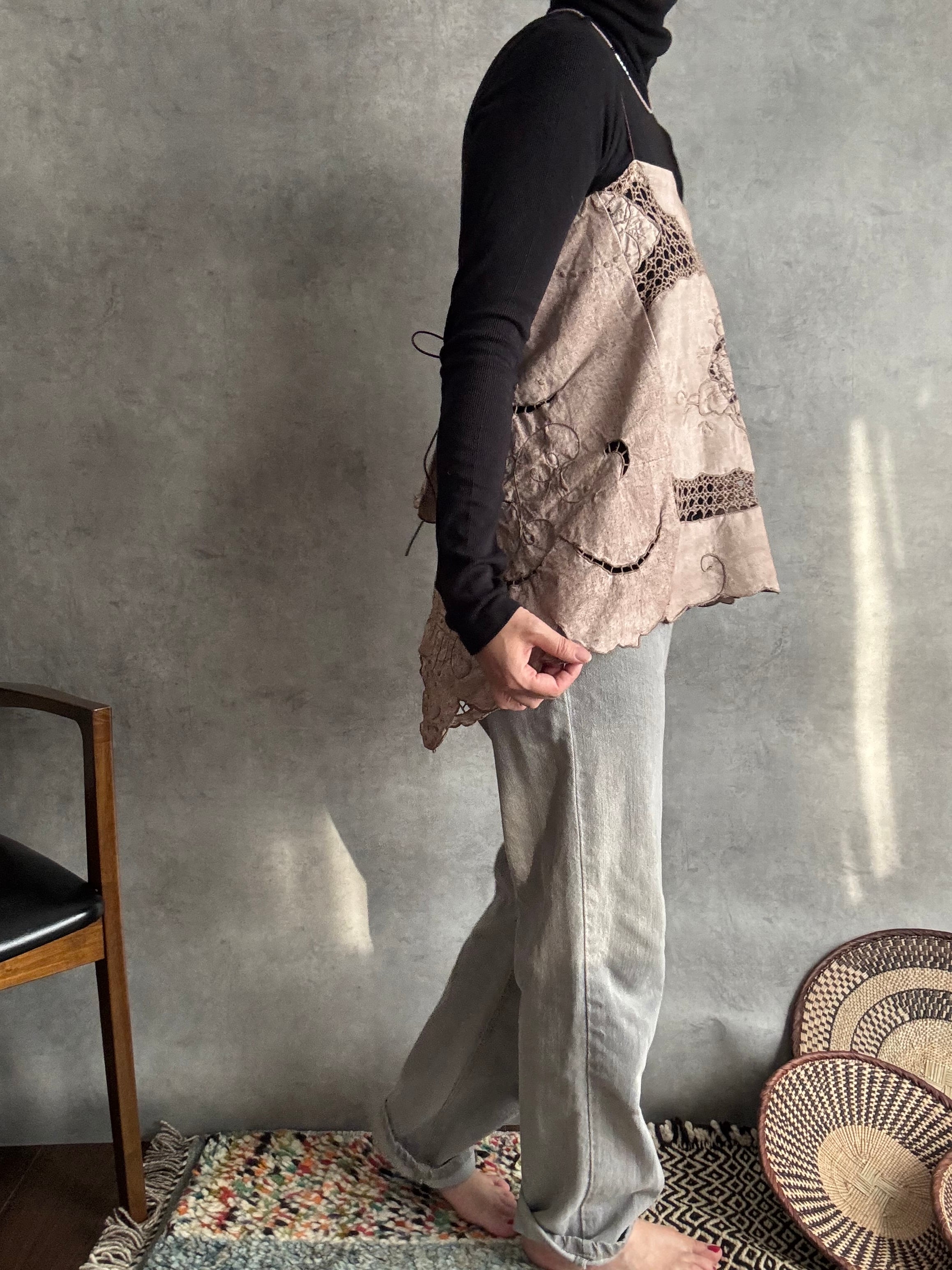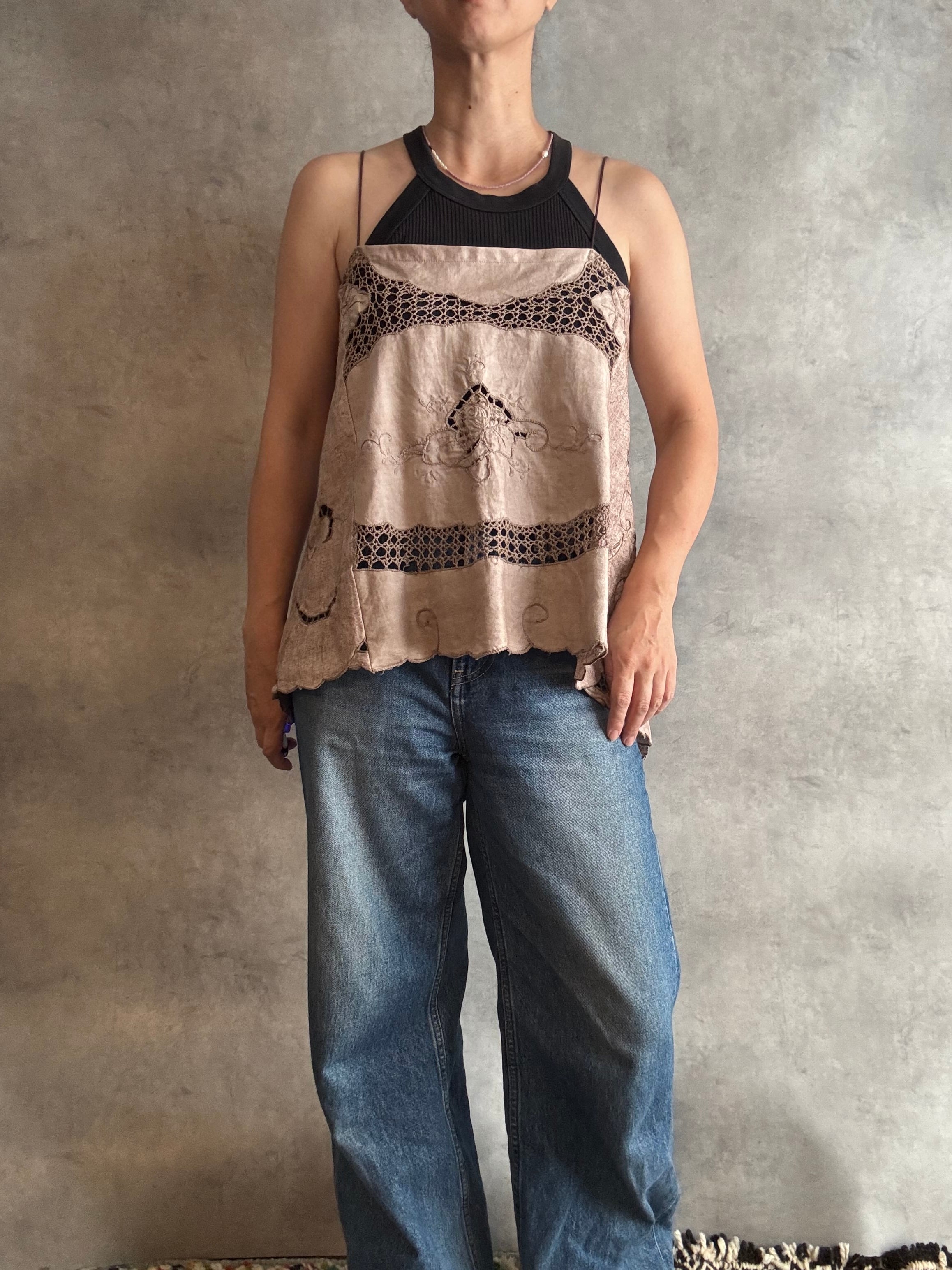 花刺繍レースとリネンの刺繍キャミソール ブラウン