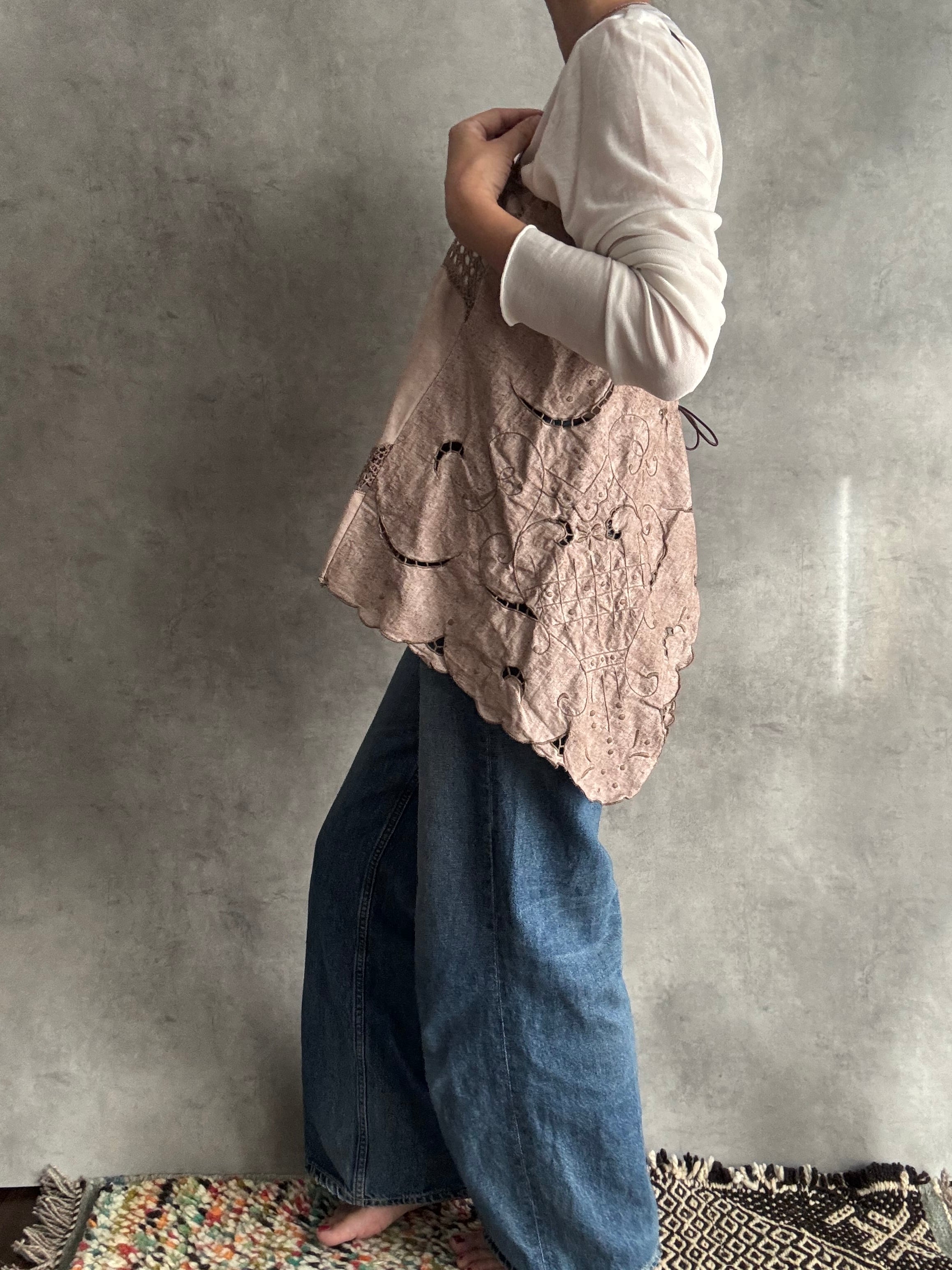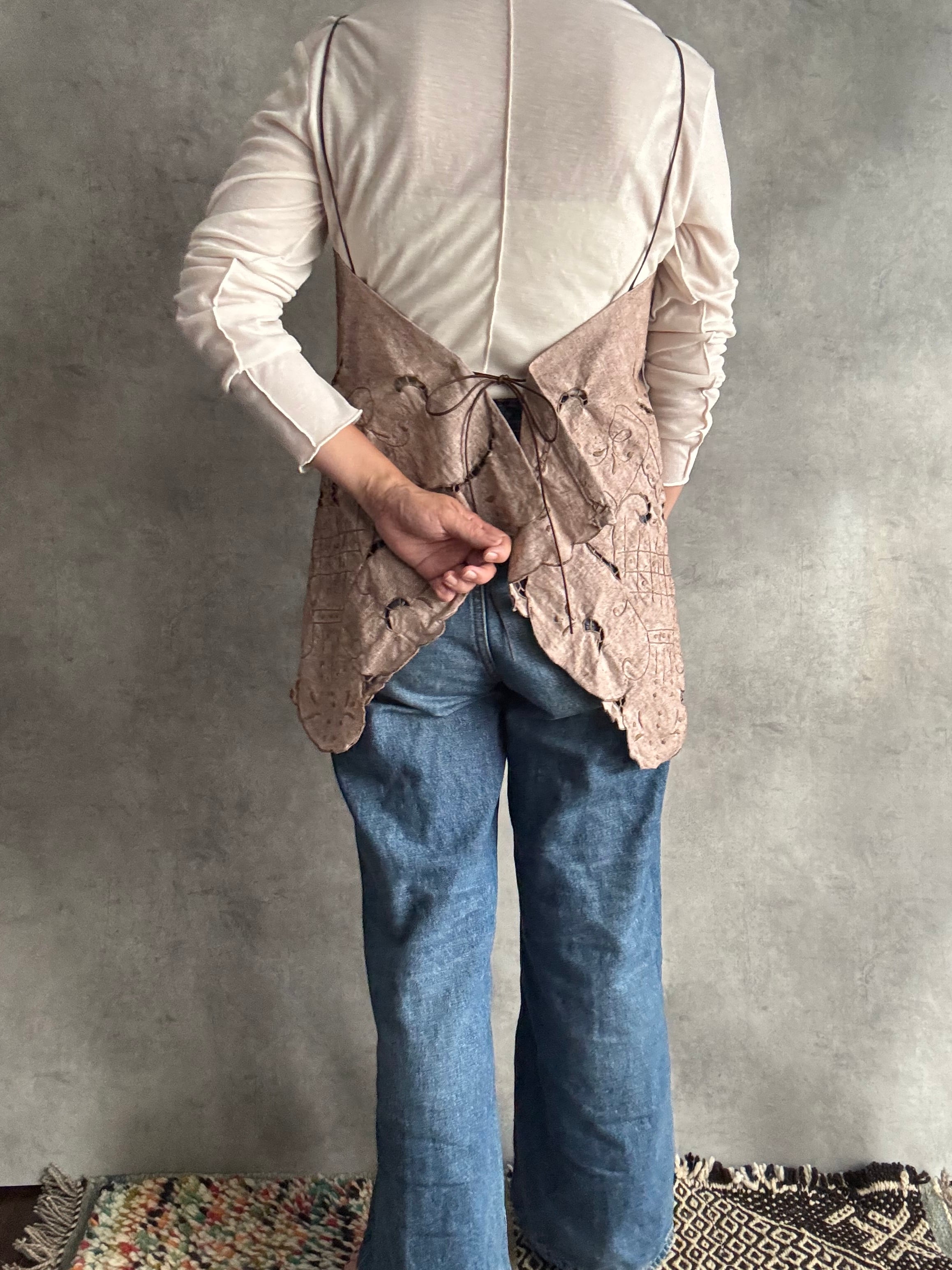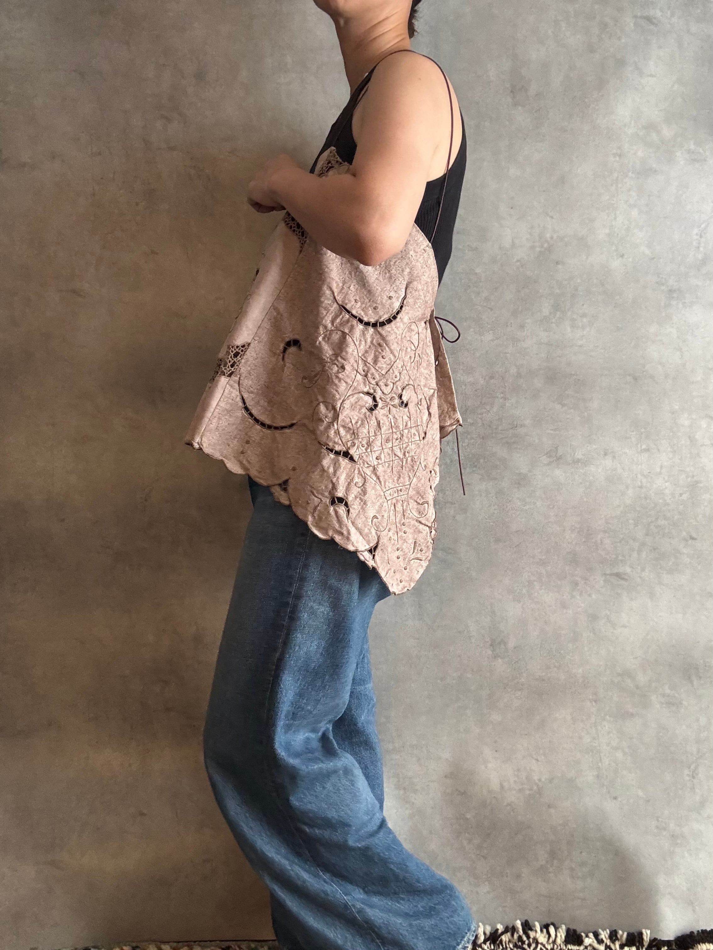 花刺繍レースとリネンの刺繍キャミソール ブラウン