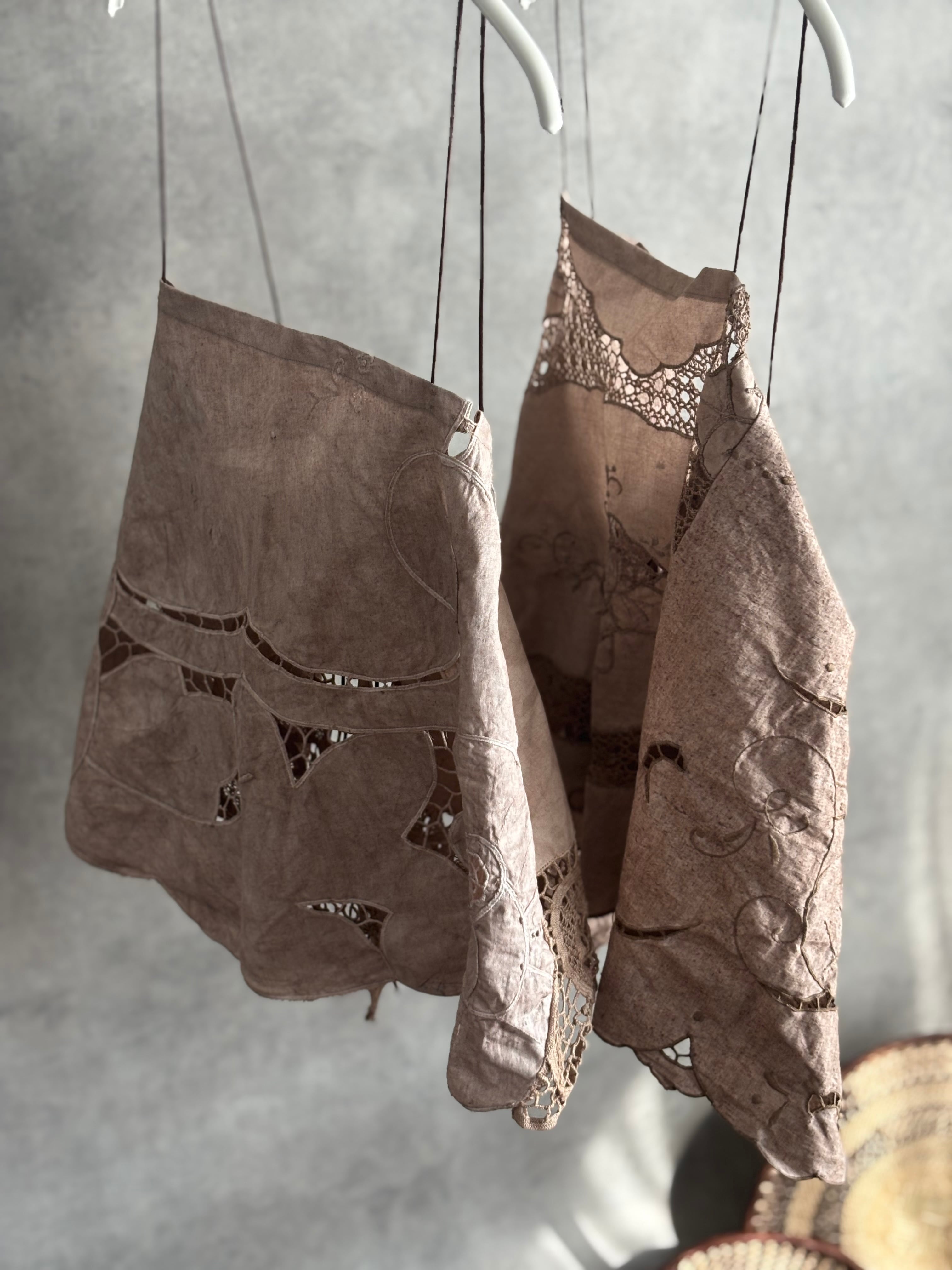 アイボリーにグレーの花刺繍とレースのクロスと真っ白のリネン生地にカーキの植物柄のようなスカラップのクロスを組み合わせたキャミソール。