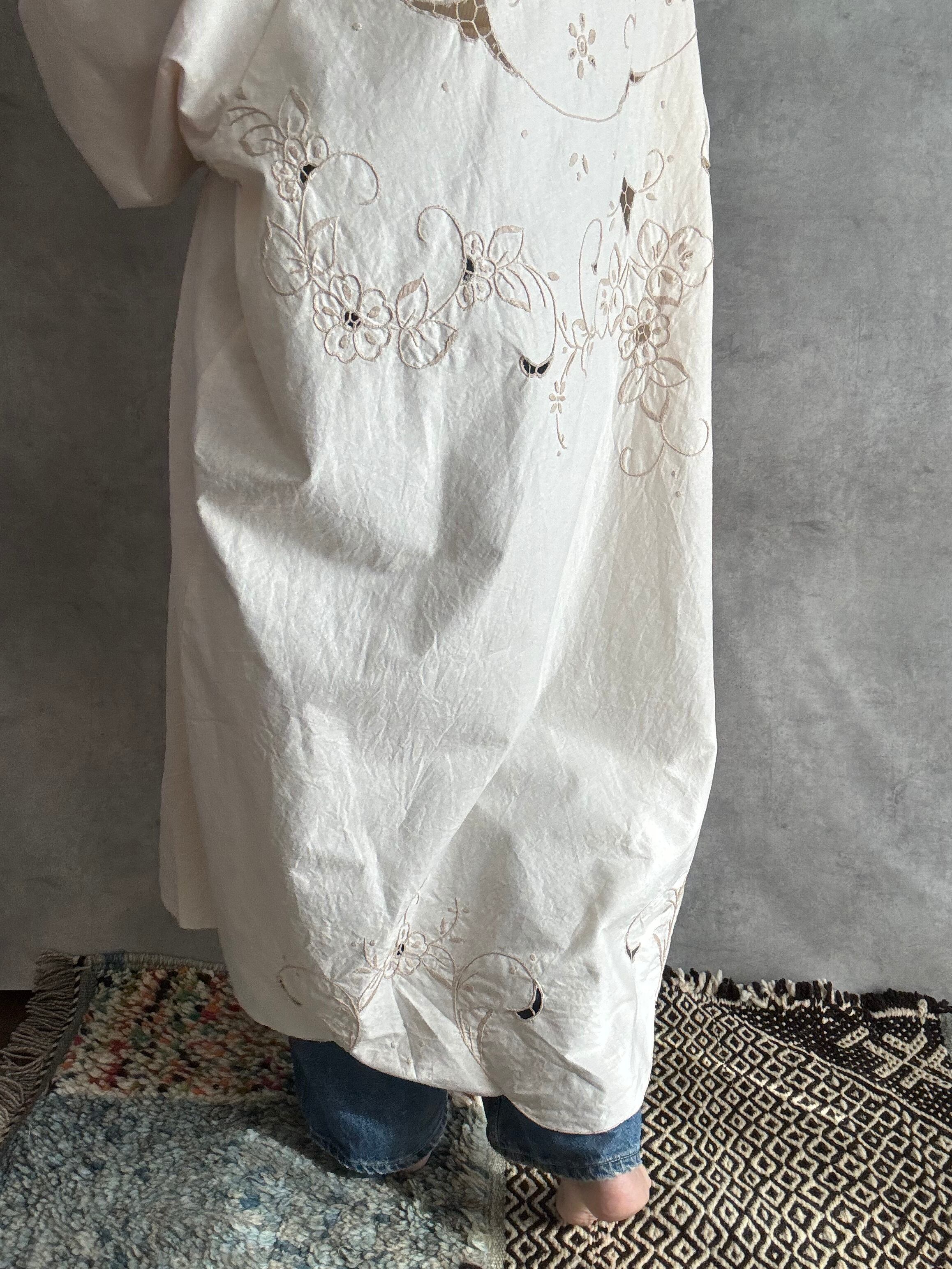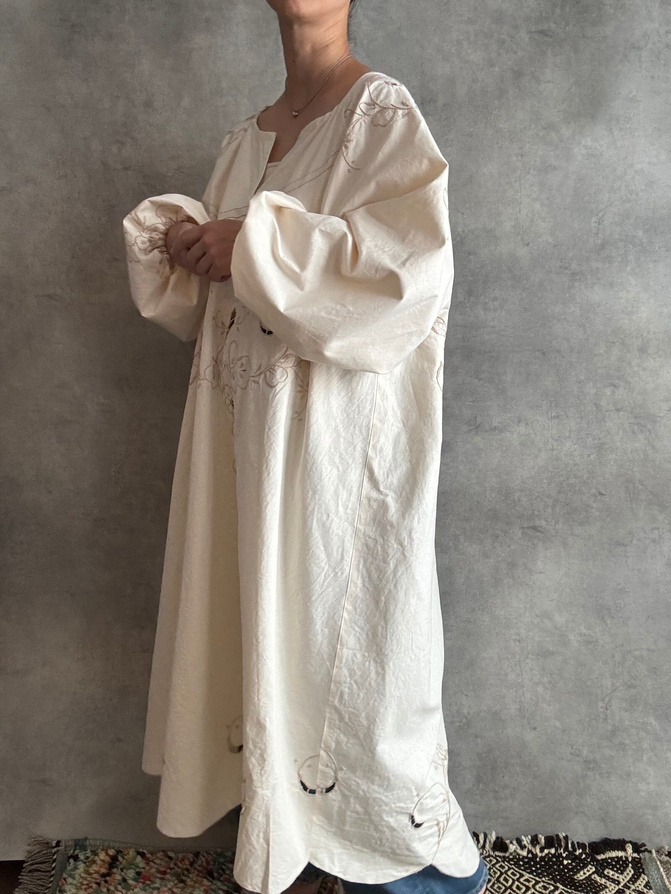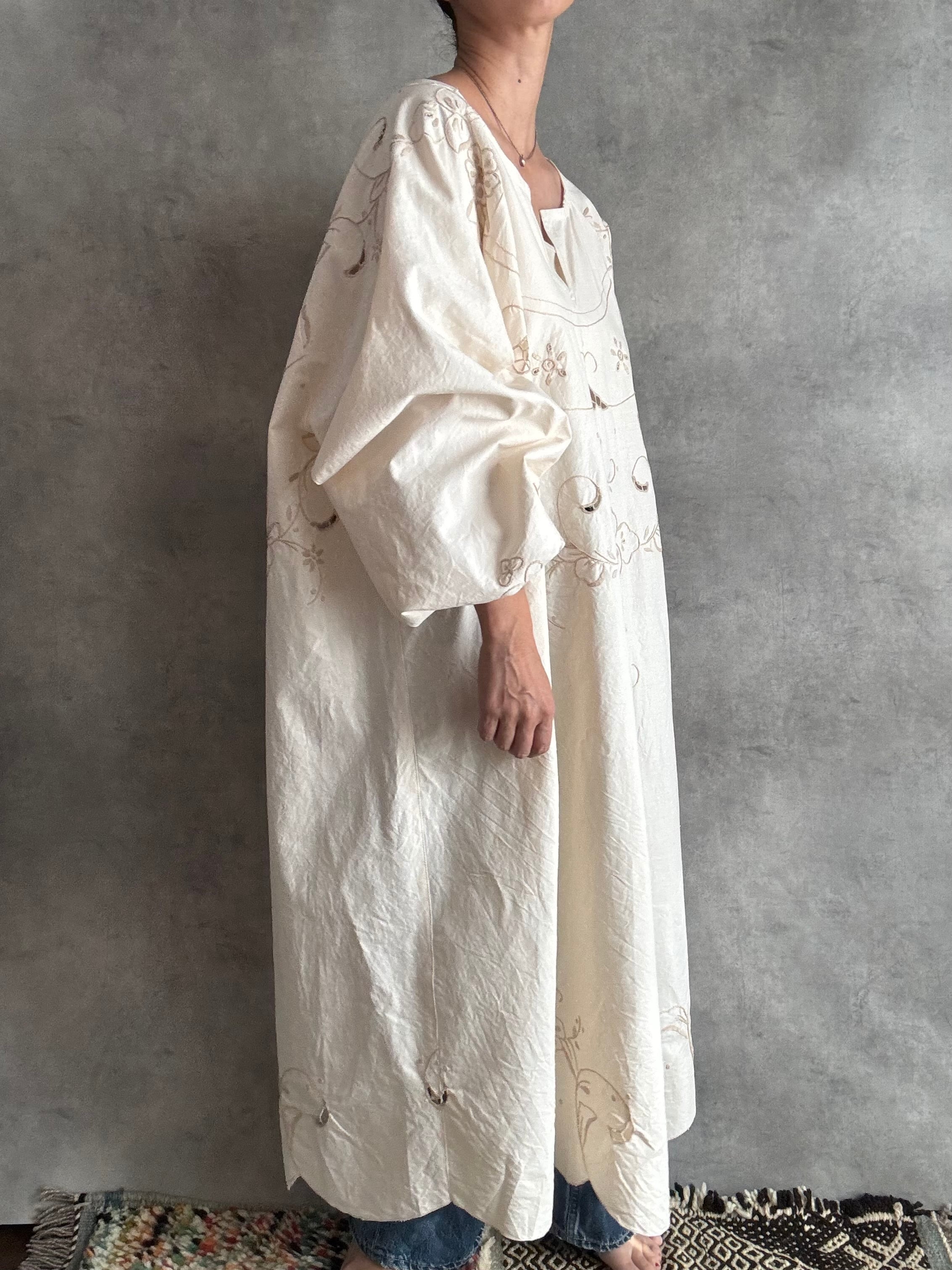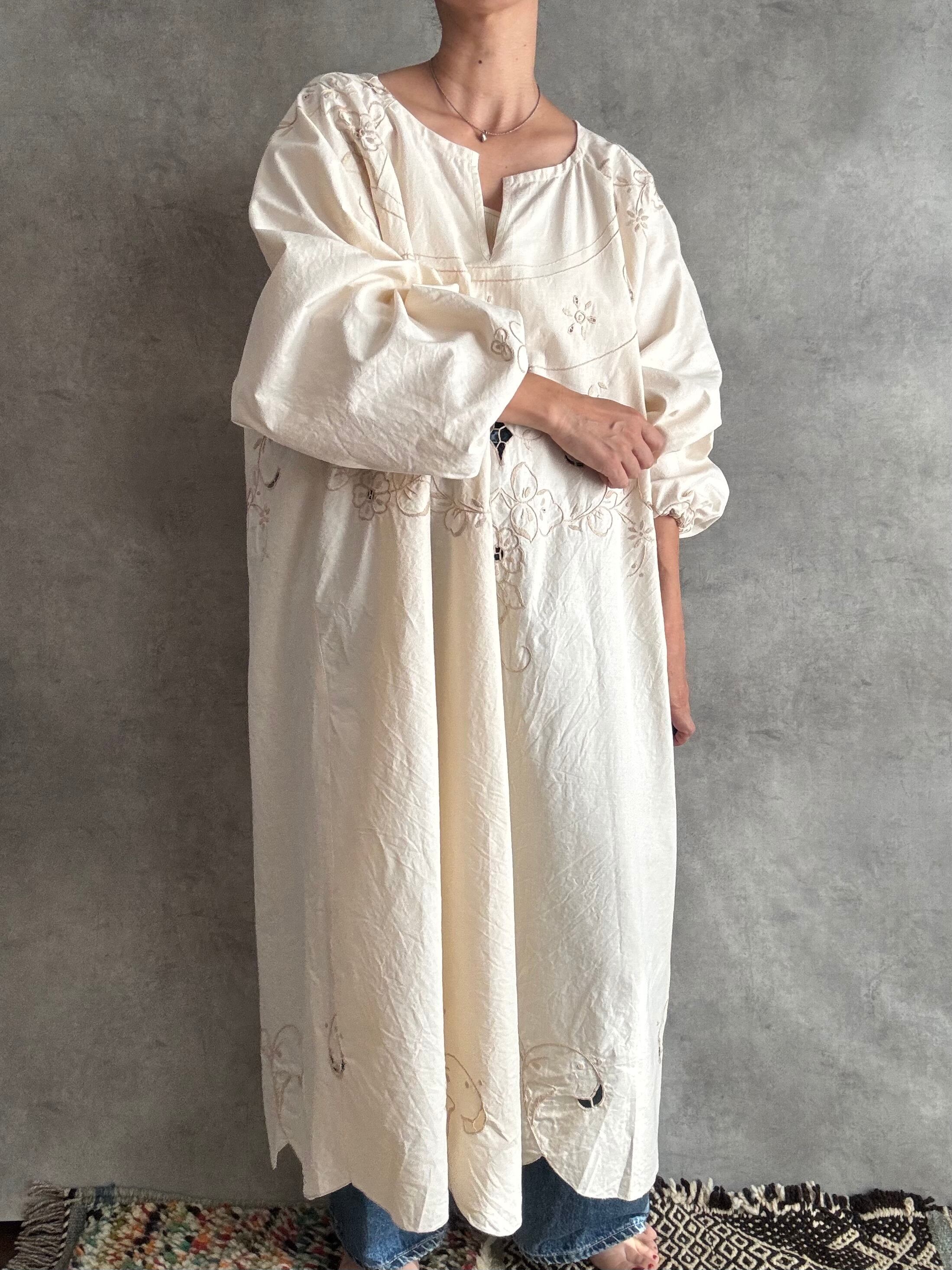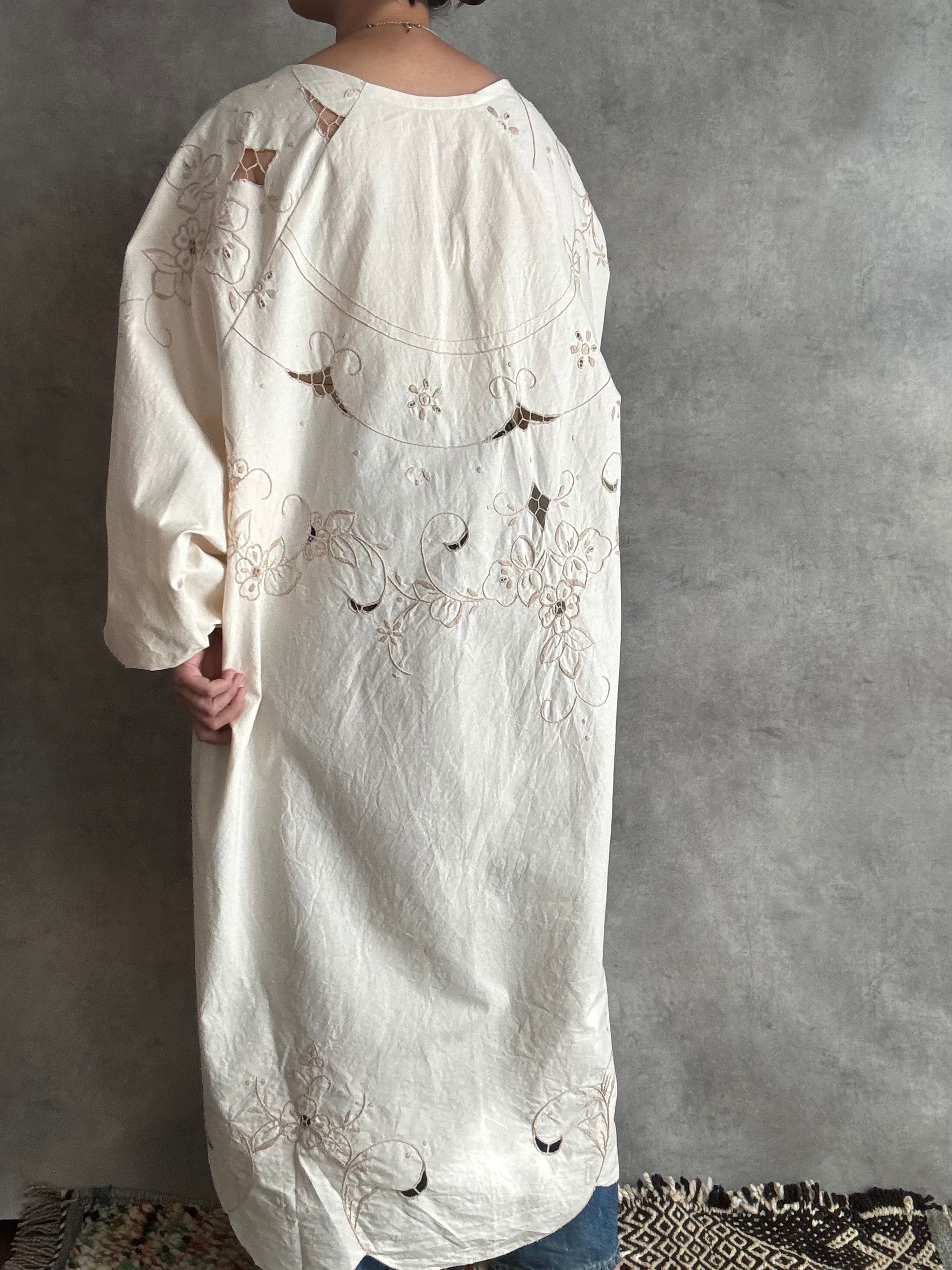 透かしのようなレースがところどころに入っていて、袖口や肩に刺繍がくるよう配置にもこだわって裁断しました。