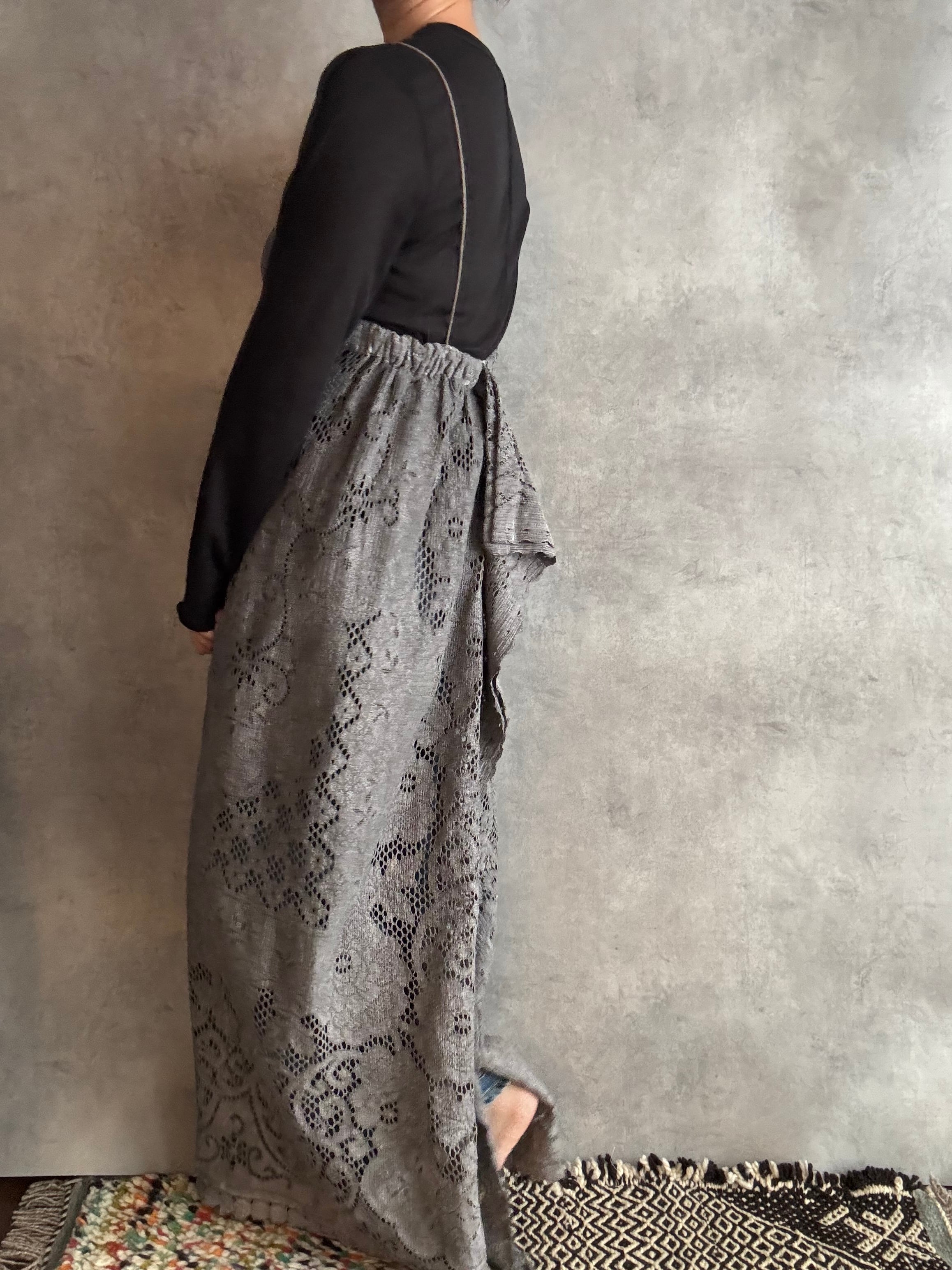 アイボリーと淡いグリーンの糸で作られたレースをべんがら染めでスミクロに染めたことで絶妙な色合いに染まり、可愛いすぎない仕上がりになりました!