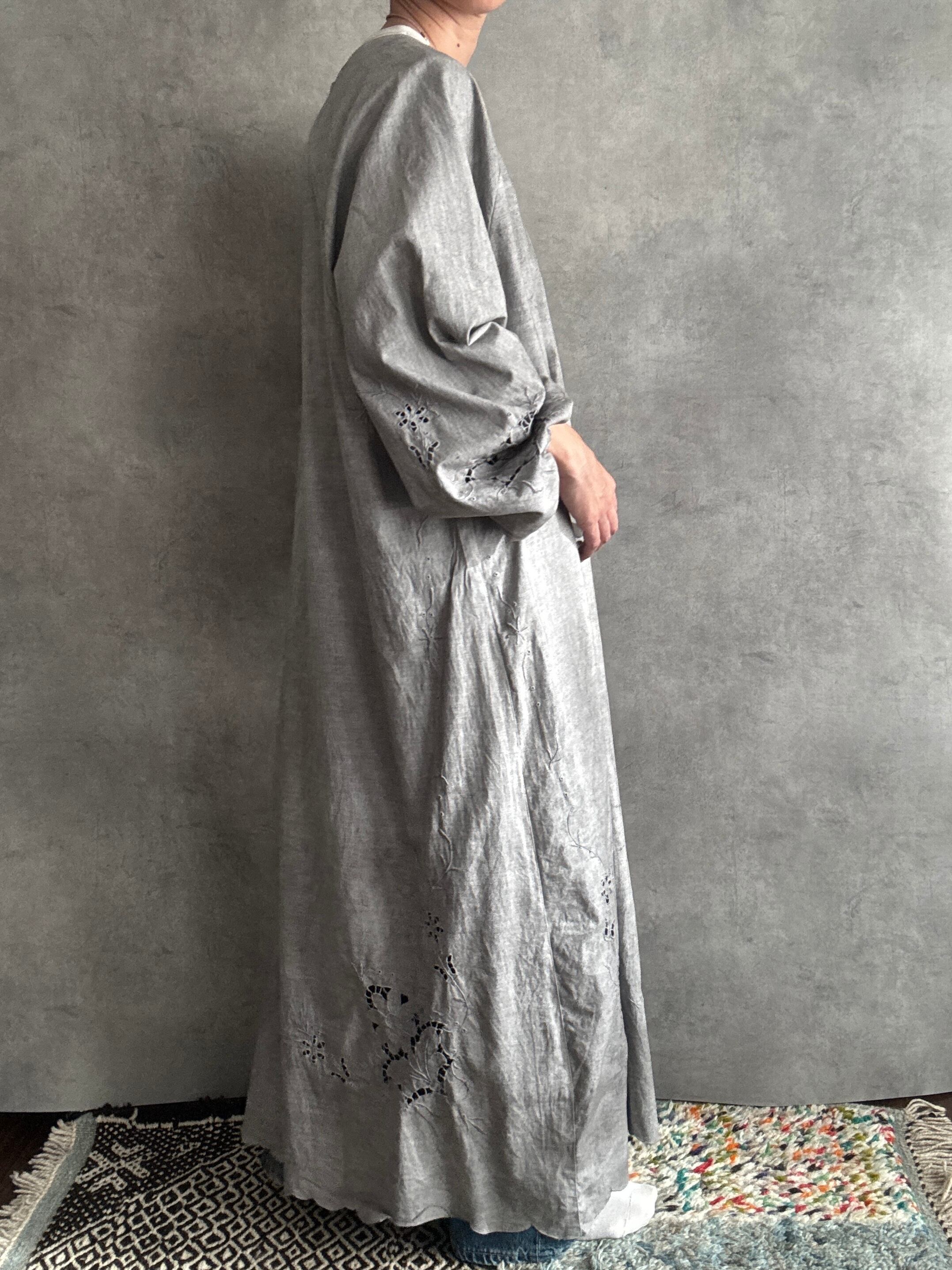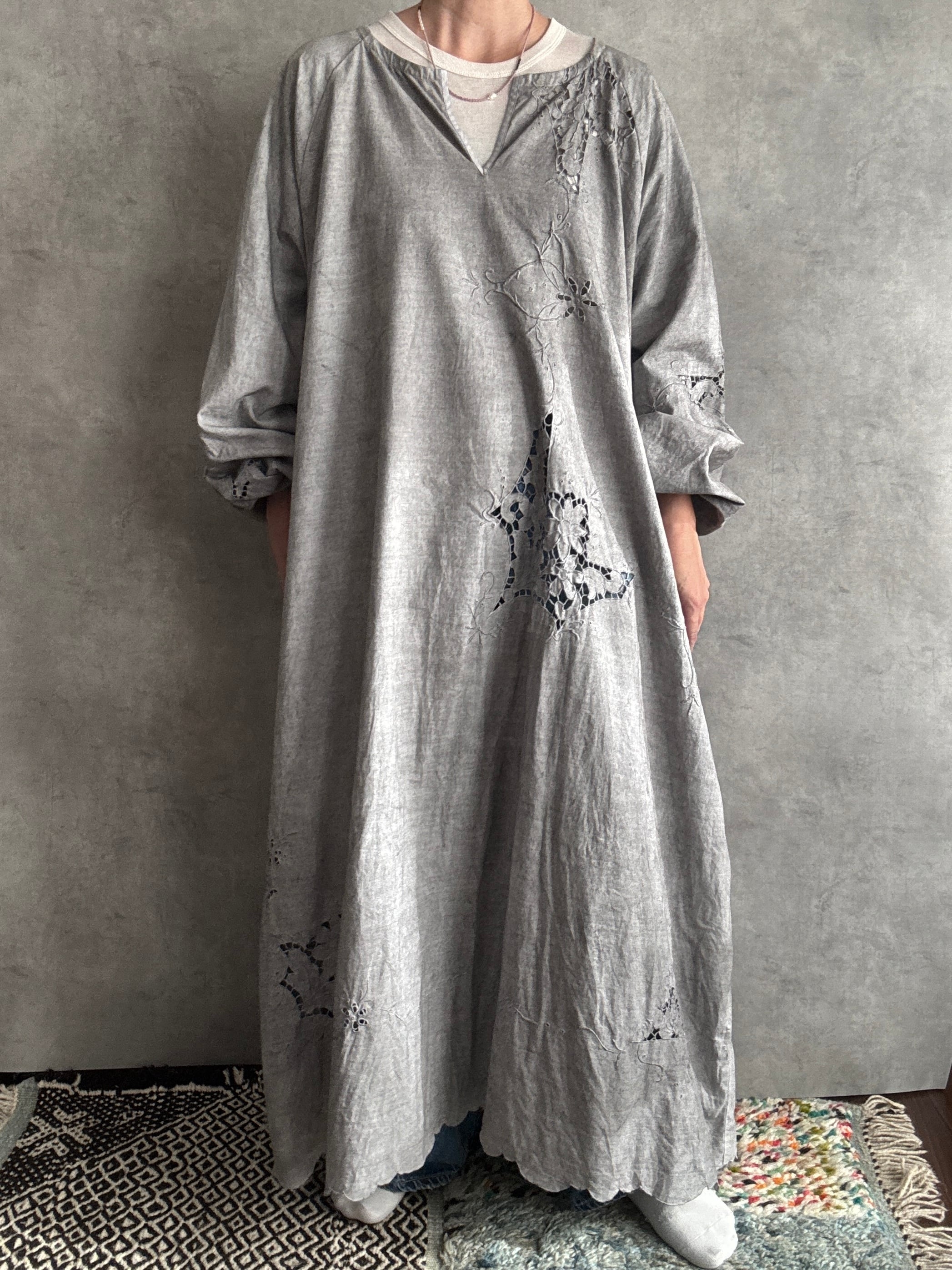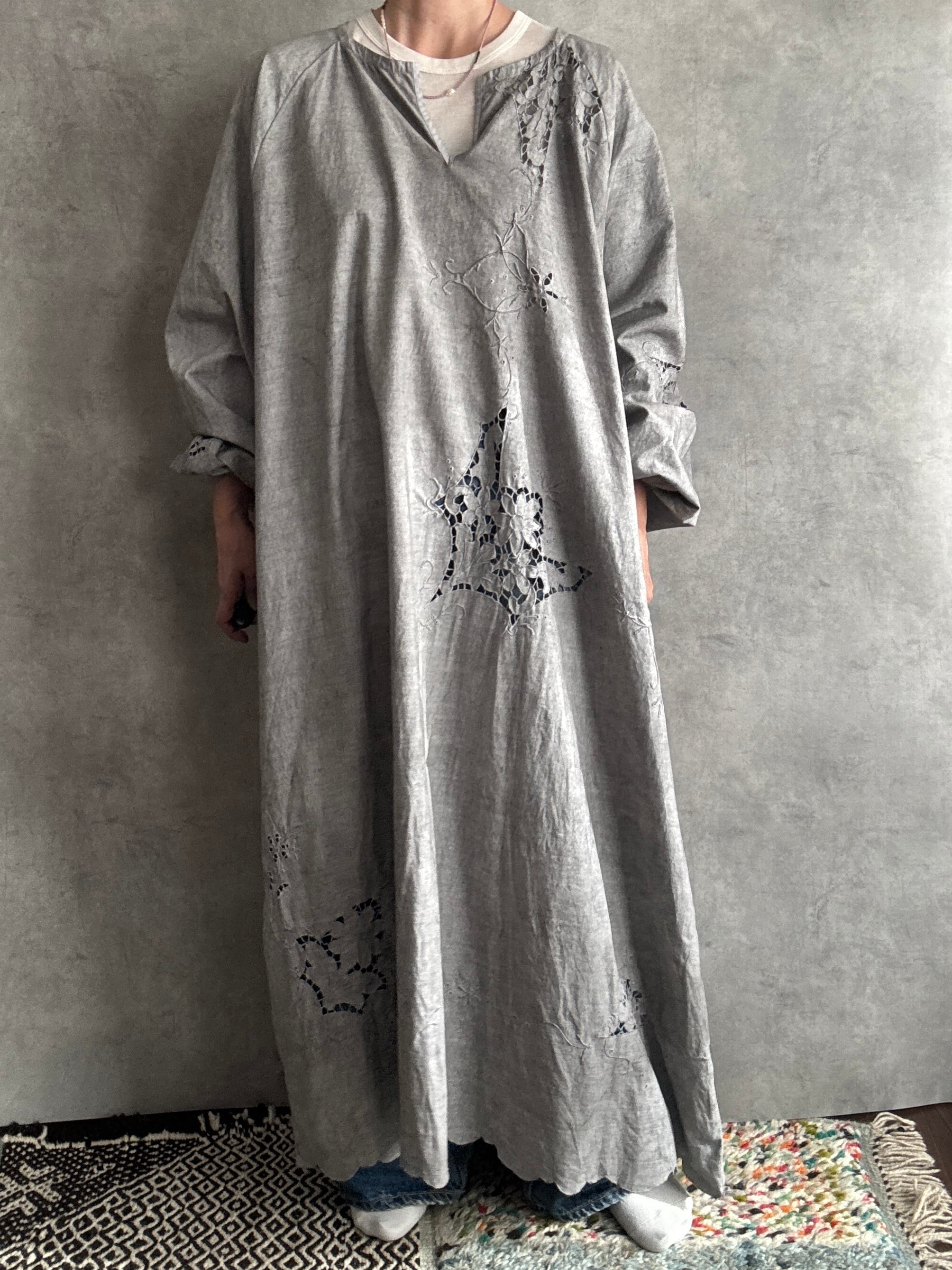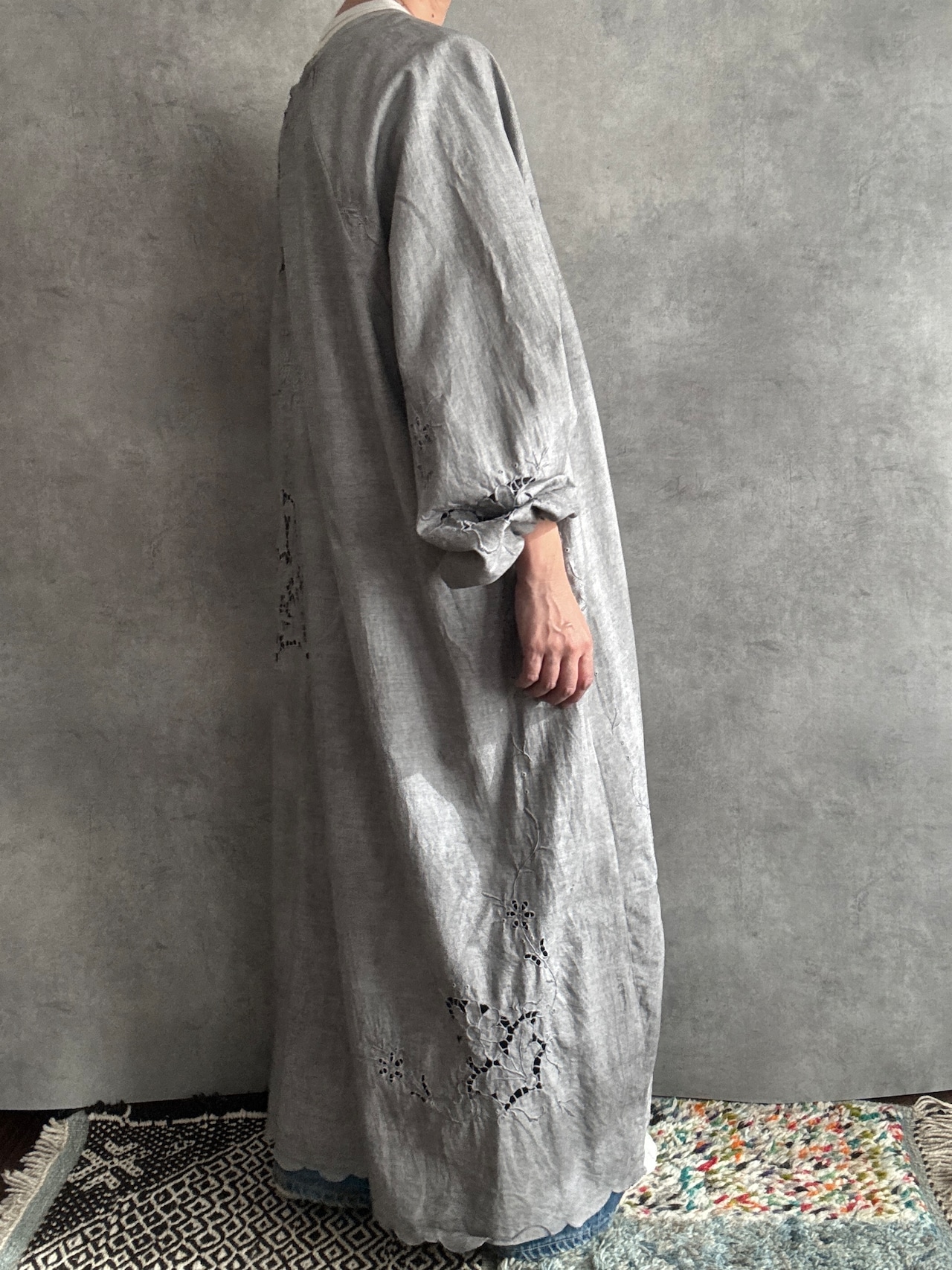 べんがら染めの深いグレーに、カットワーク刺繍が静かに浮かび上がるワンピース。