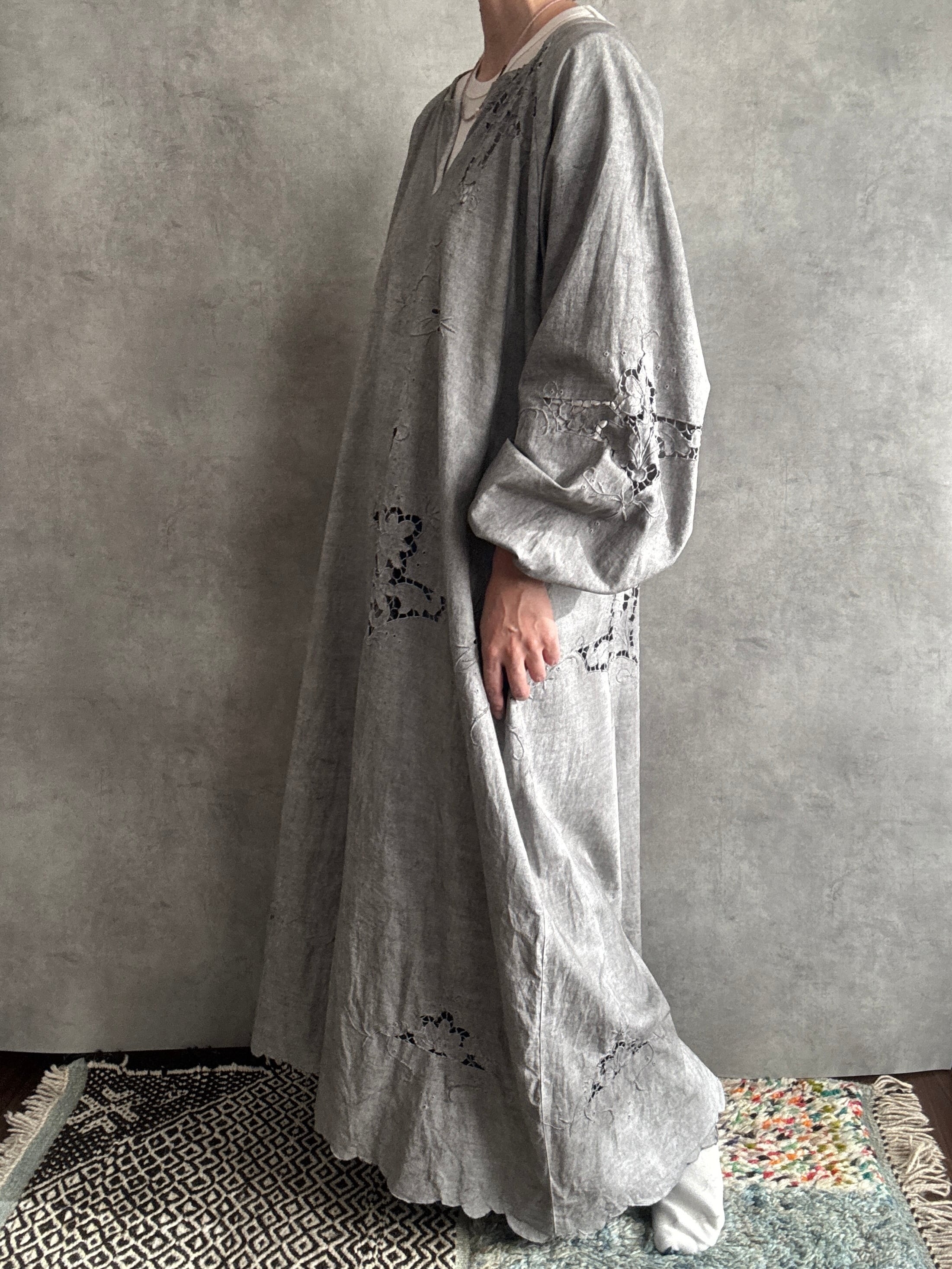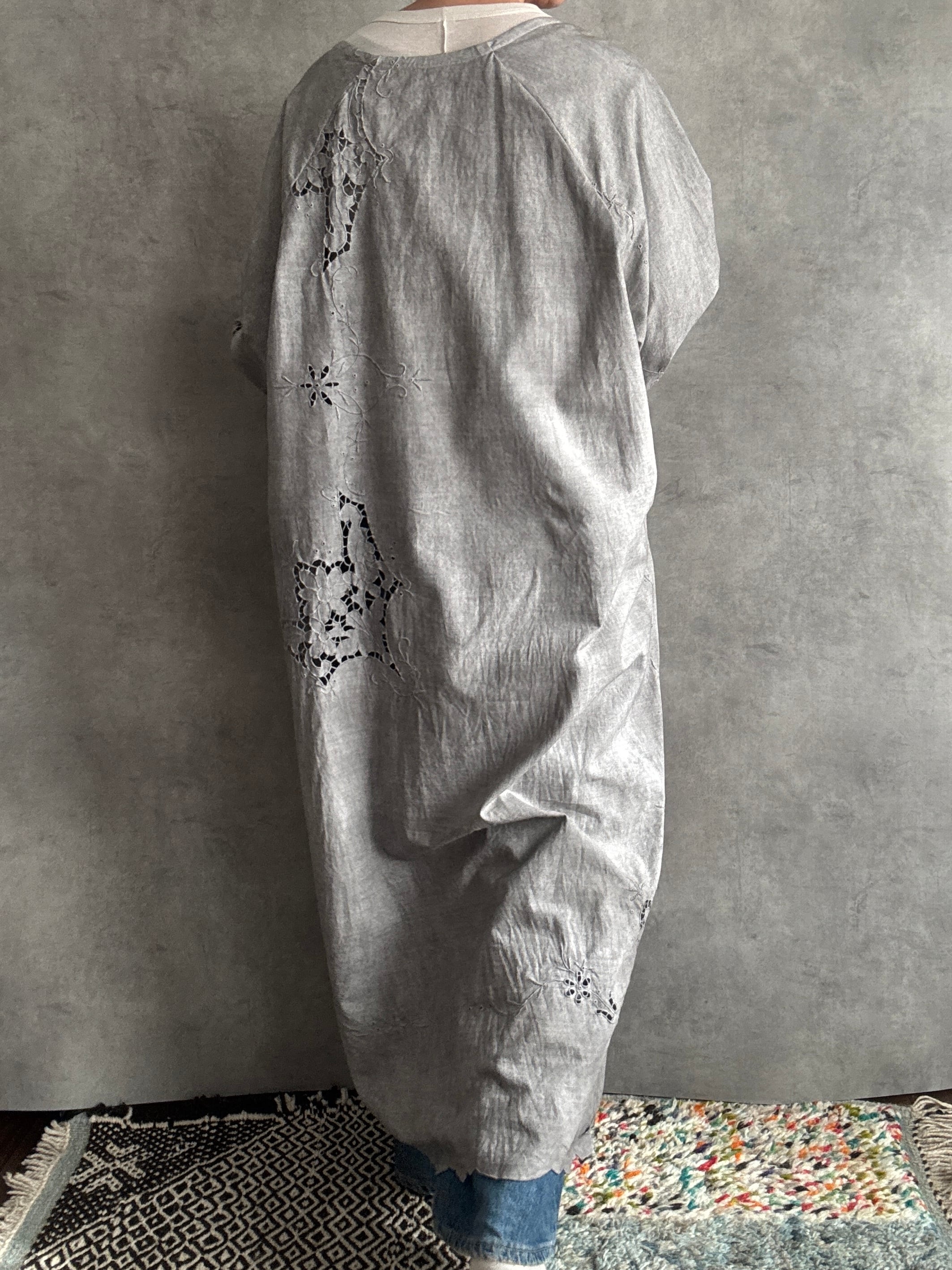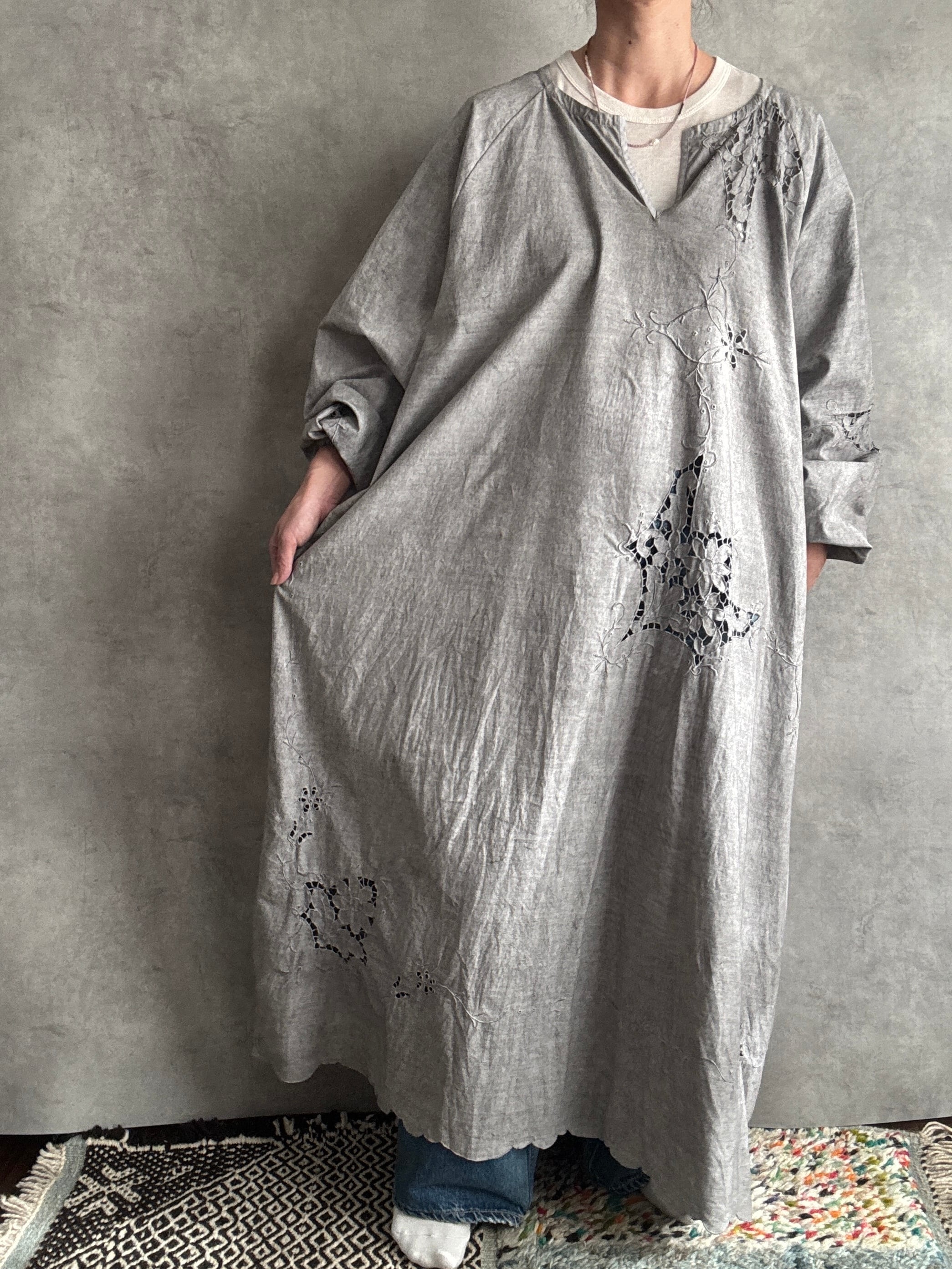べんがら染めの深いグレーに、カットワーク刺繍が静かに浮かび上がるワンピース。