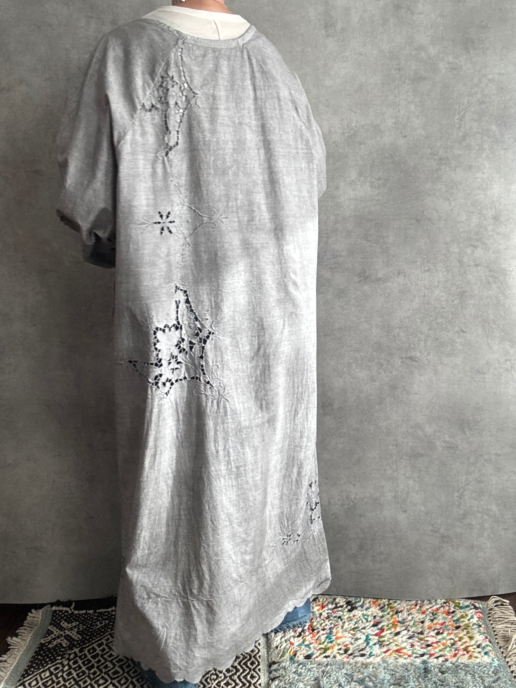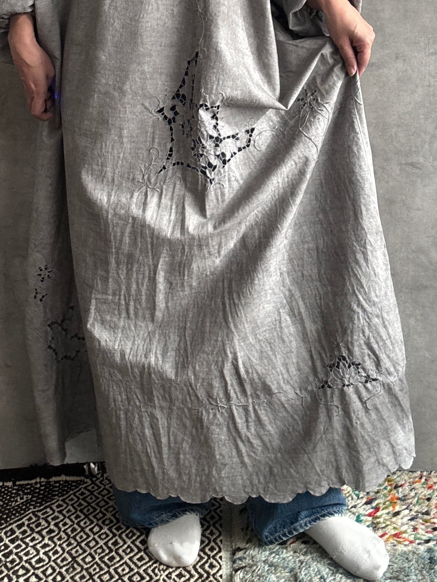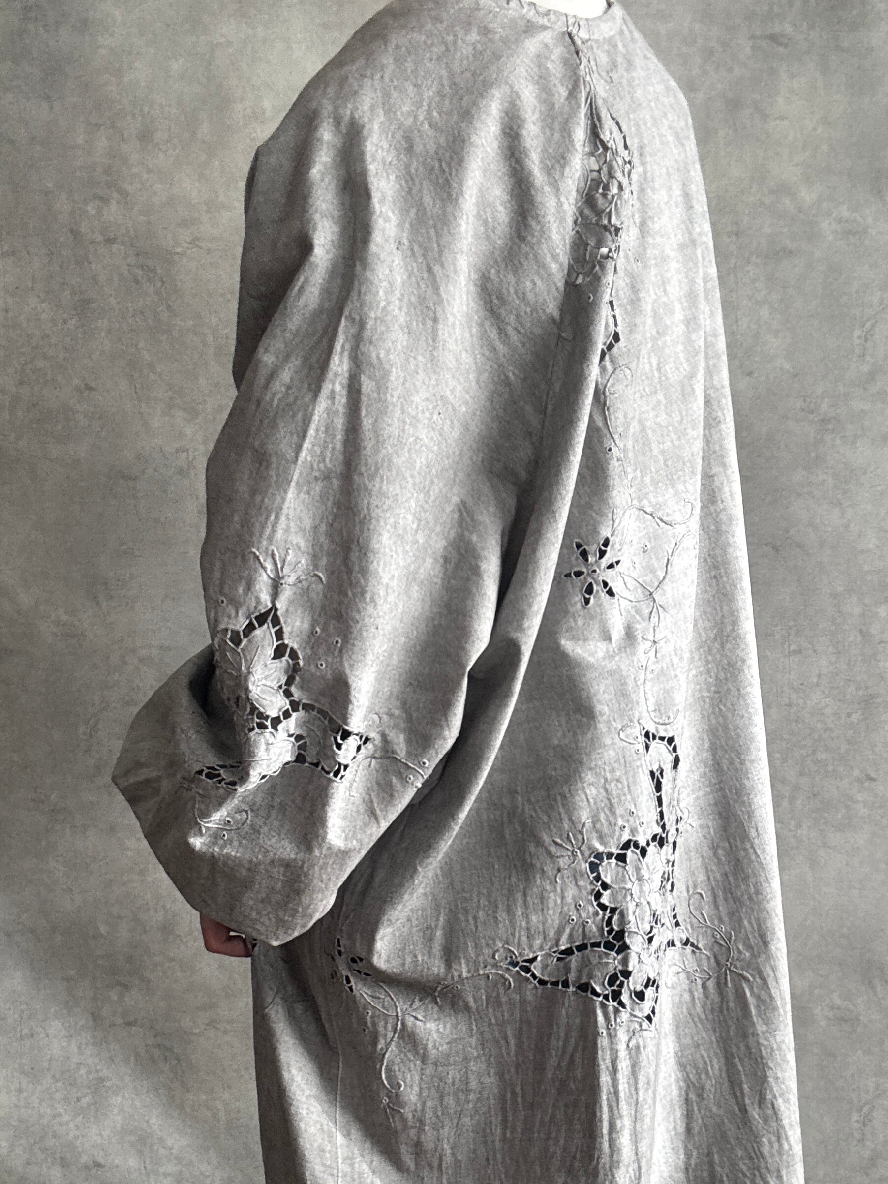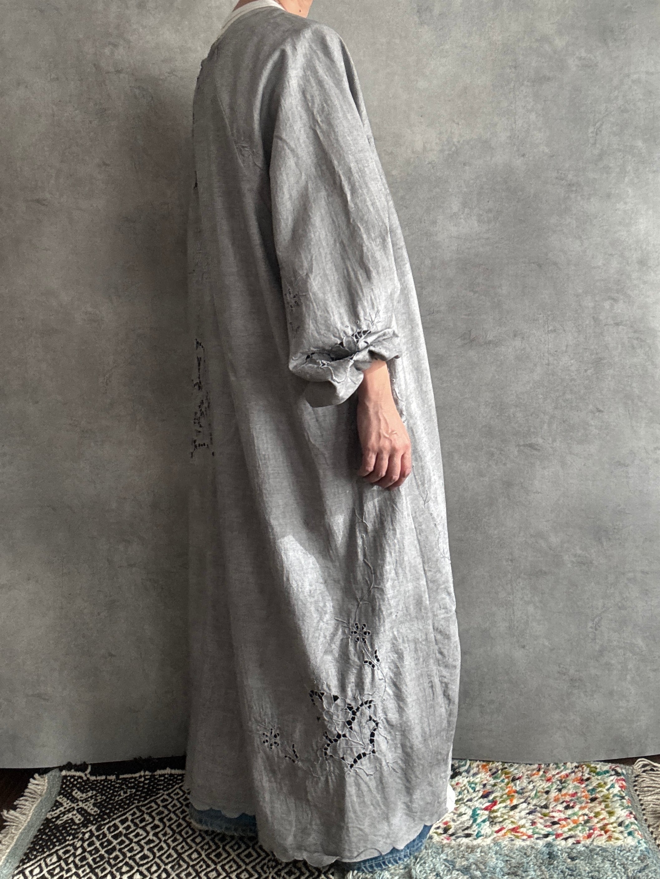 べんがら染めの深いグレーに、カットワーク刺繍が静かに浮かび上がるワンピース。
