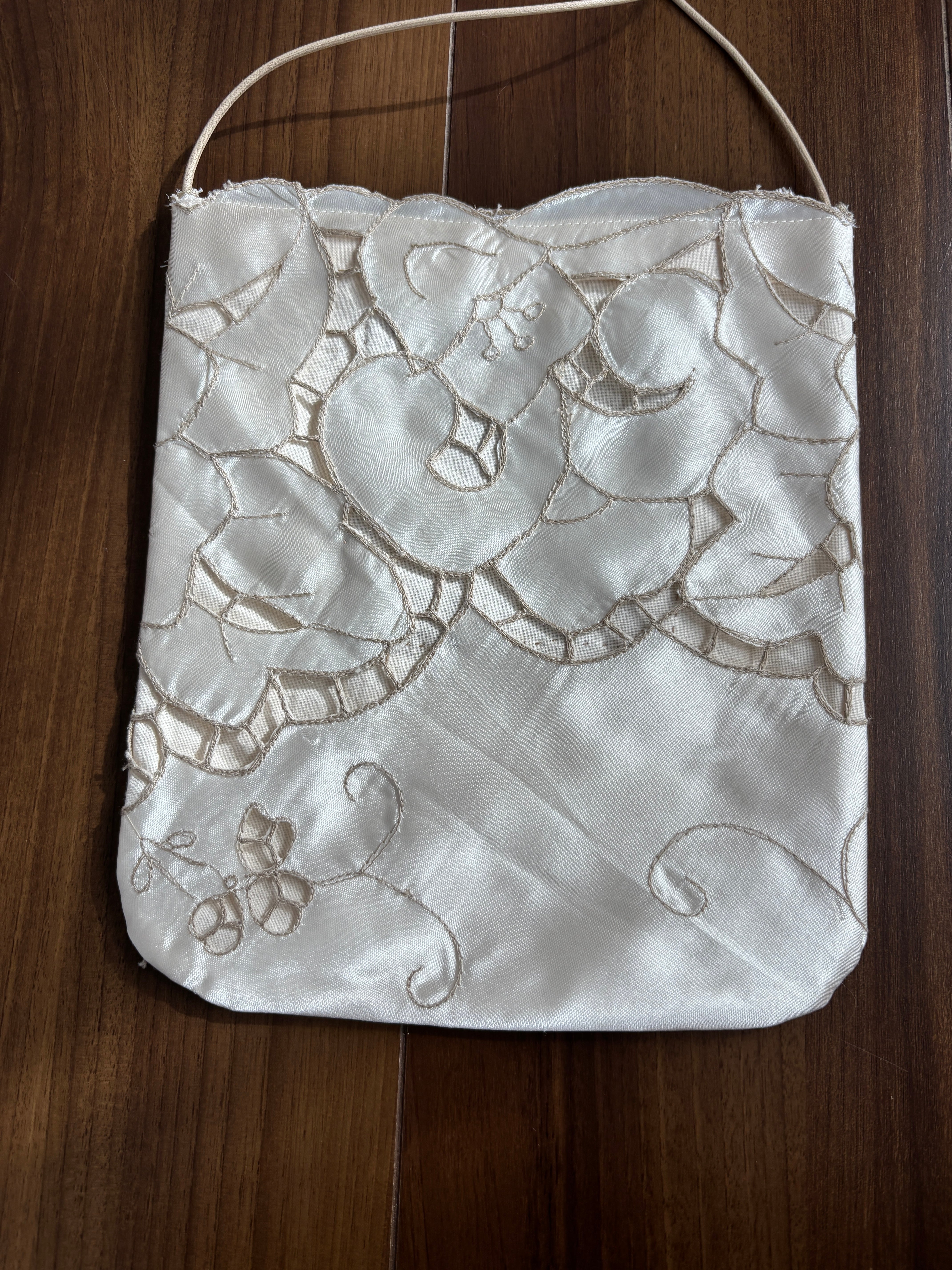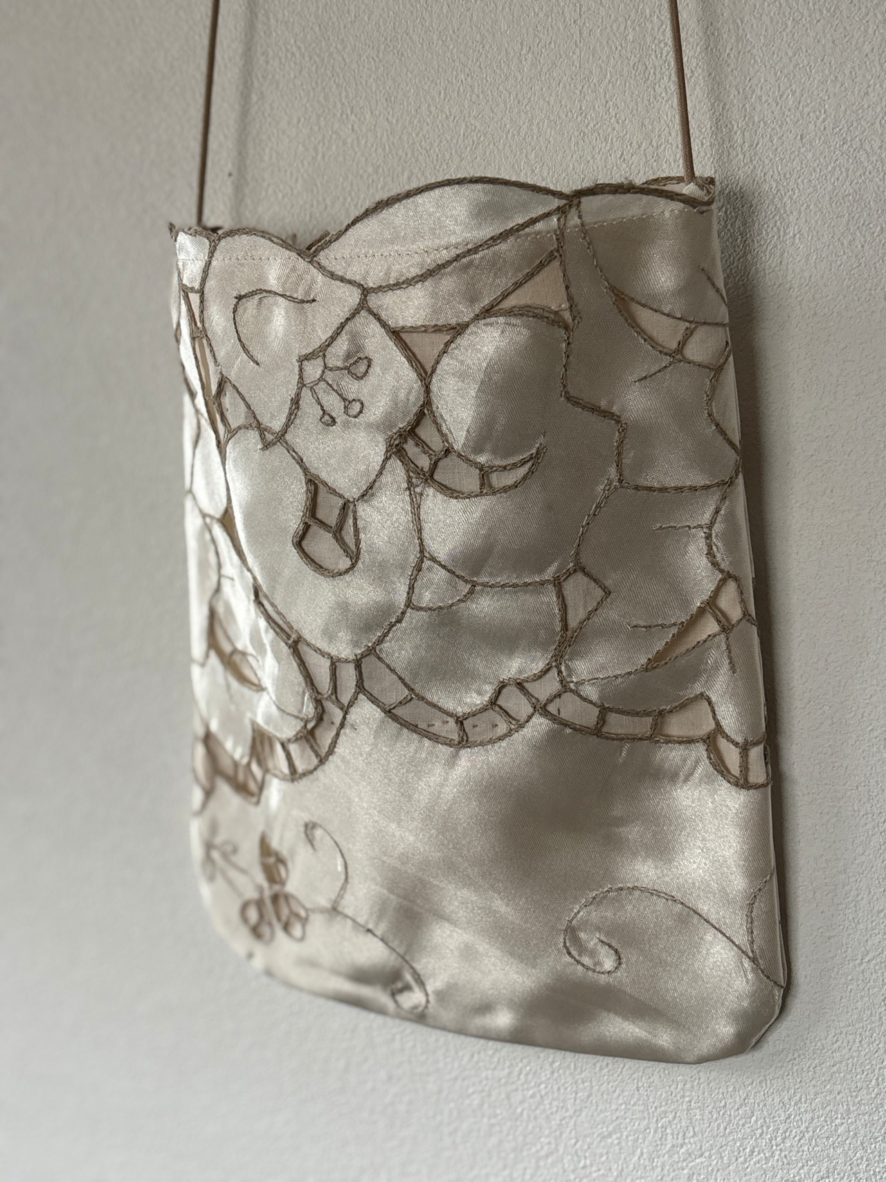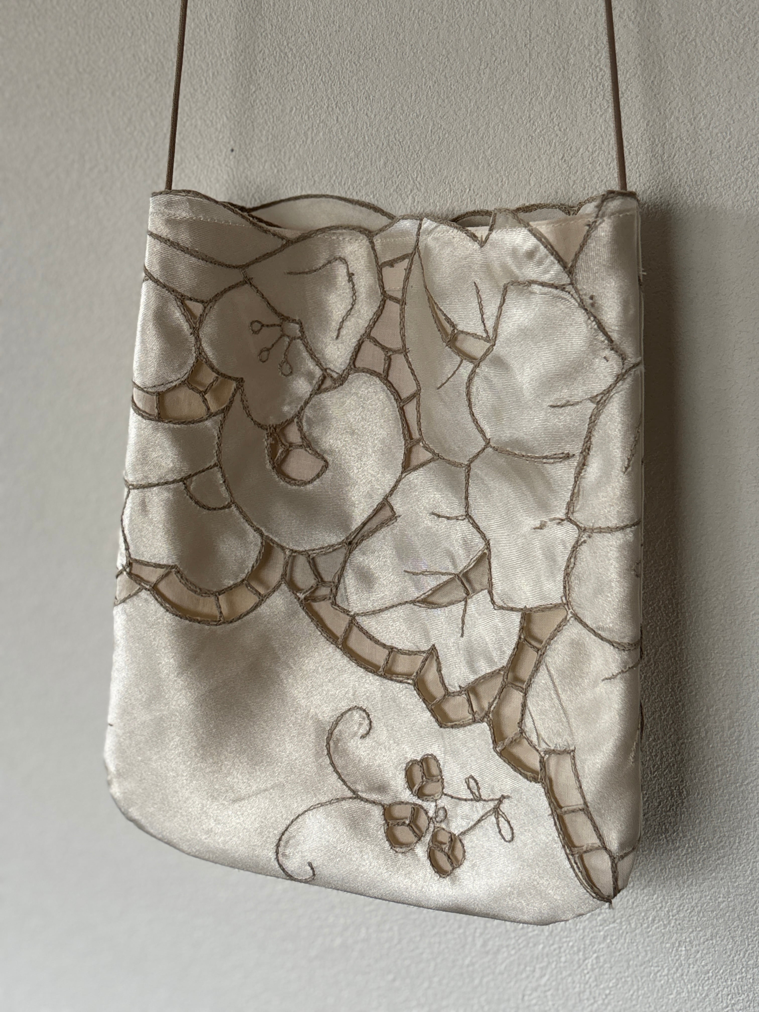 ヴィンテージのサテン生地に施されたカットワーク刺繍を贅沢に使った、小さな宝物のようなポシェット。