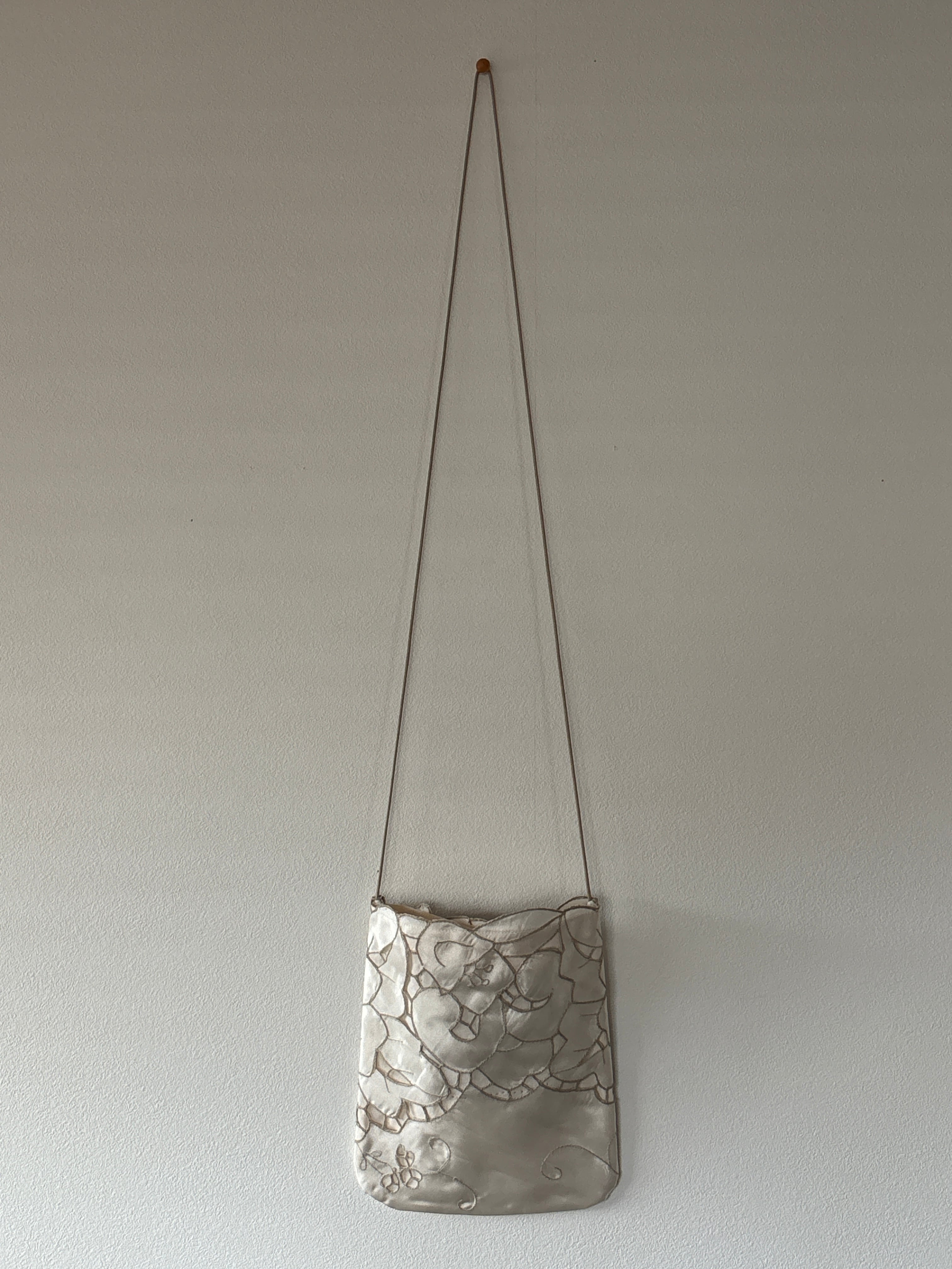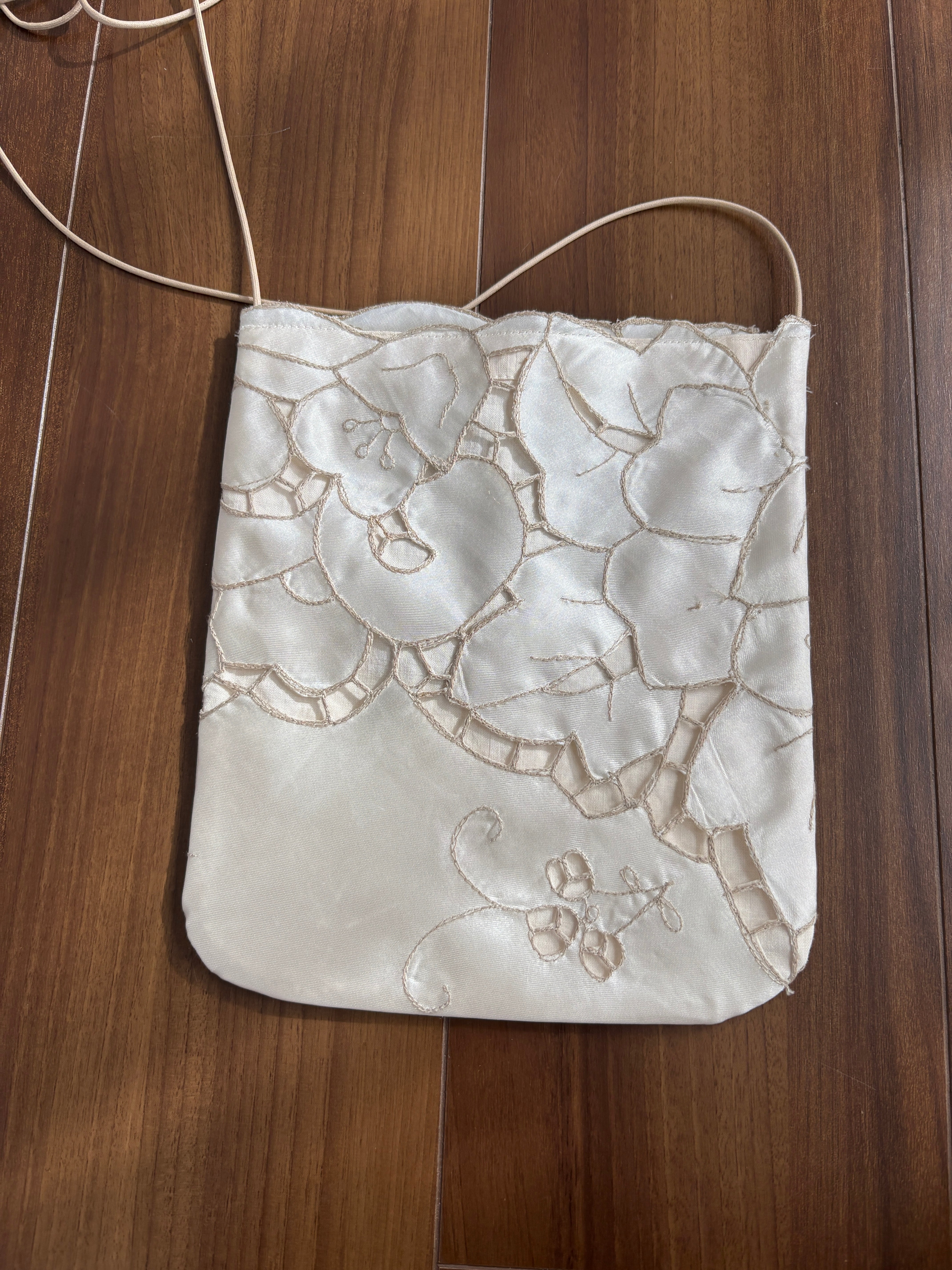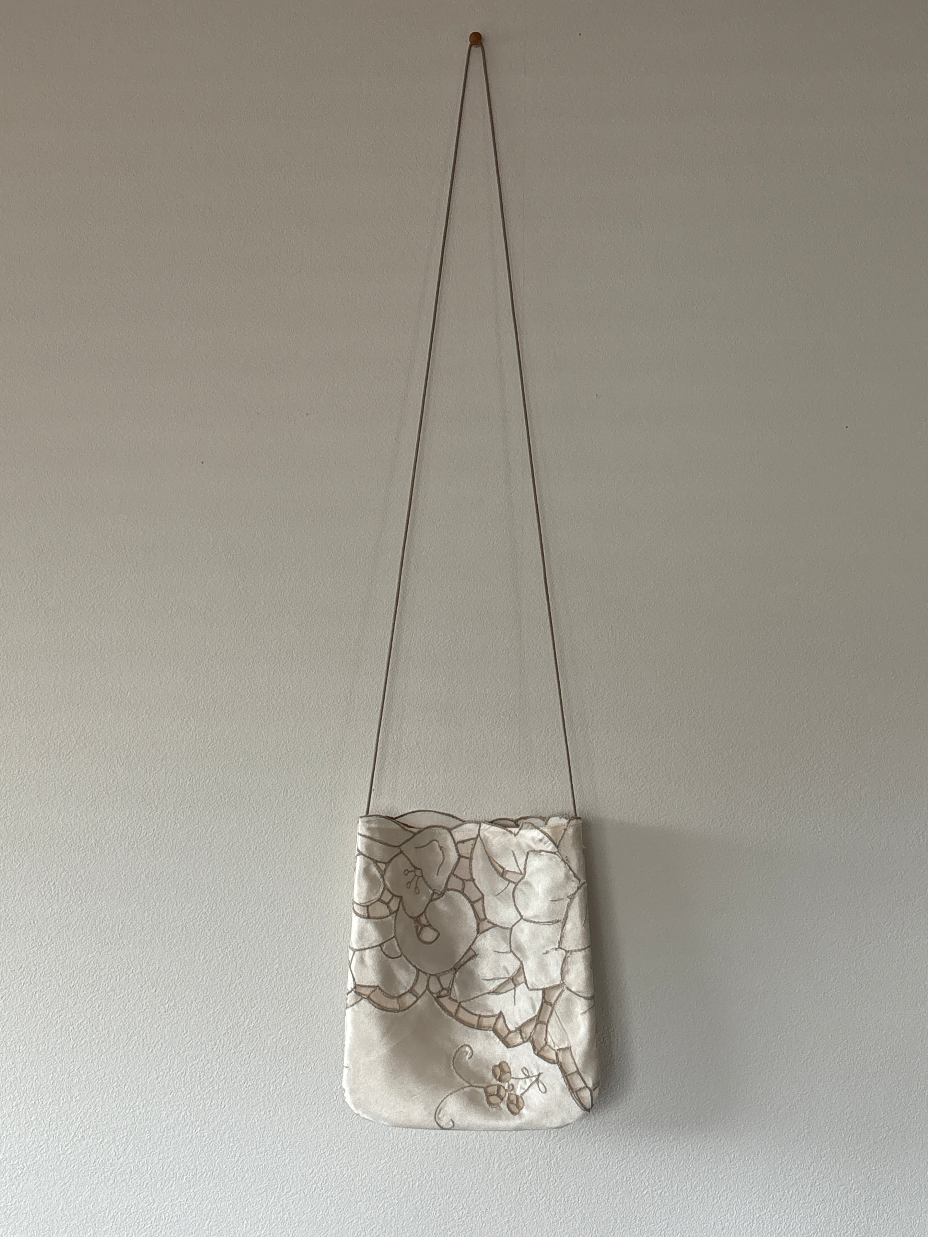 ヴィンテージのサテン生地に施されたカットワーク刺繍を贅沢に使った、小さな宝物のようなポシェット。