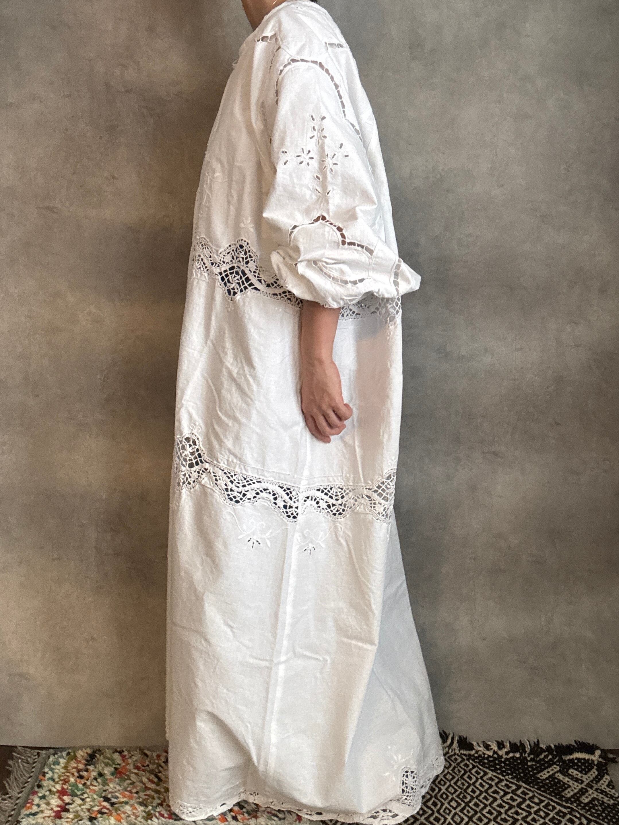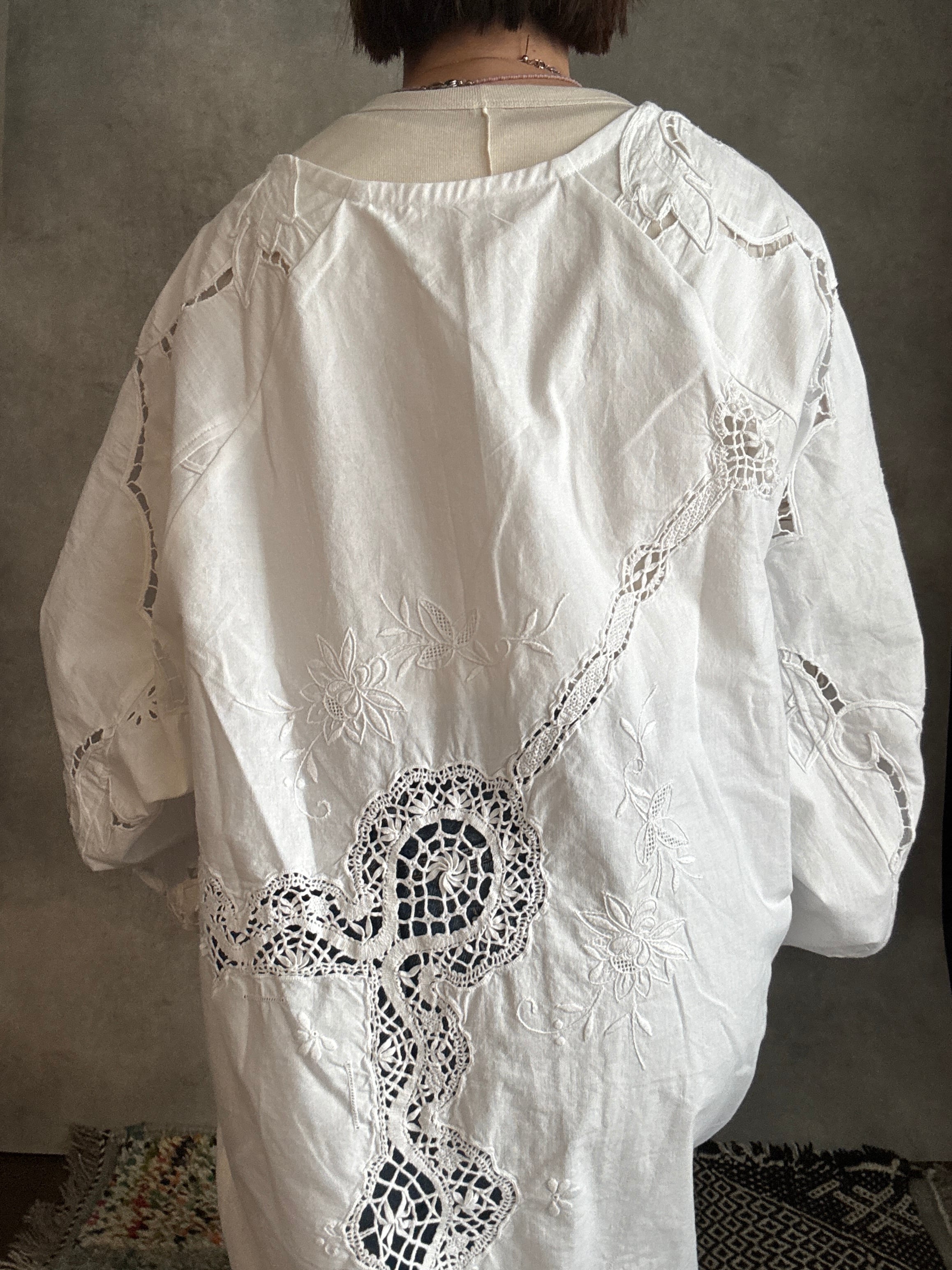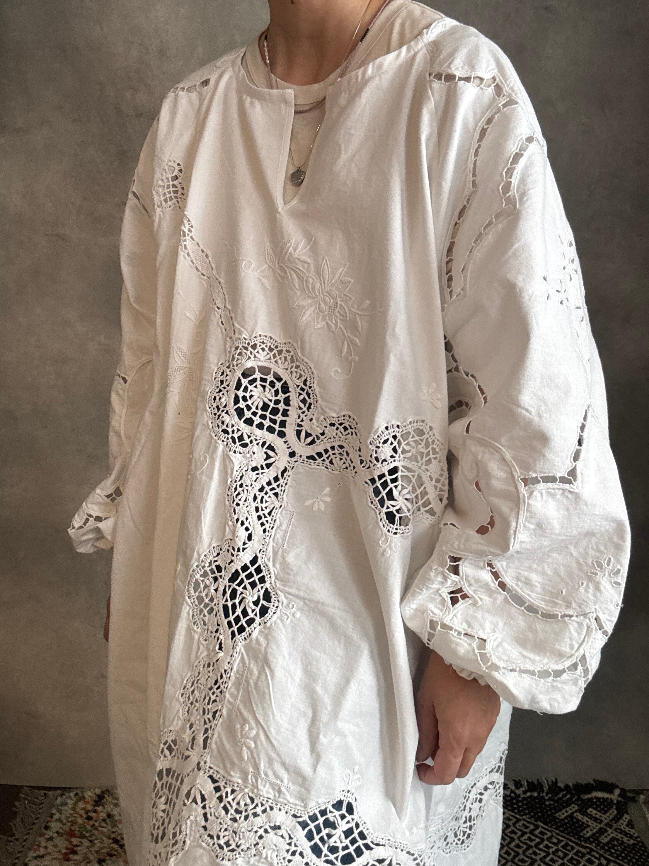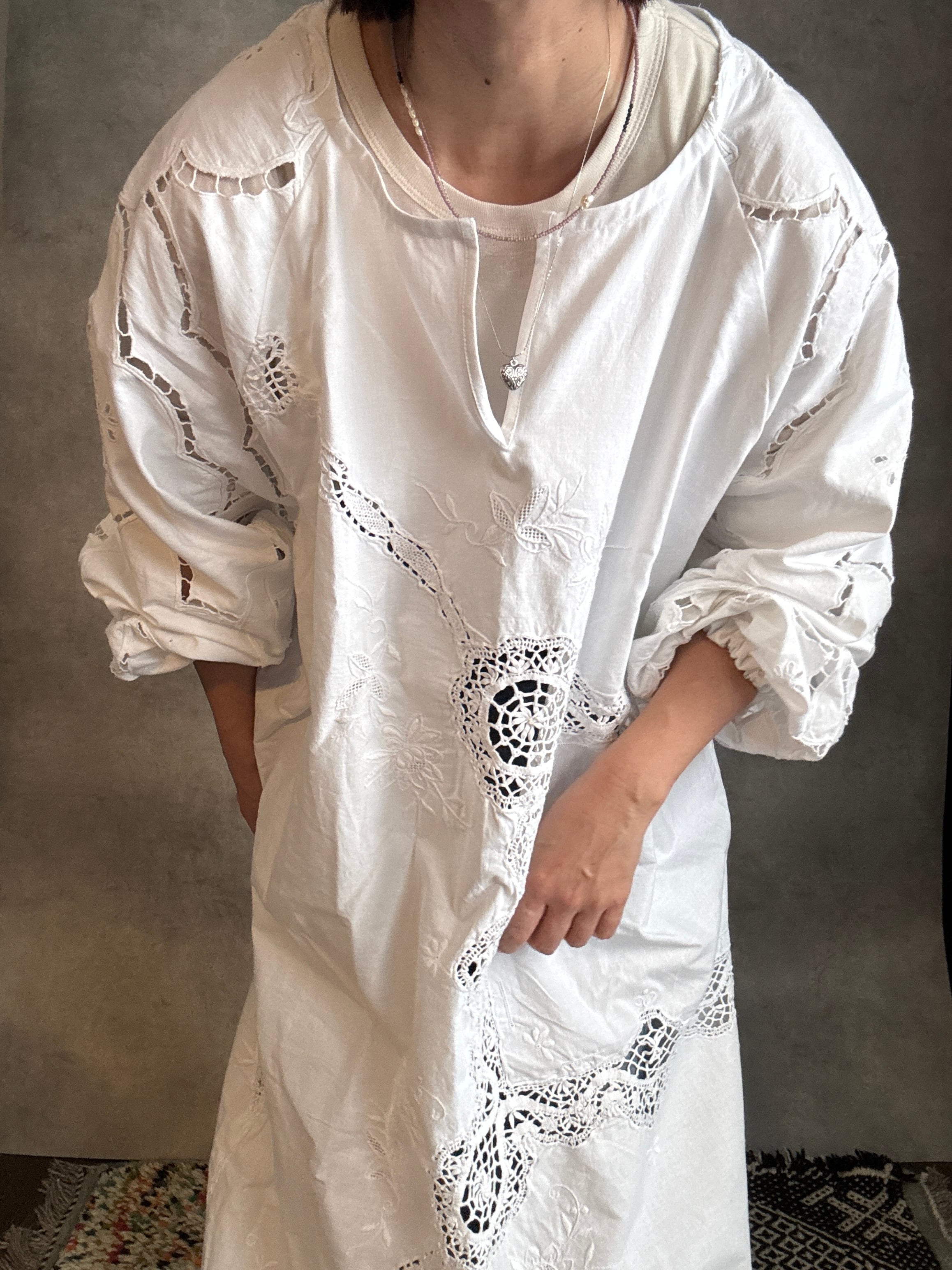 素材:おそらくヴィンテージコットンまたはコットンリネン(クロシェレース、刺繍入り)