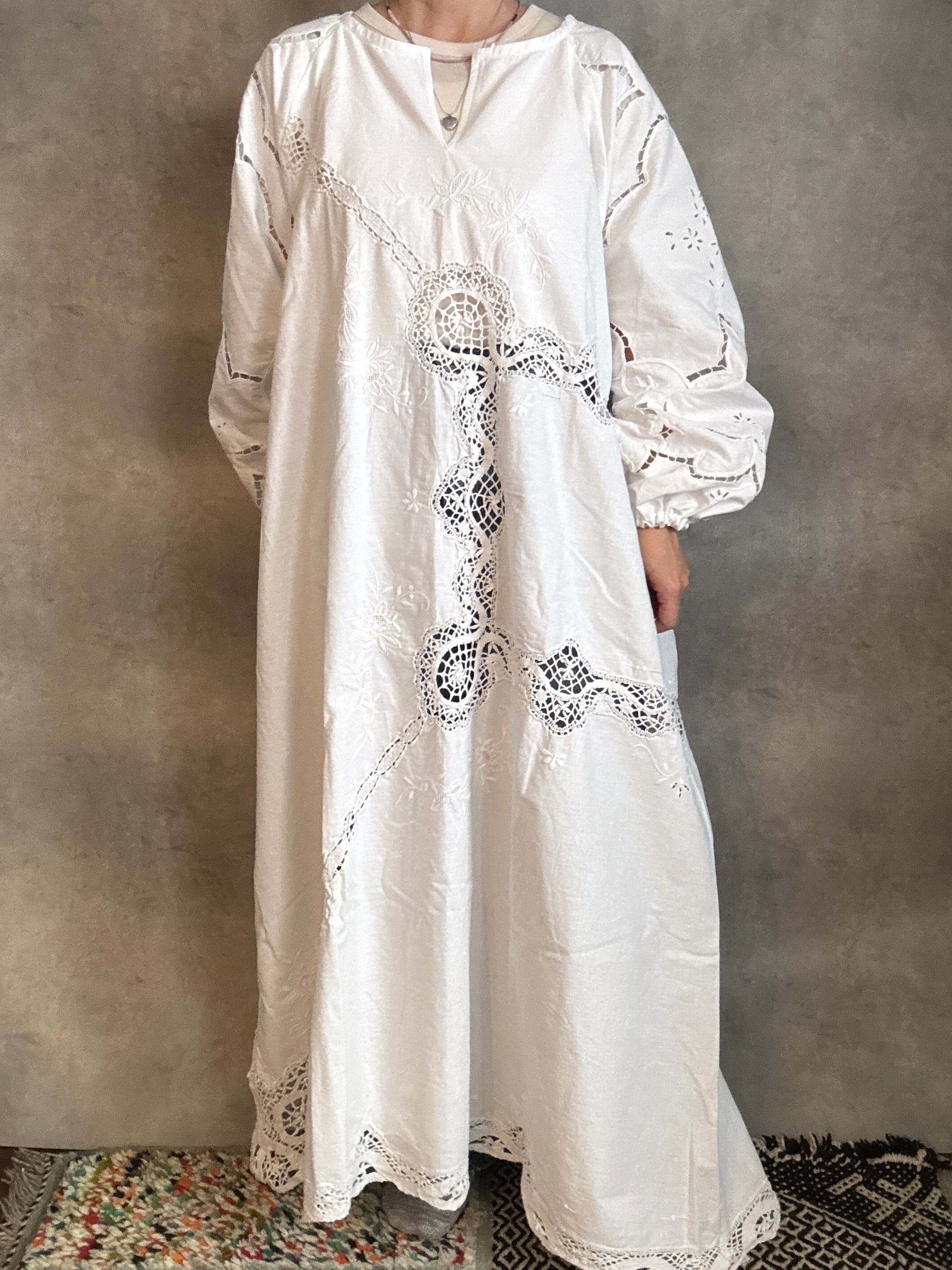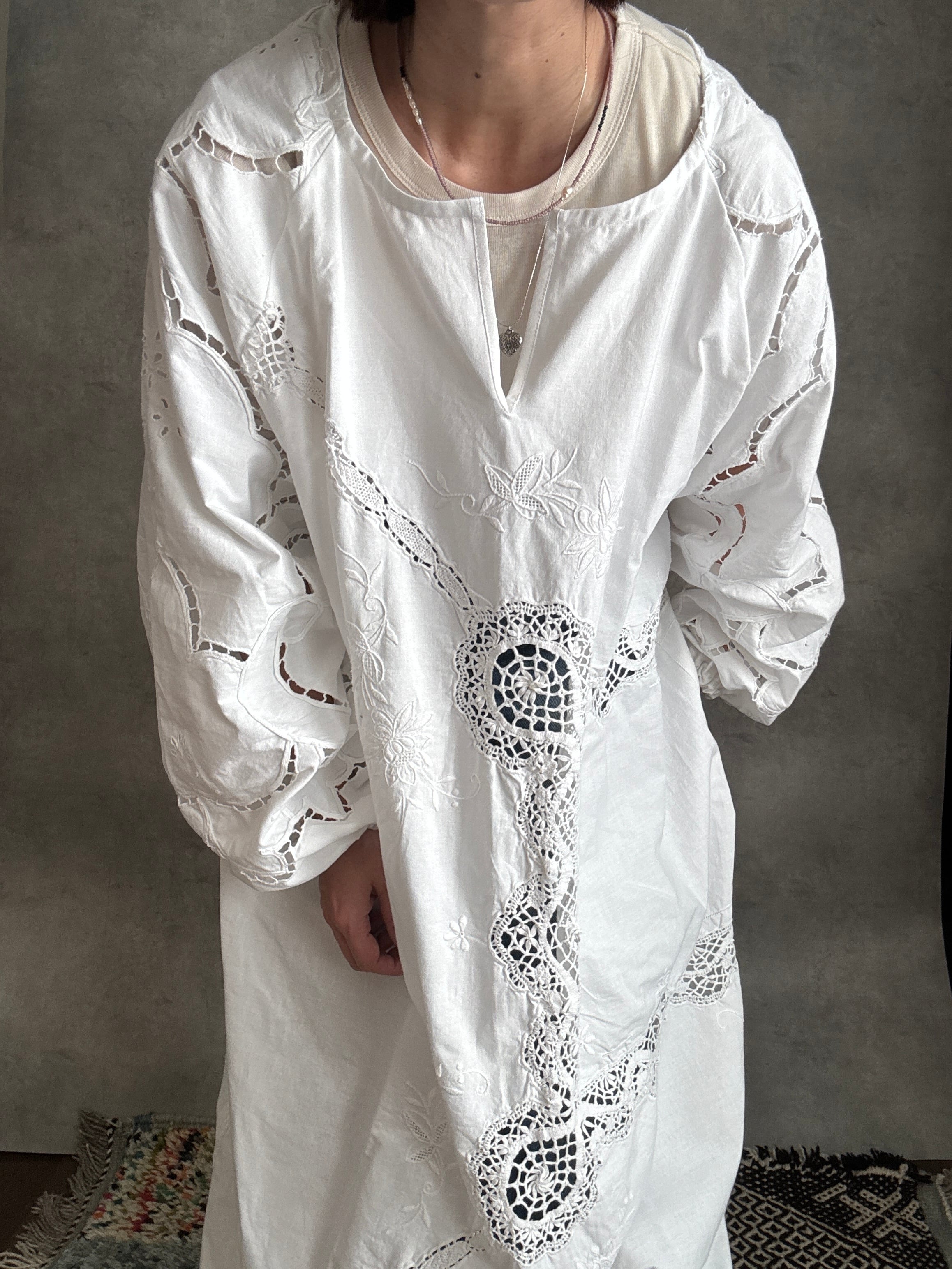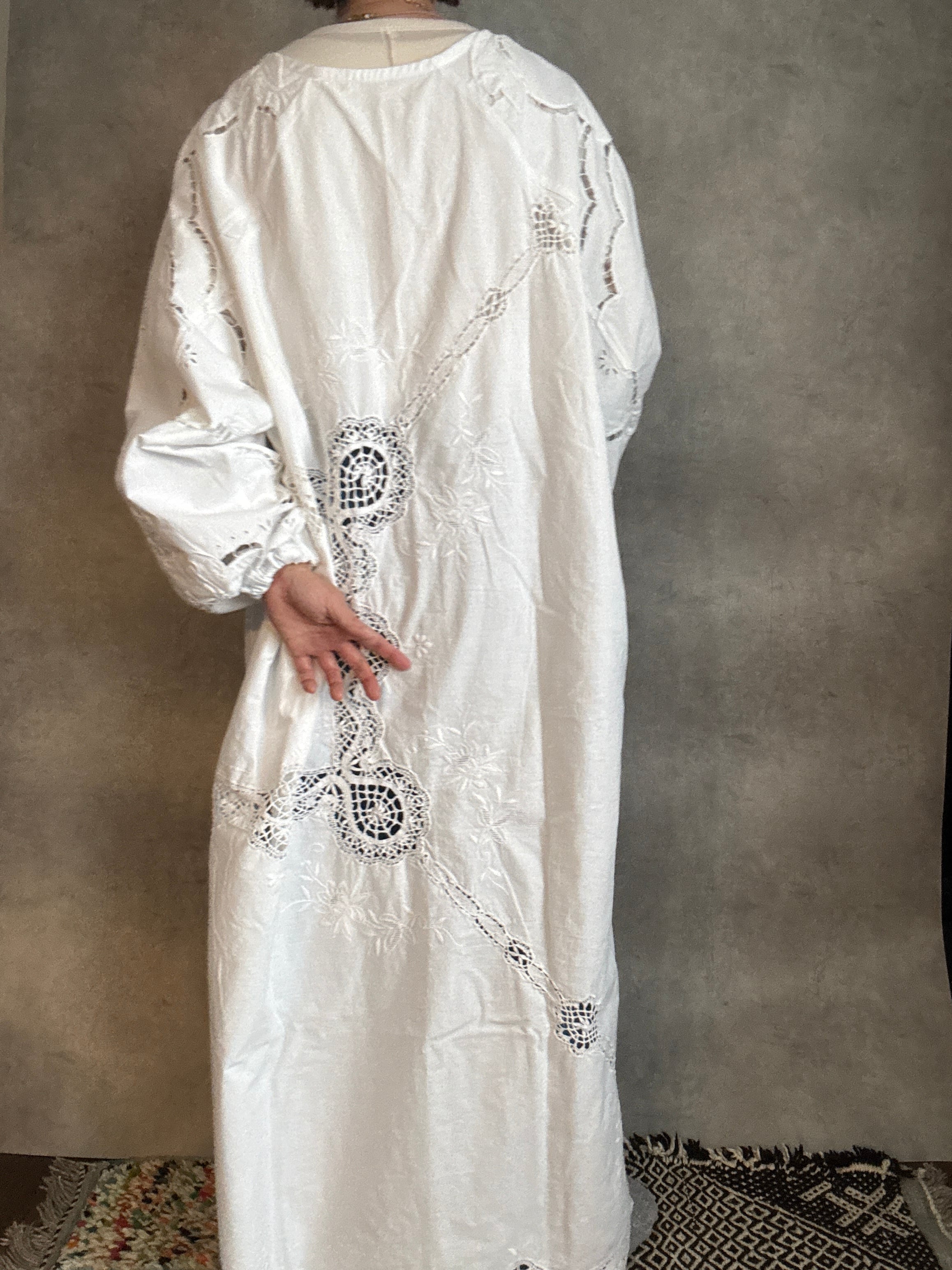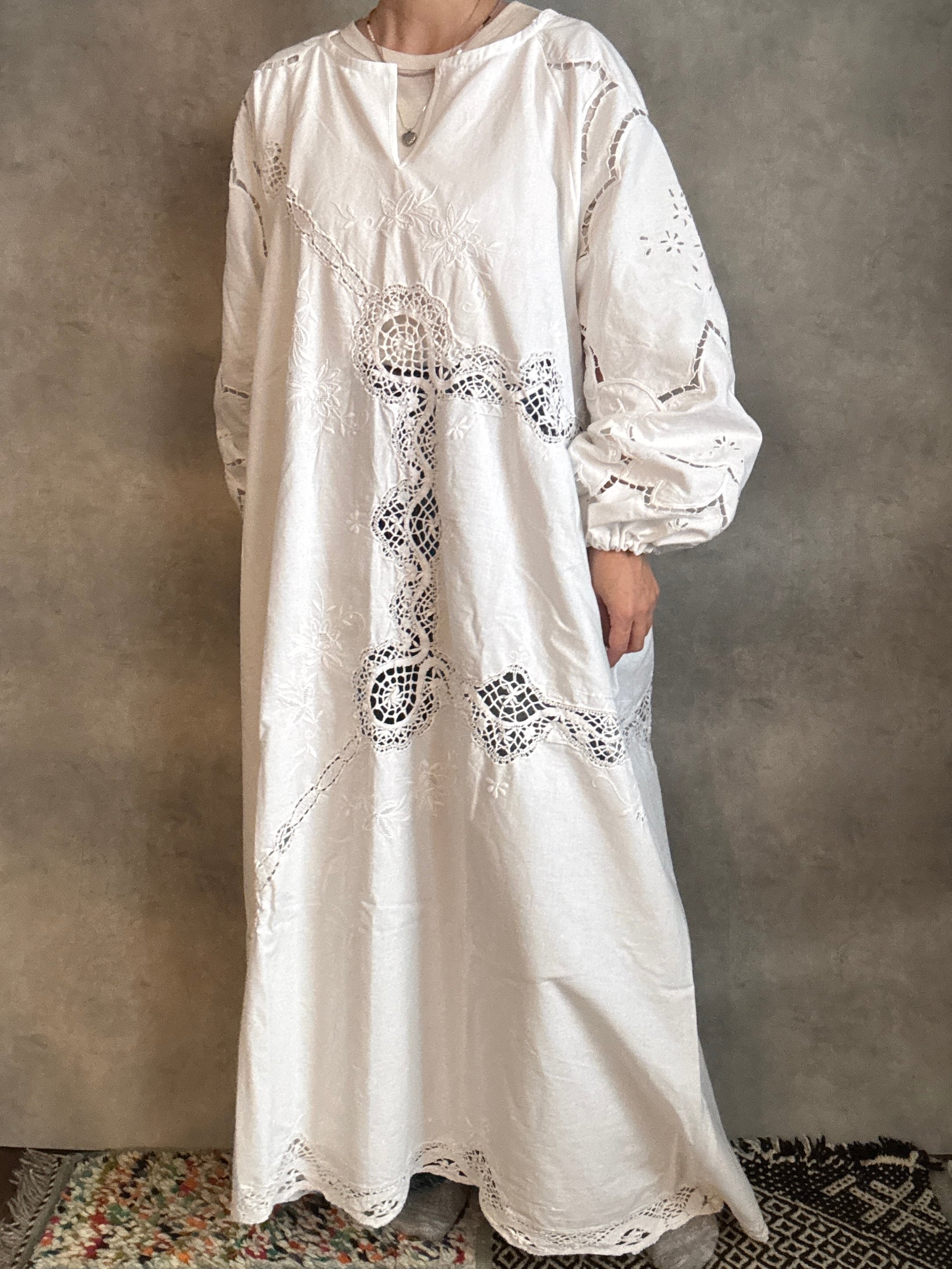 素材:おそらくヴィンテージコットンまたはコットンリネン(クロシェレース、刺繍入り)