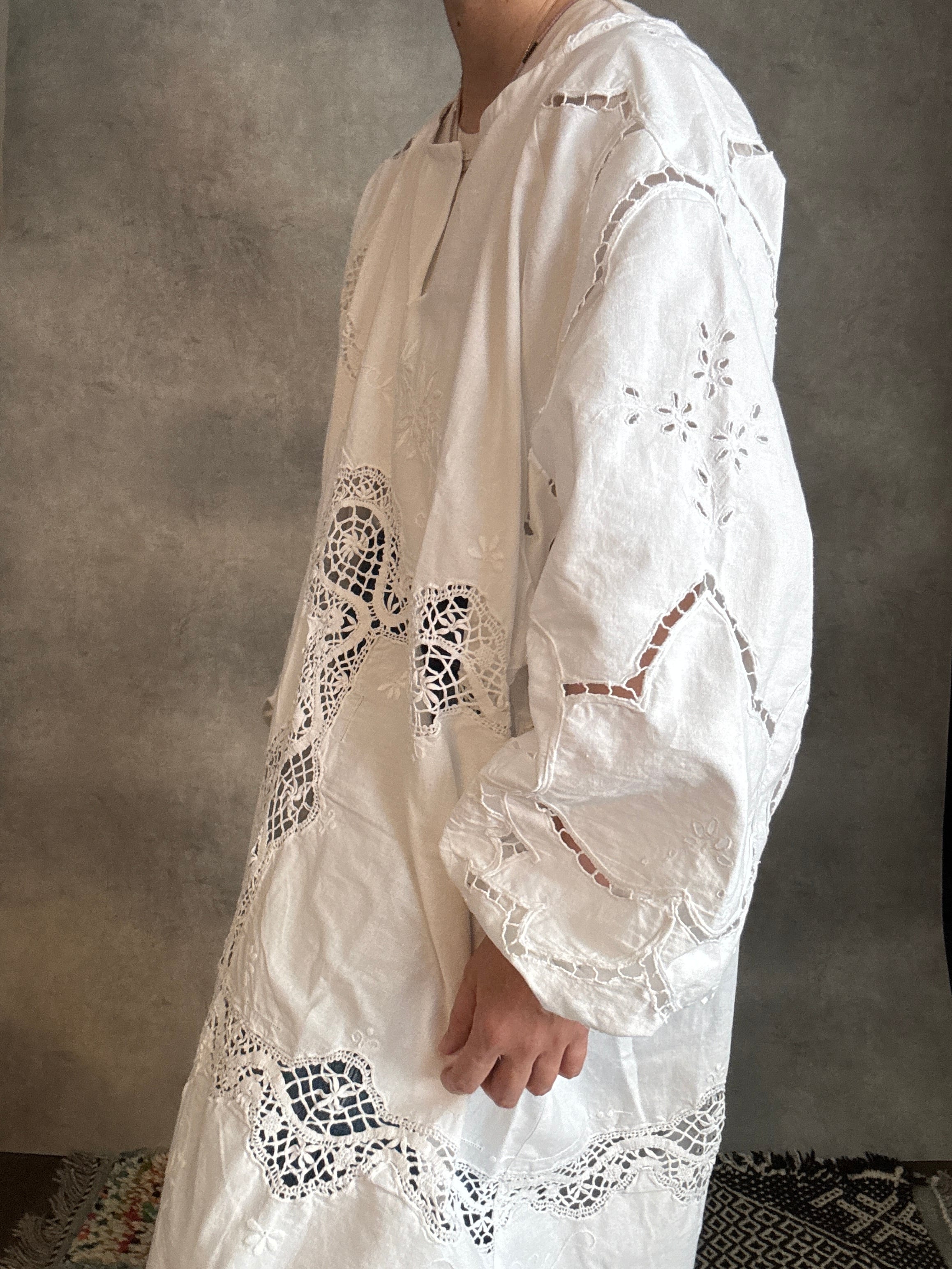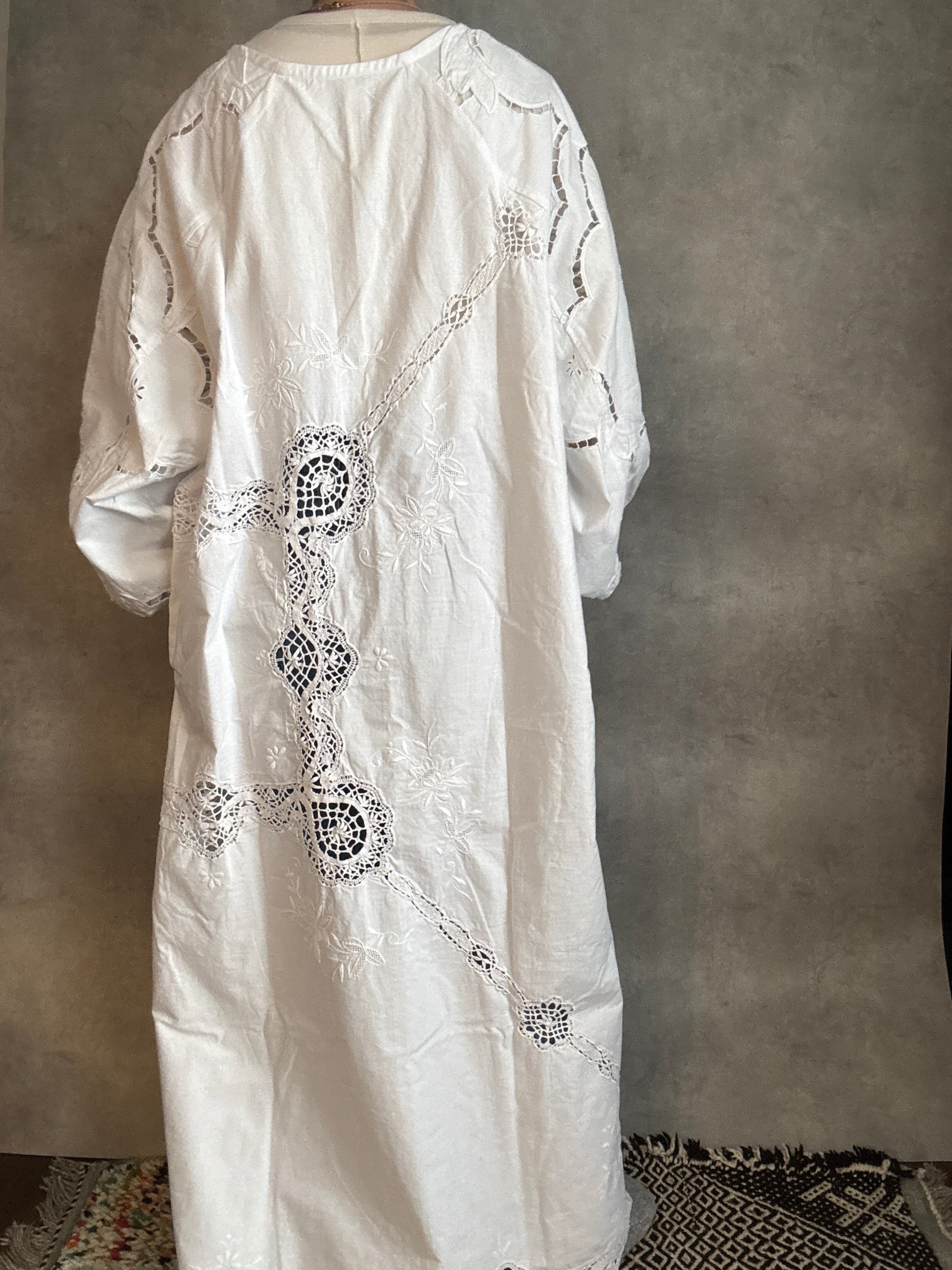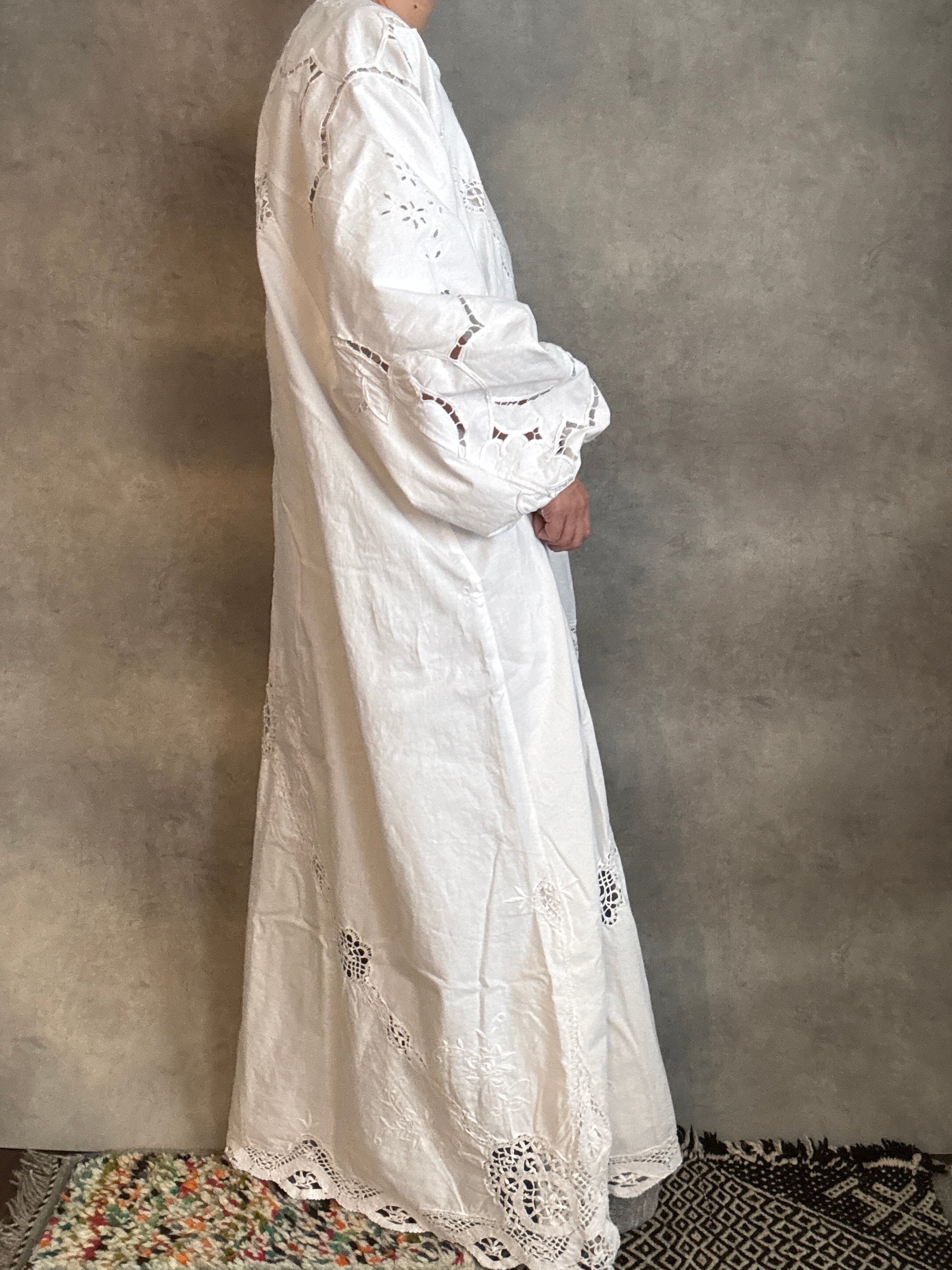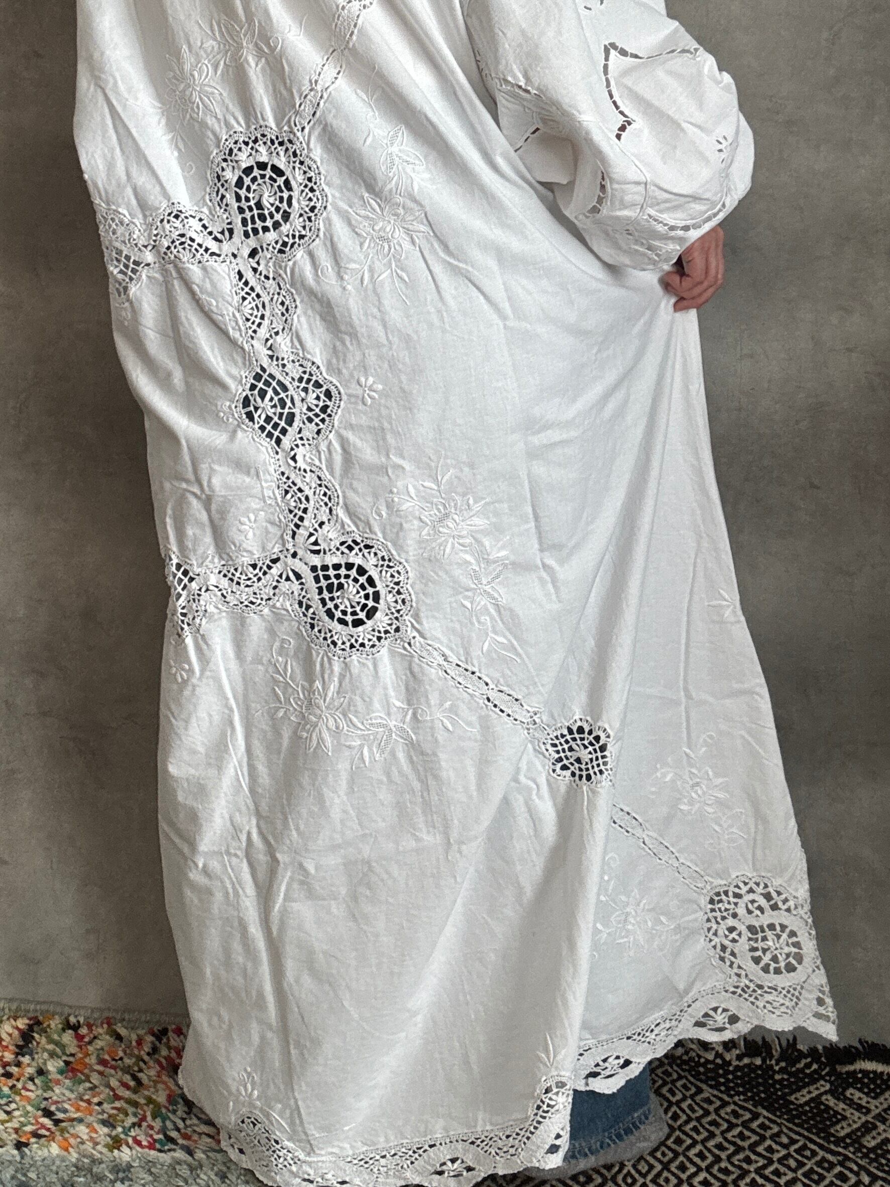 素材:おそらくヴィンテージコットンまたはコットンリネン(クロシェレース、刺繍入り)