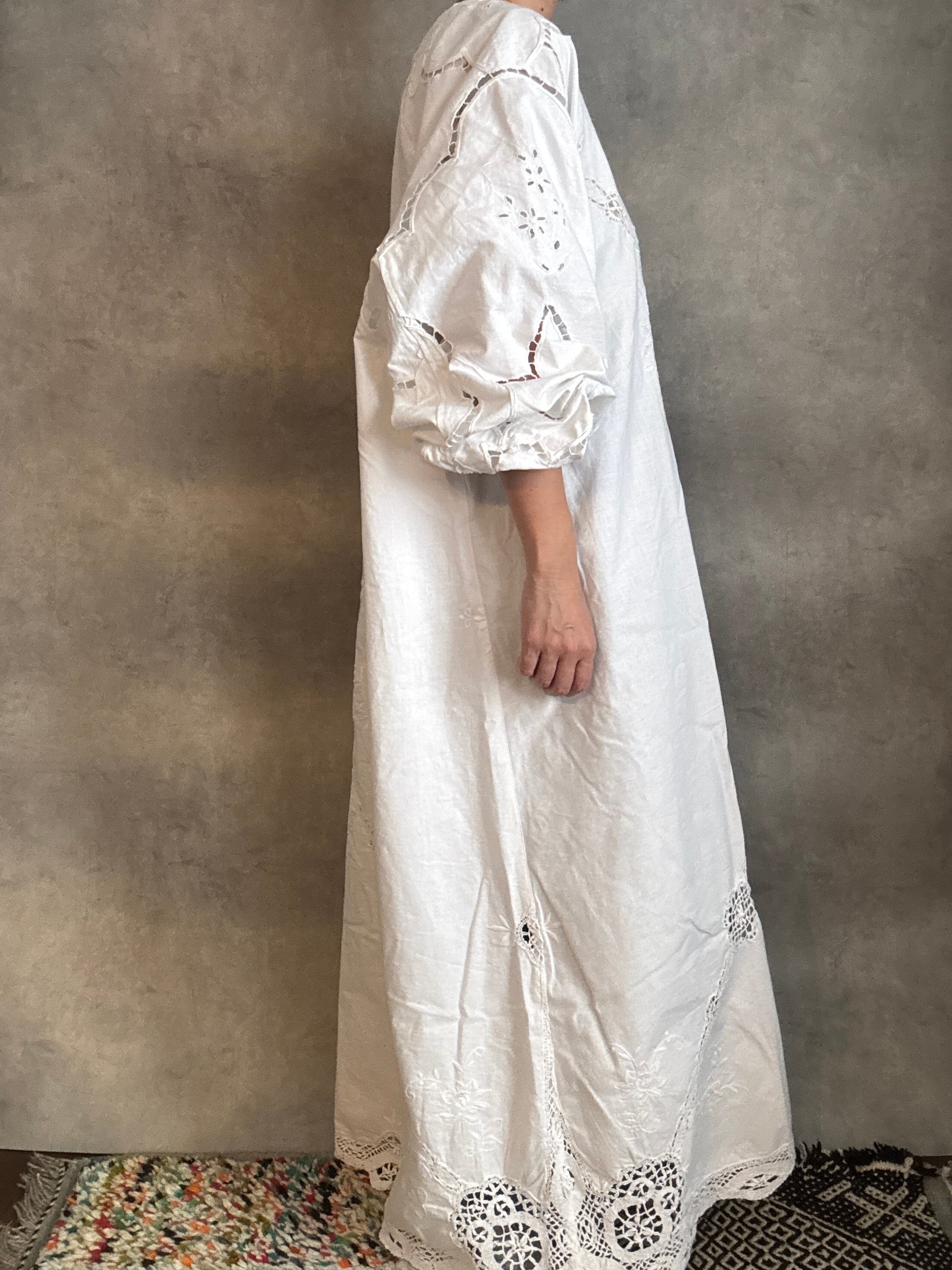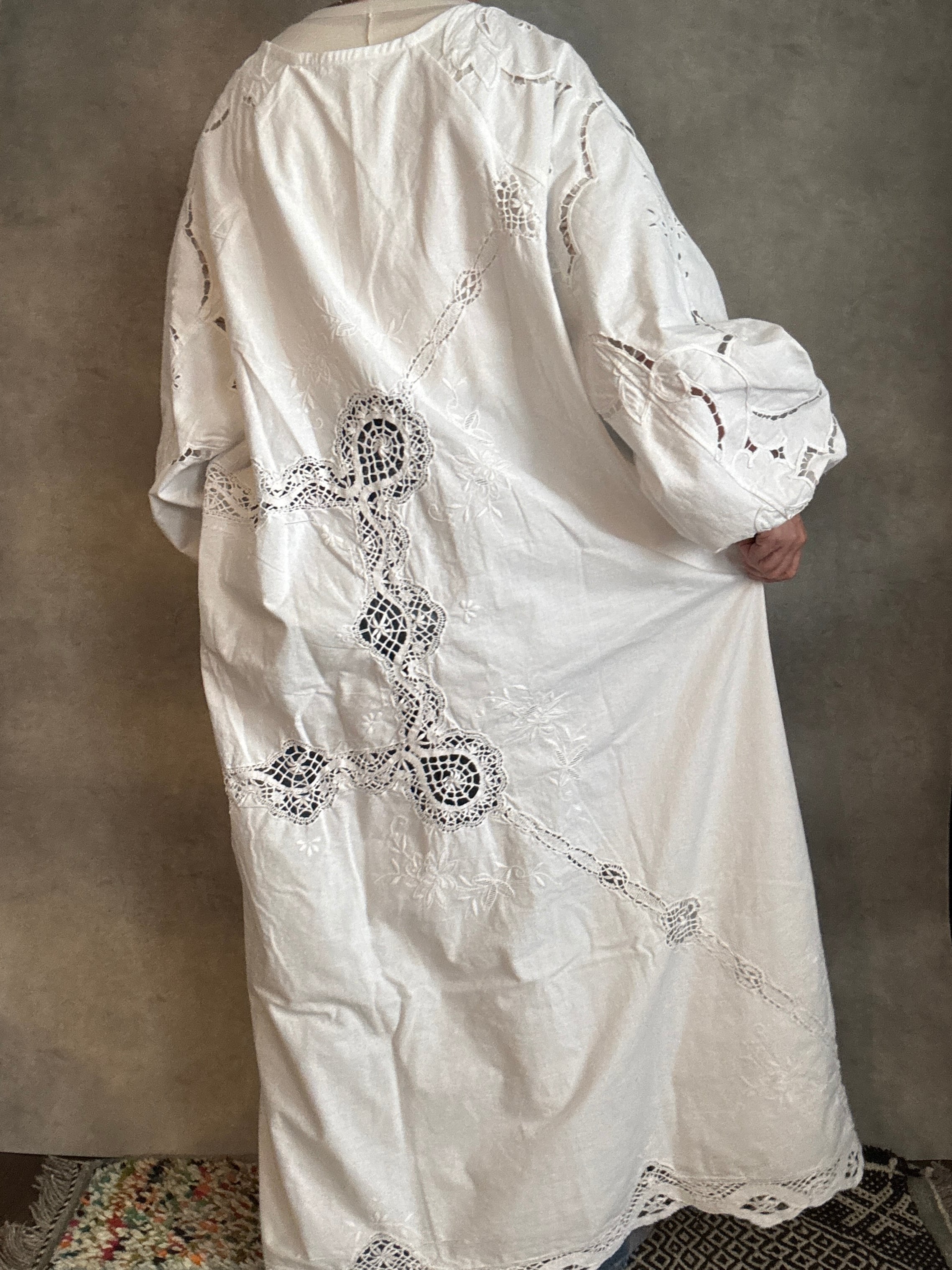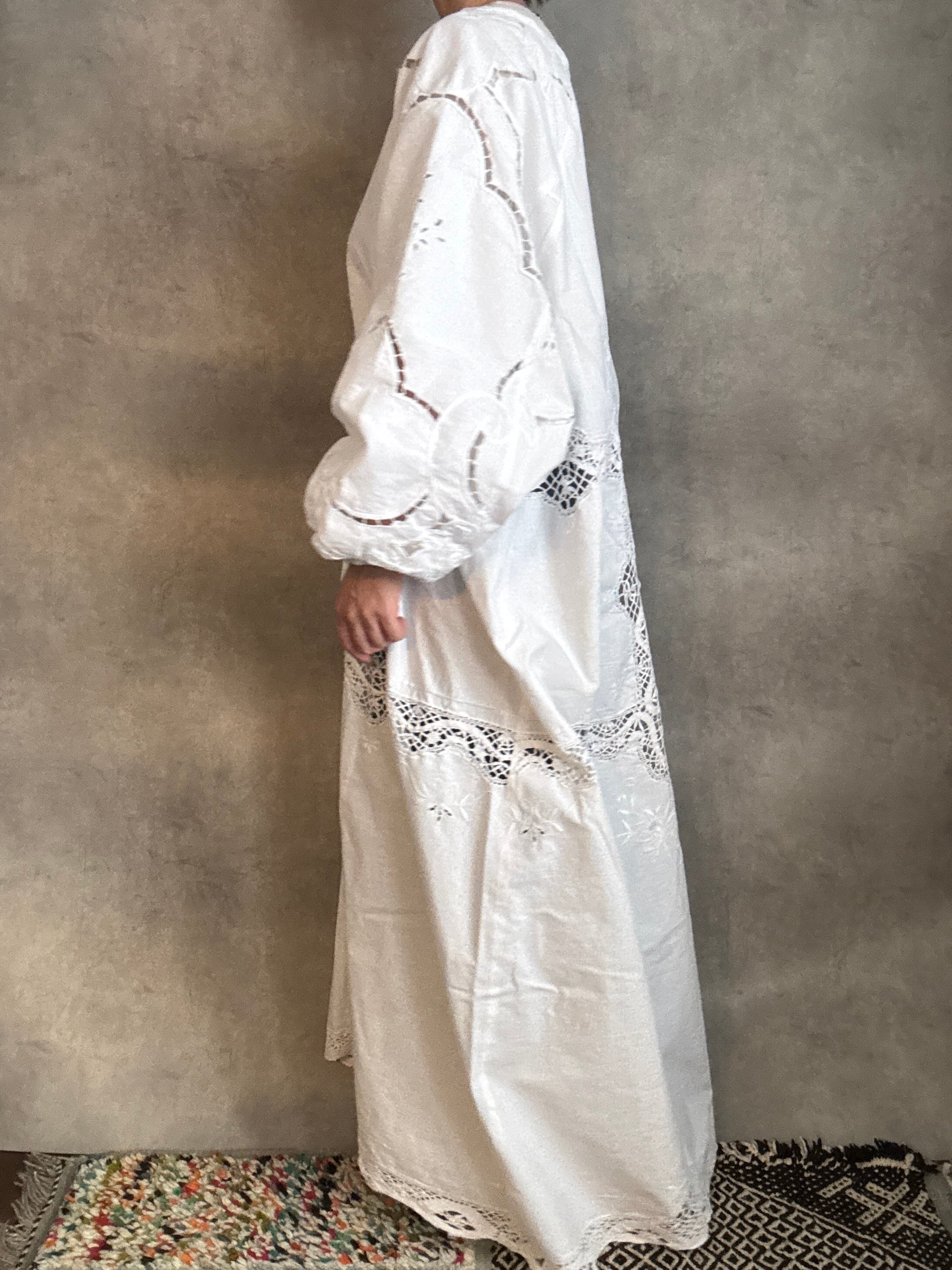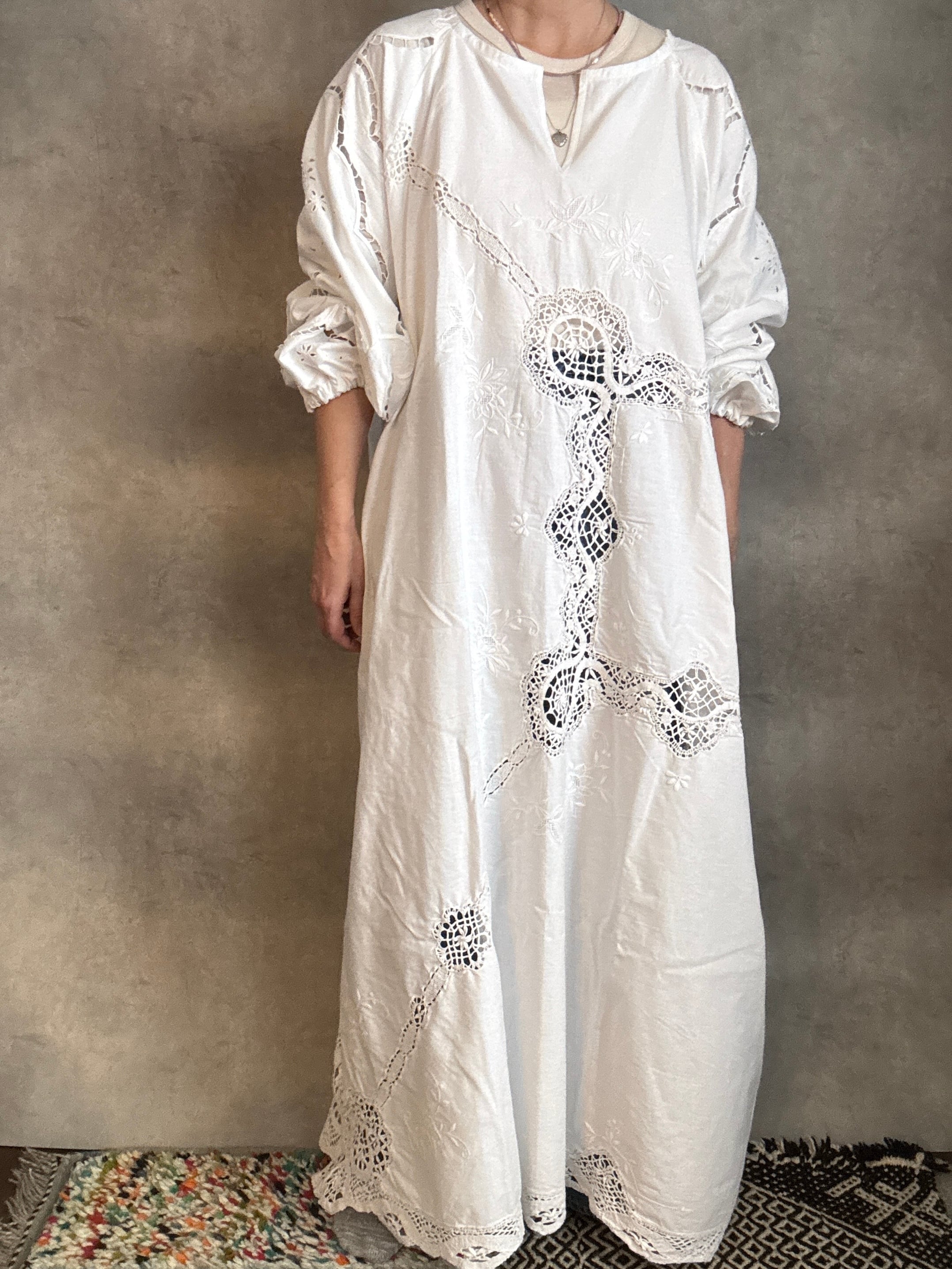 素材:おそらくヴィンテージコットンまたはコットンリネン(クロシェレース、刺繍入り)