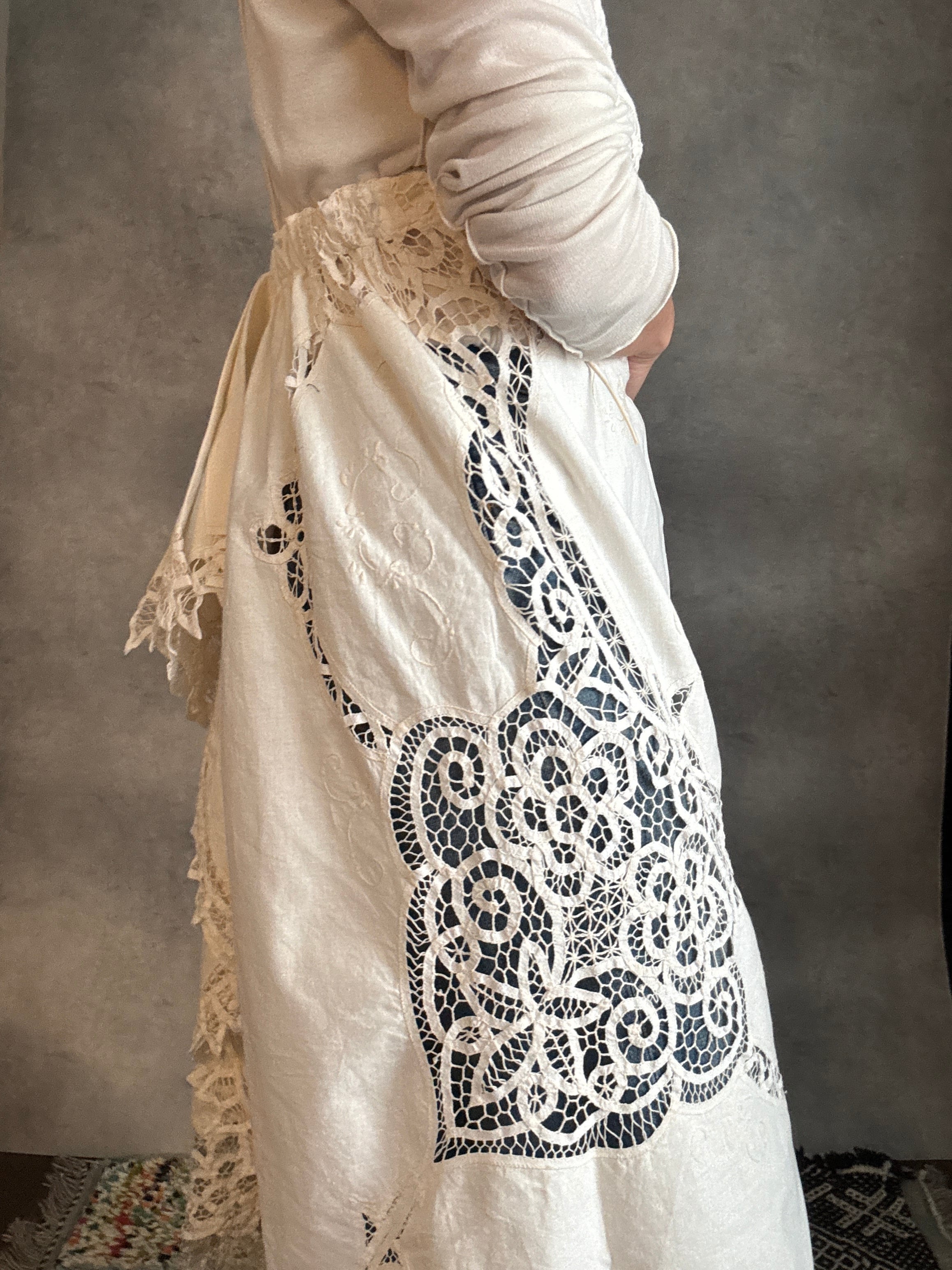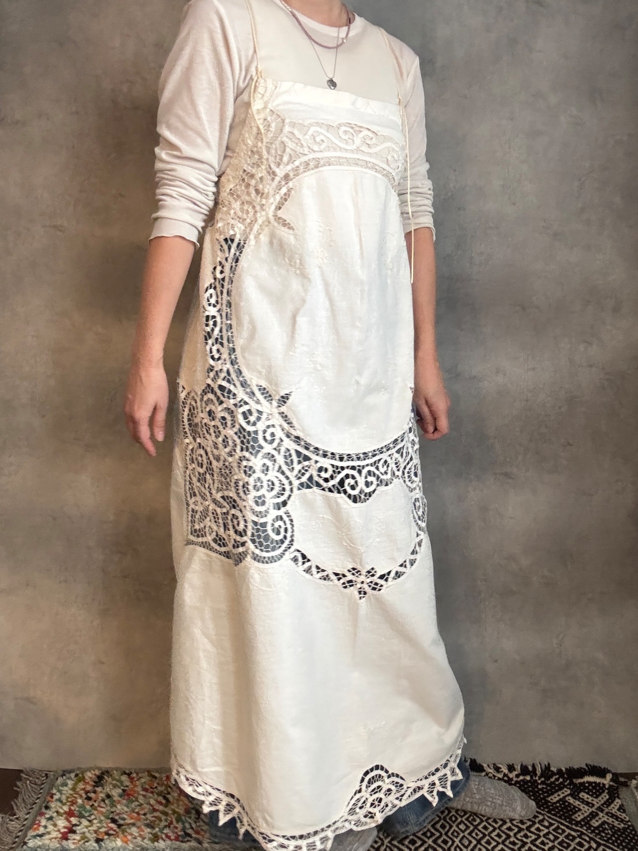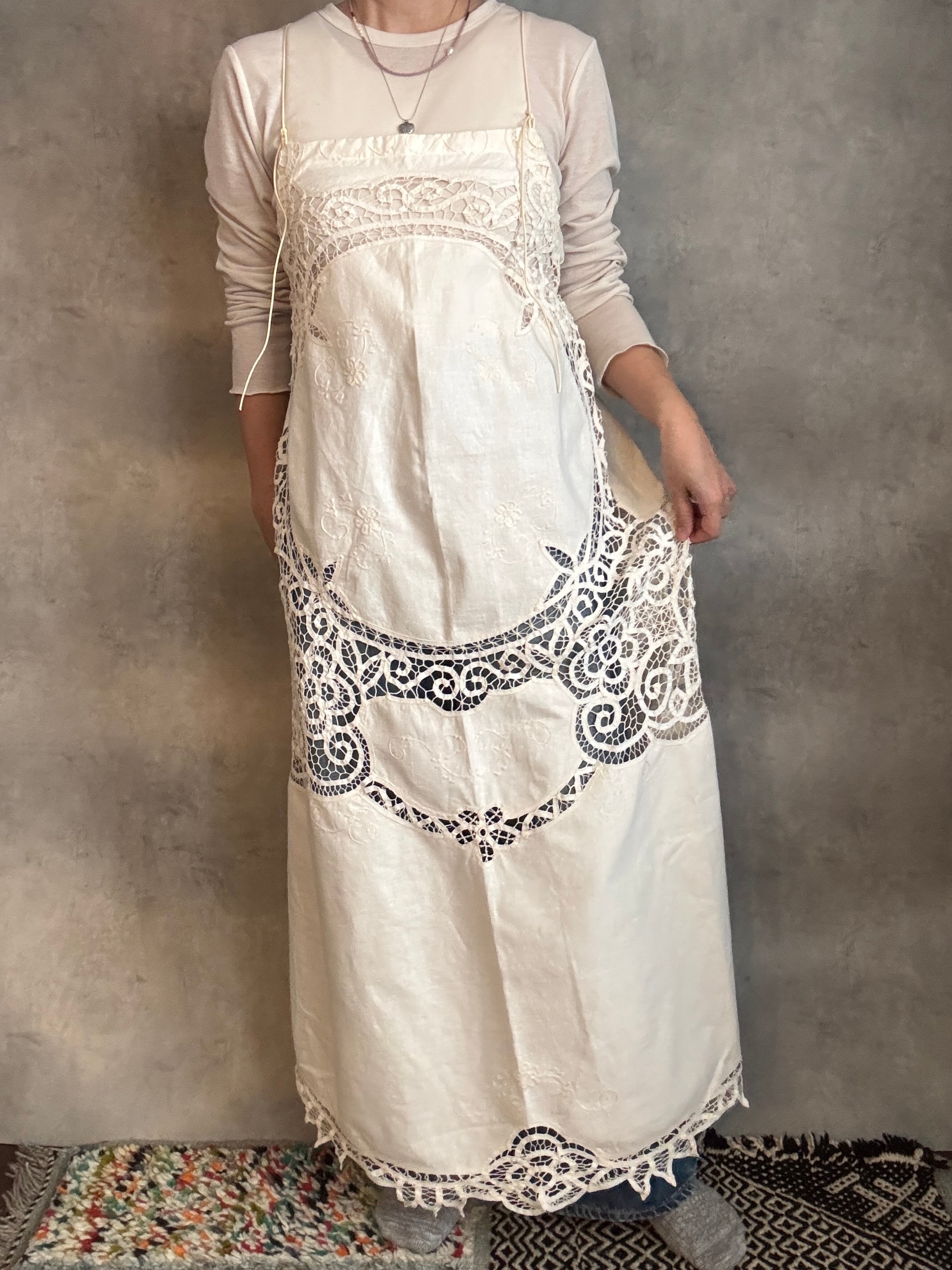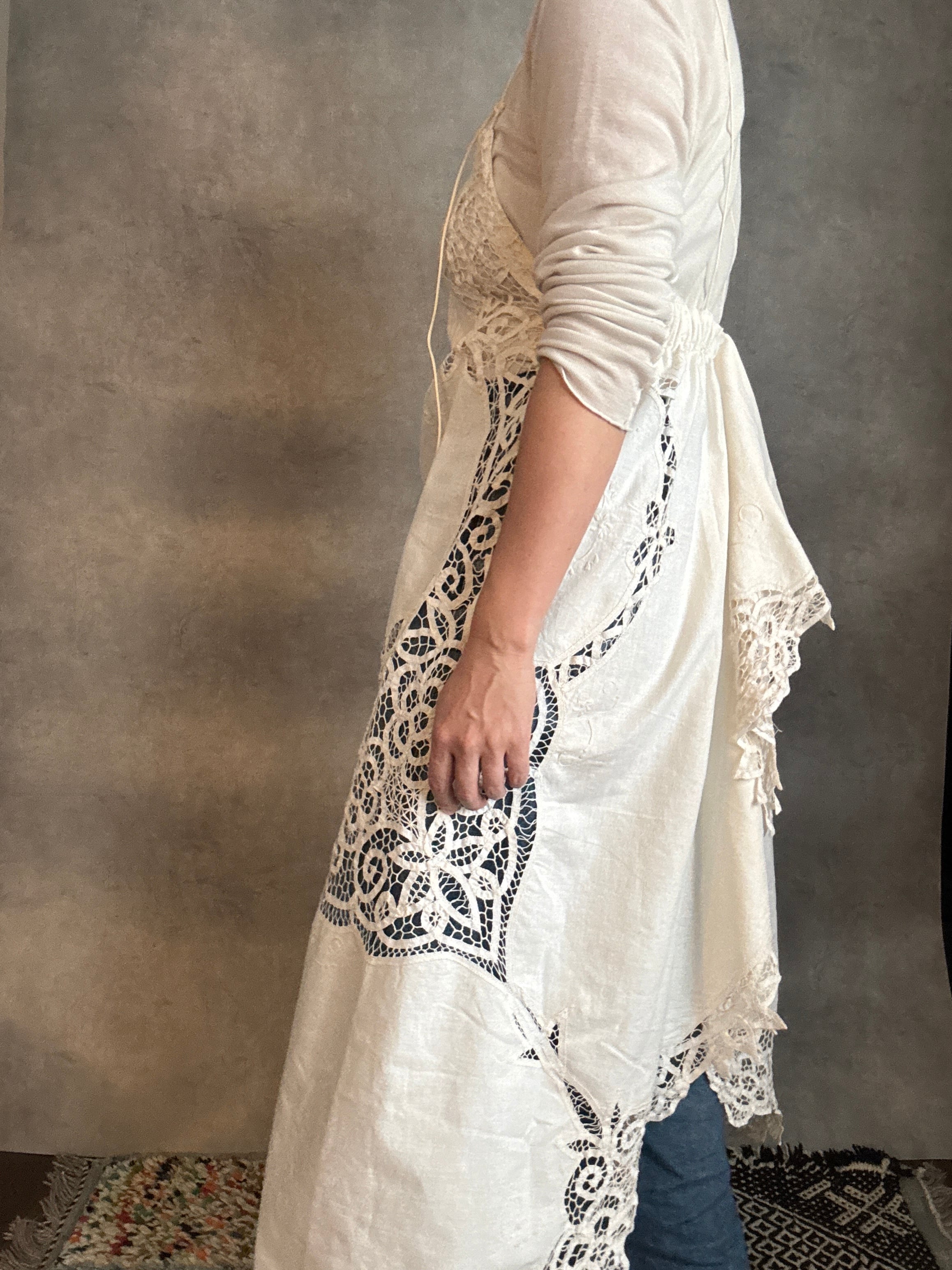 素材:おそらくヴィンテージコットンまたはコットンリネン(クロシェレース、刺繍入り)