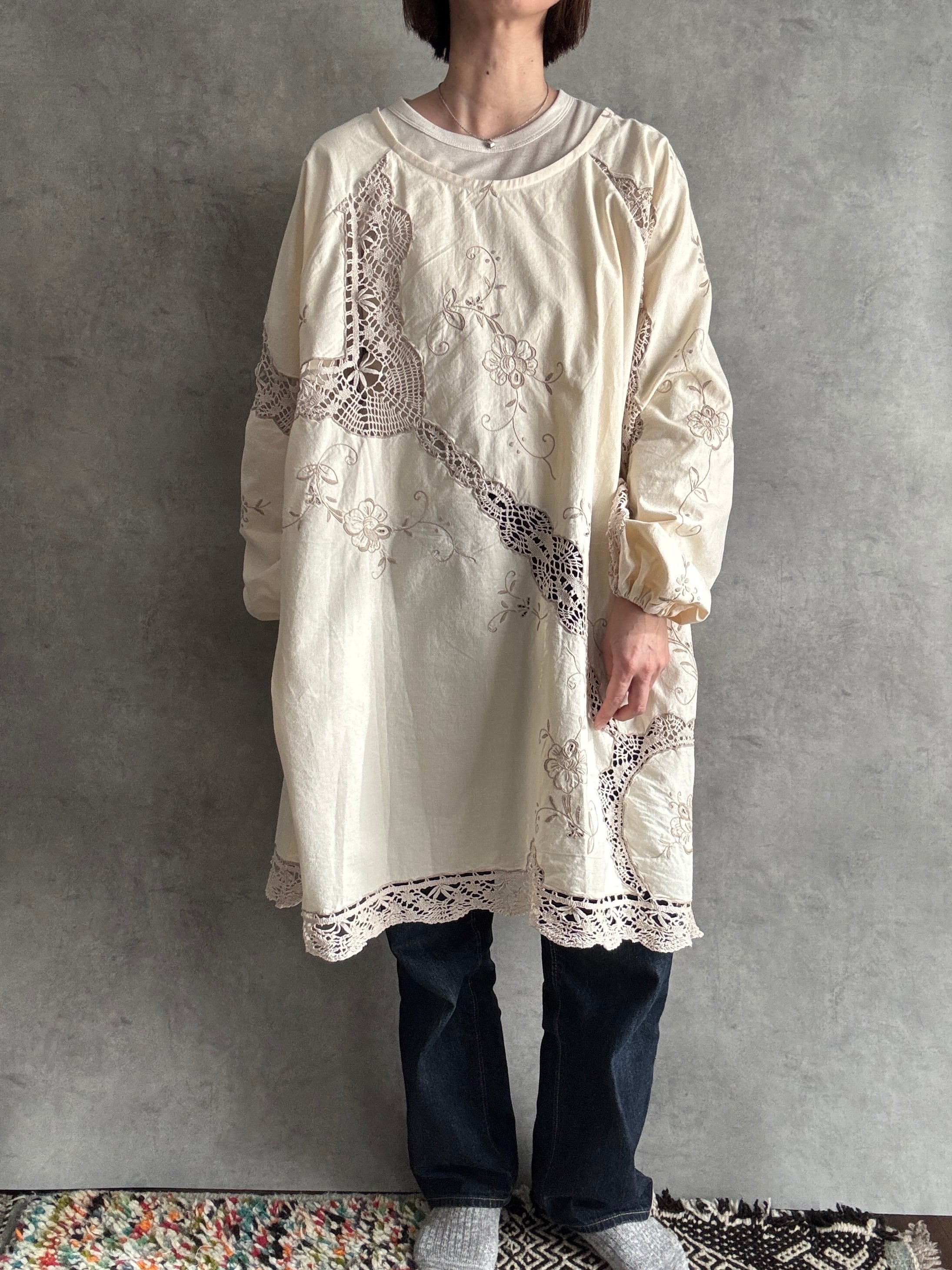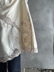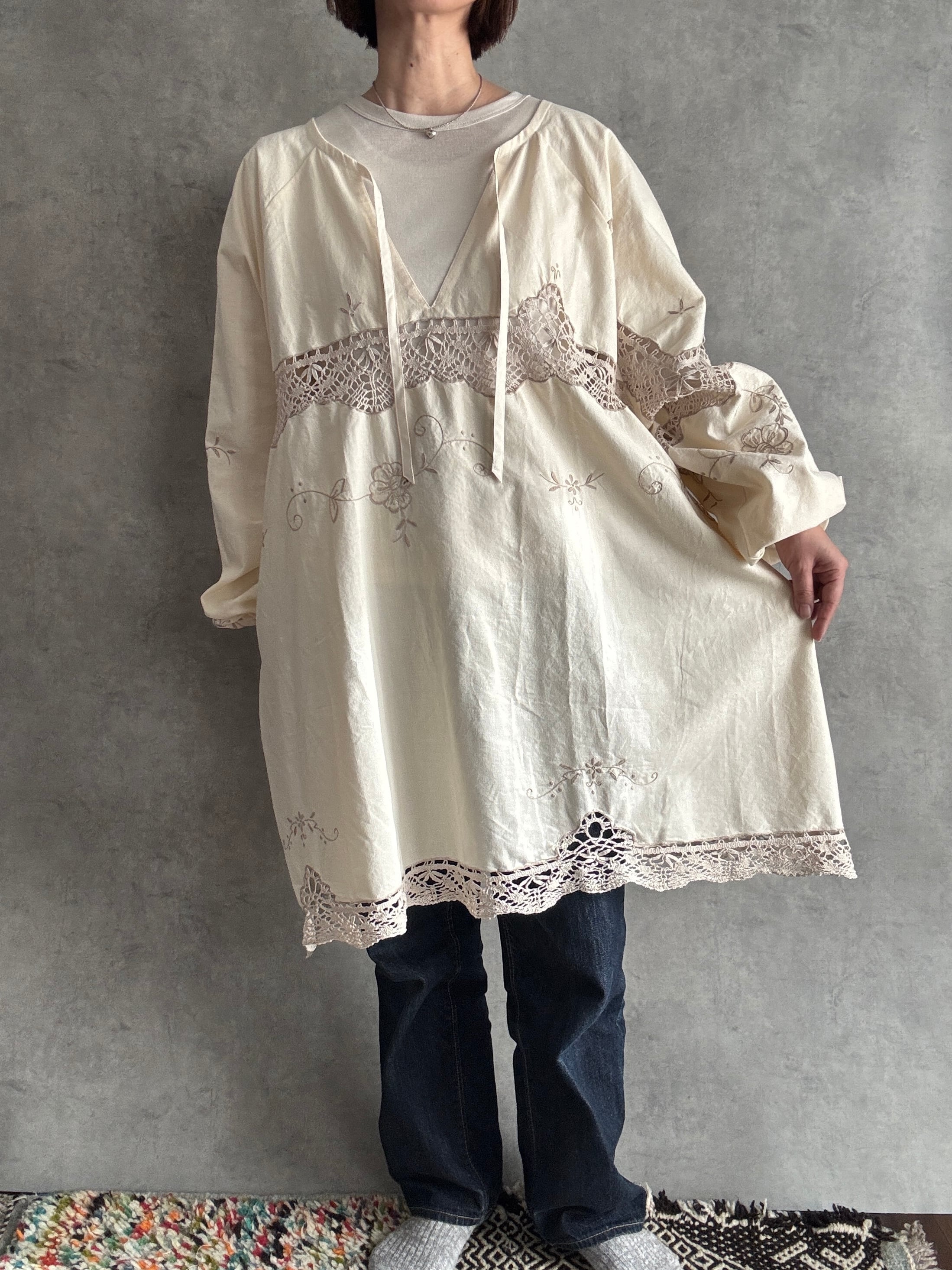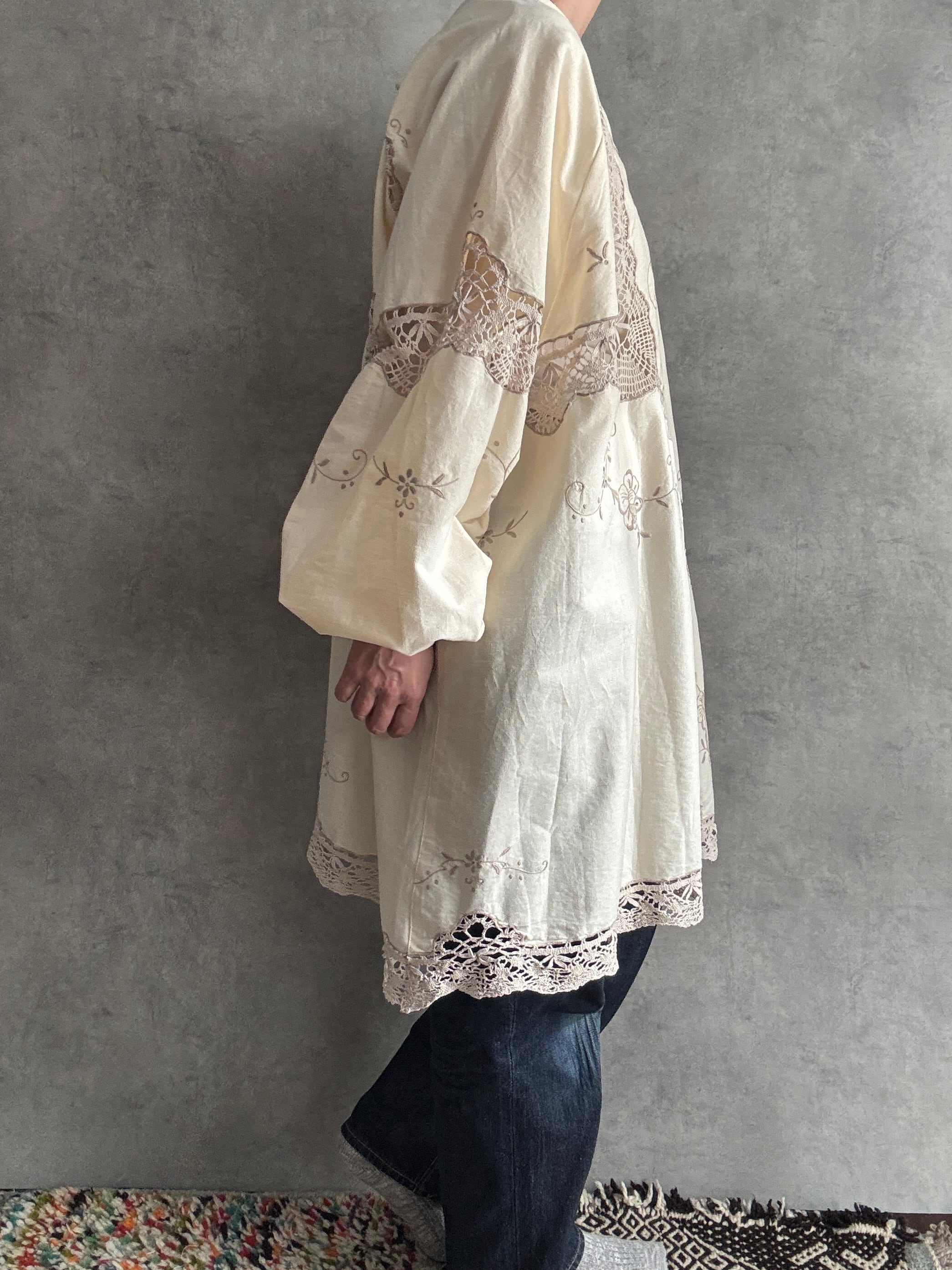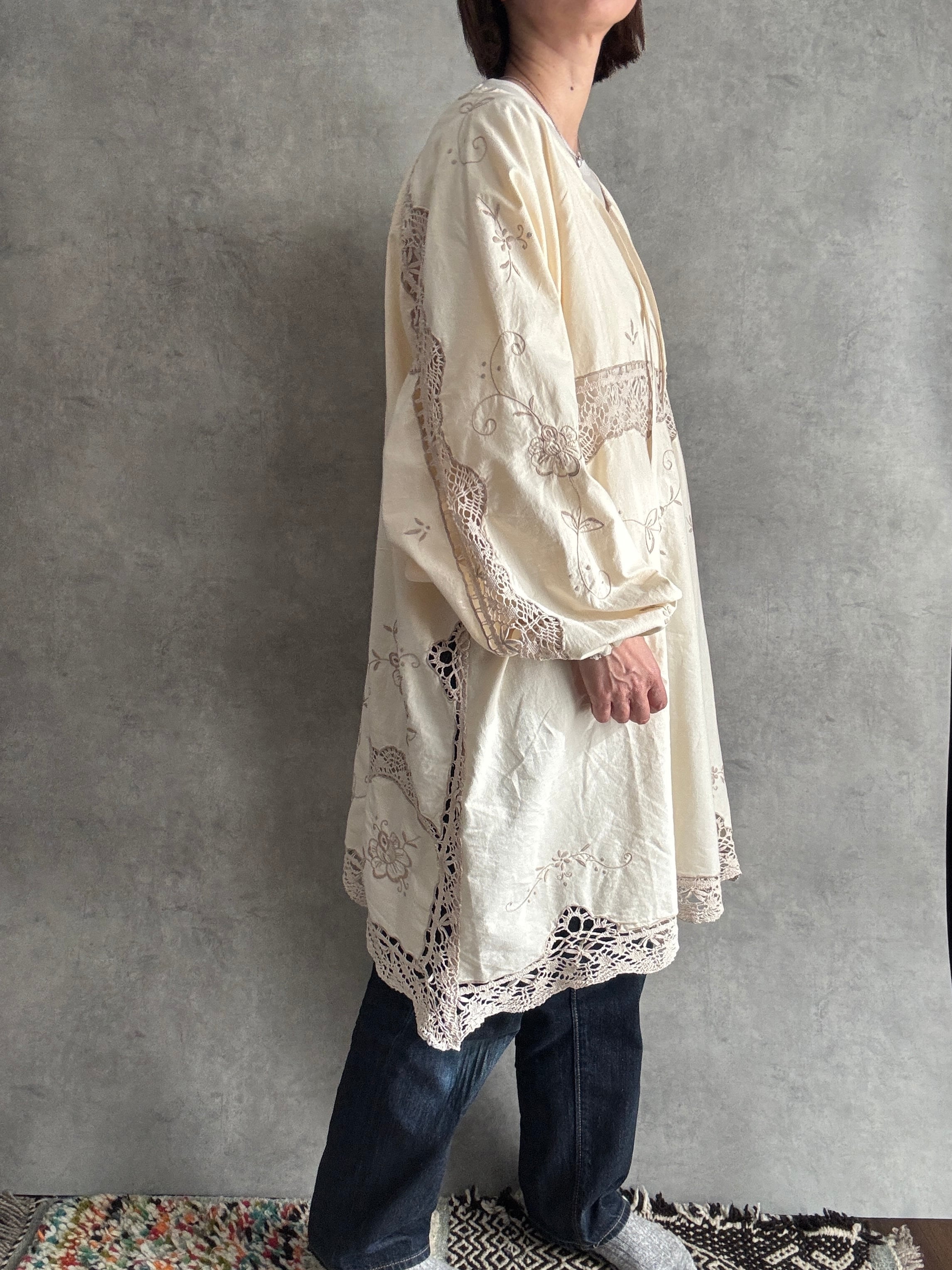 素材:おそらくヴィンテージコットンまたはコットンリネン(クロシェレース、刺繍入り)