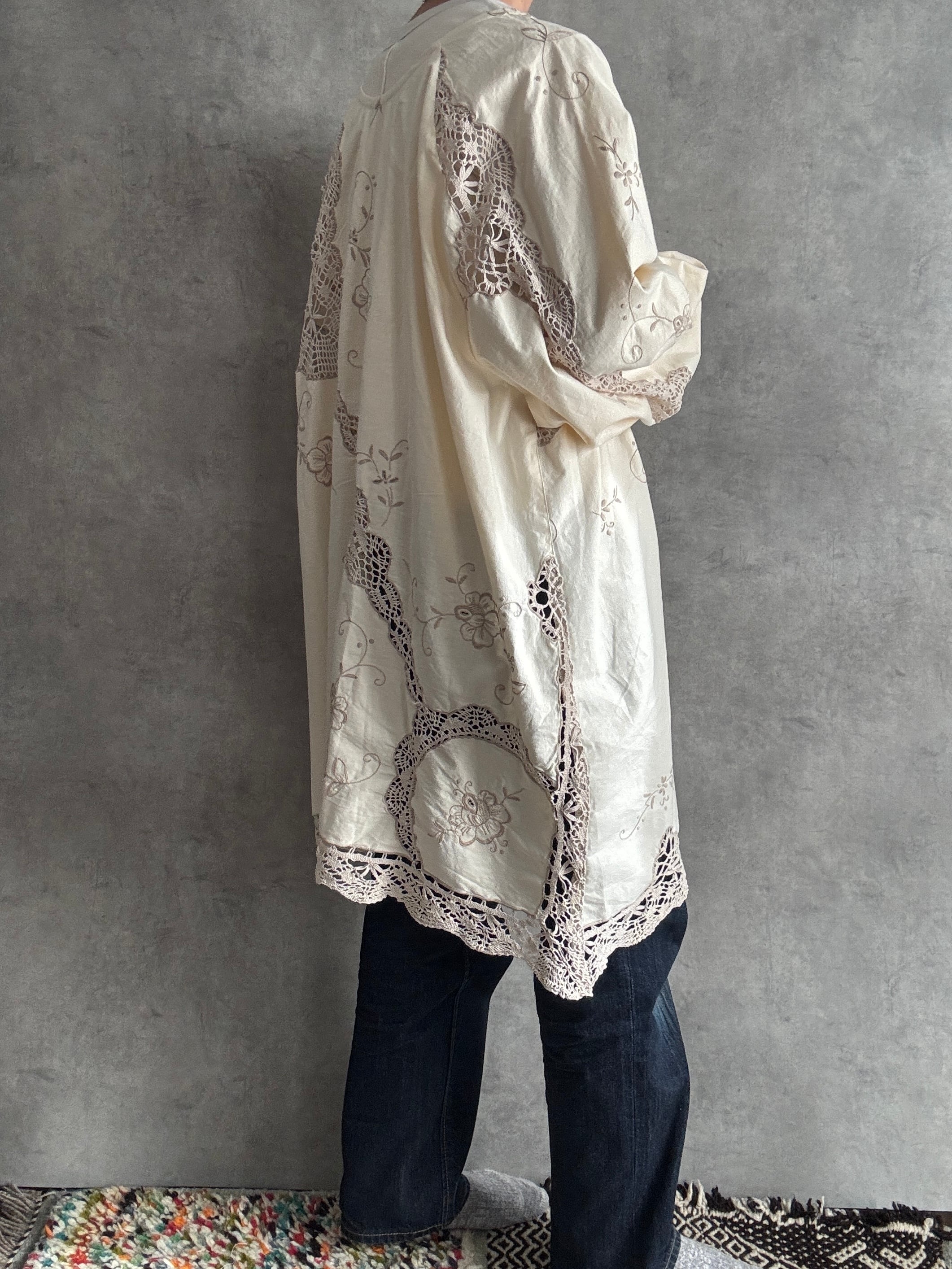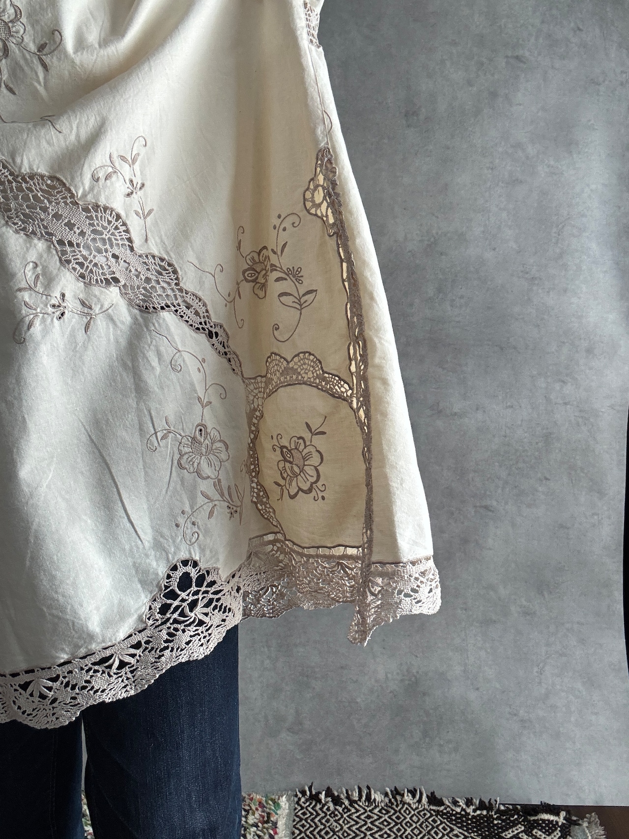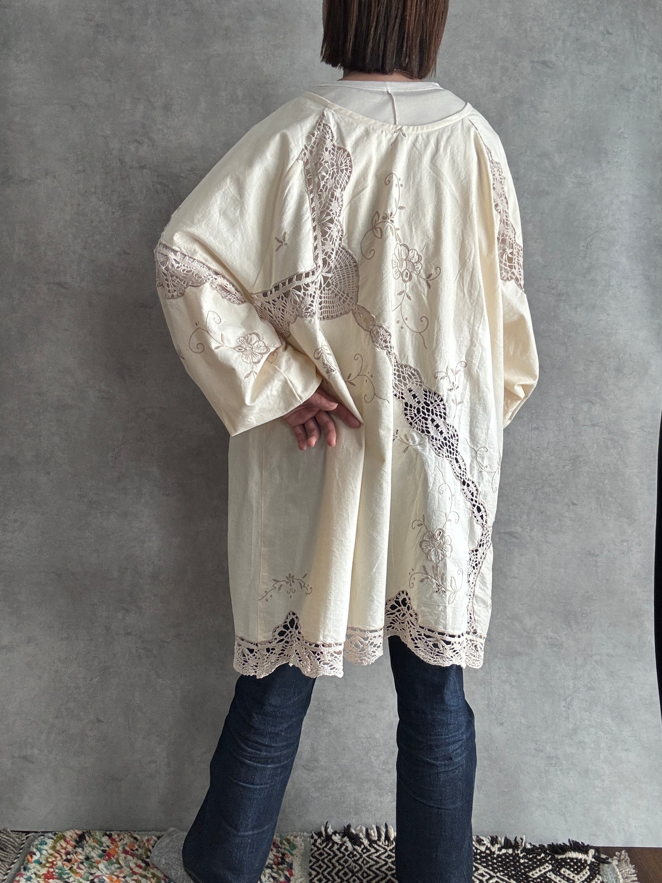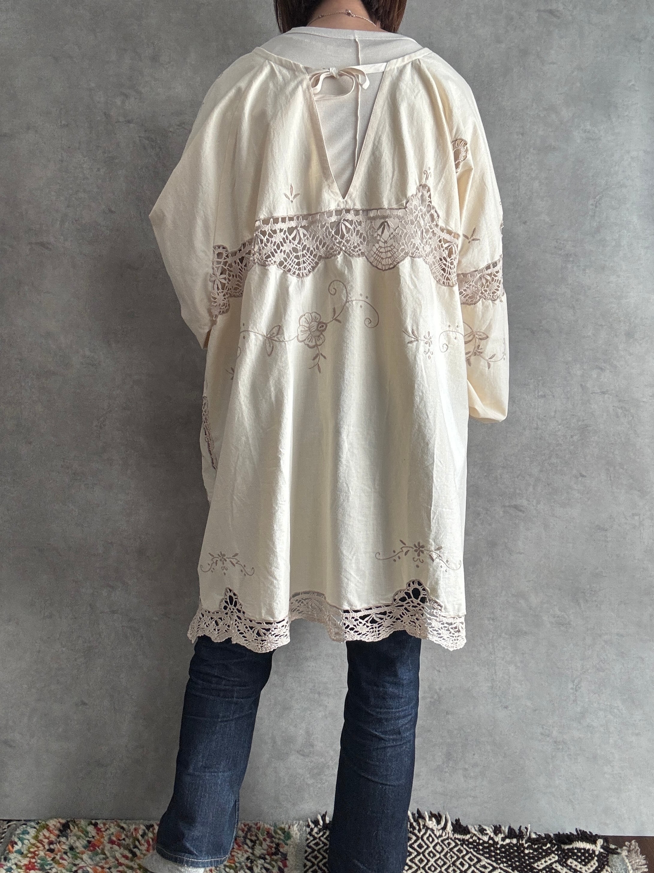 素材:おそらくヴィンテージコットンまたはコットンリネン(クロシェレース、刺繍入り)