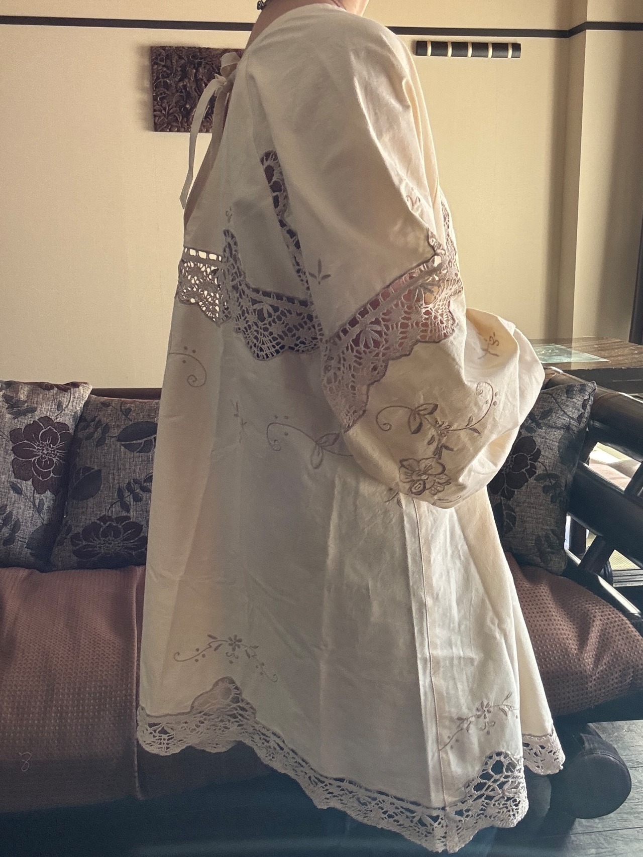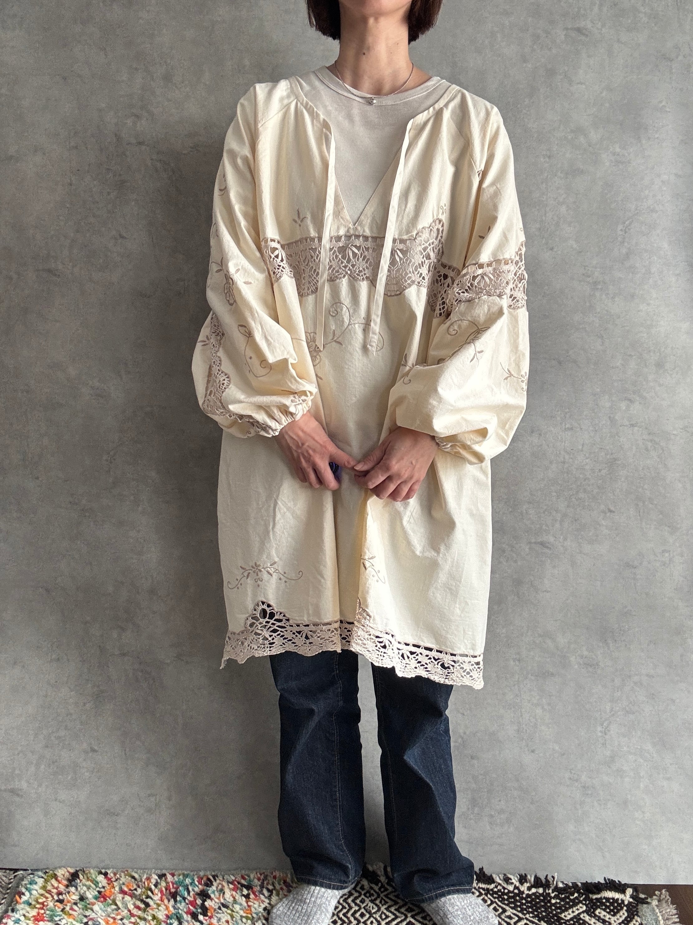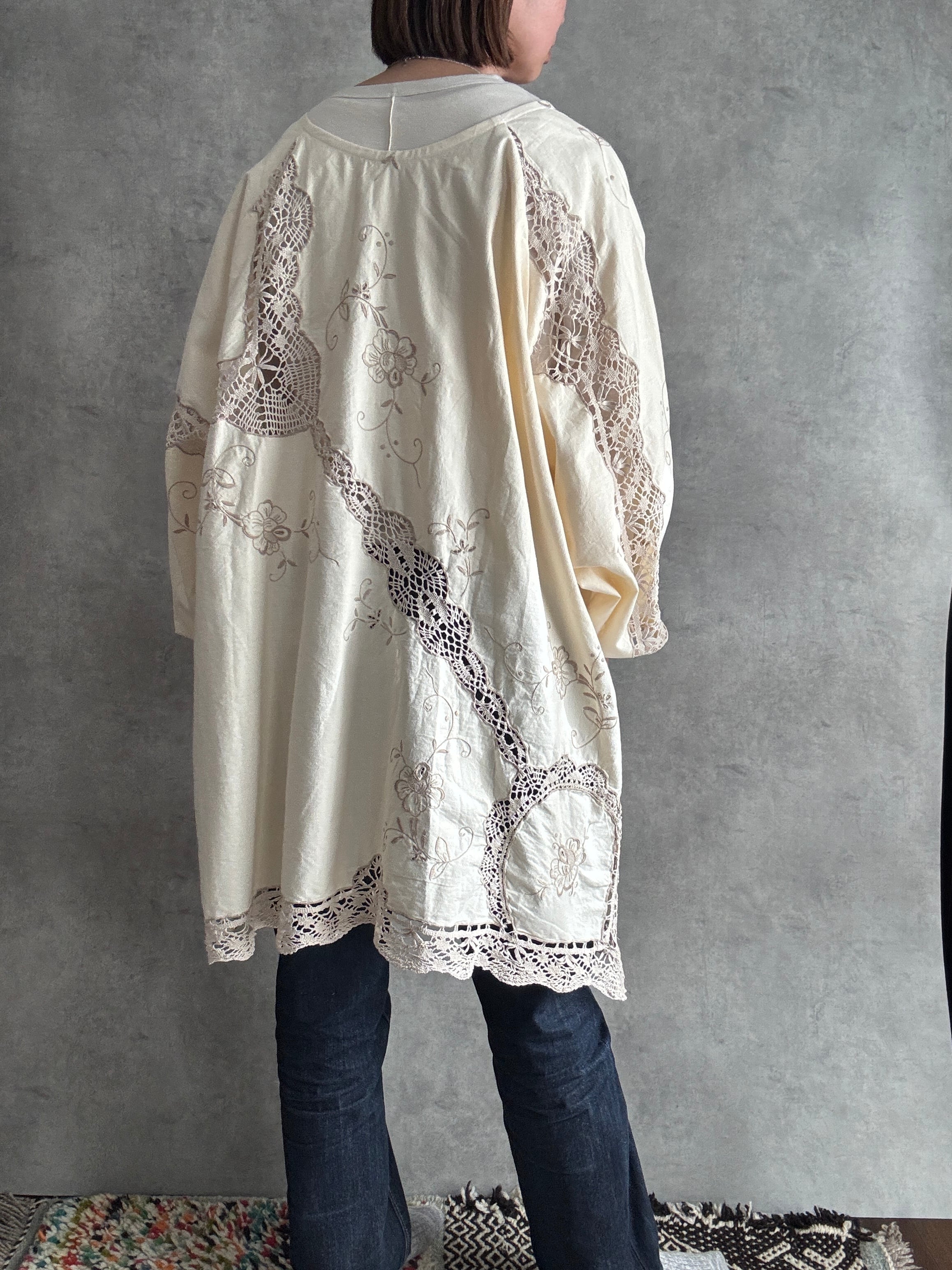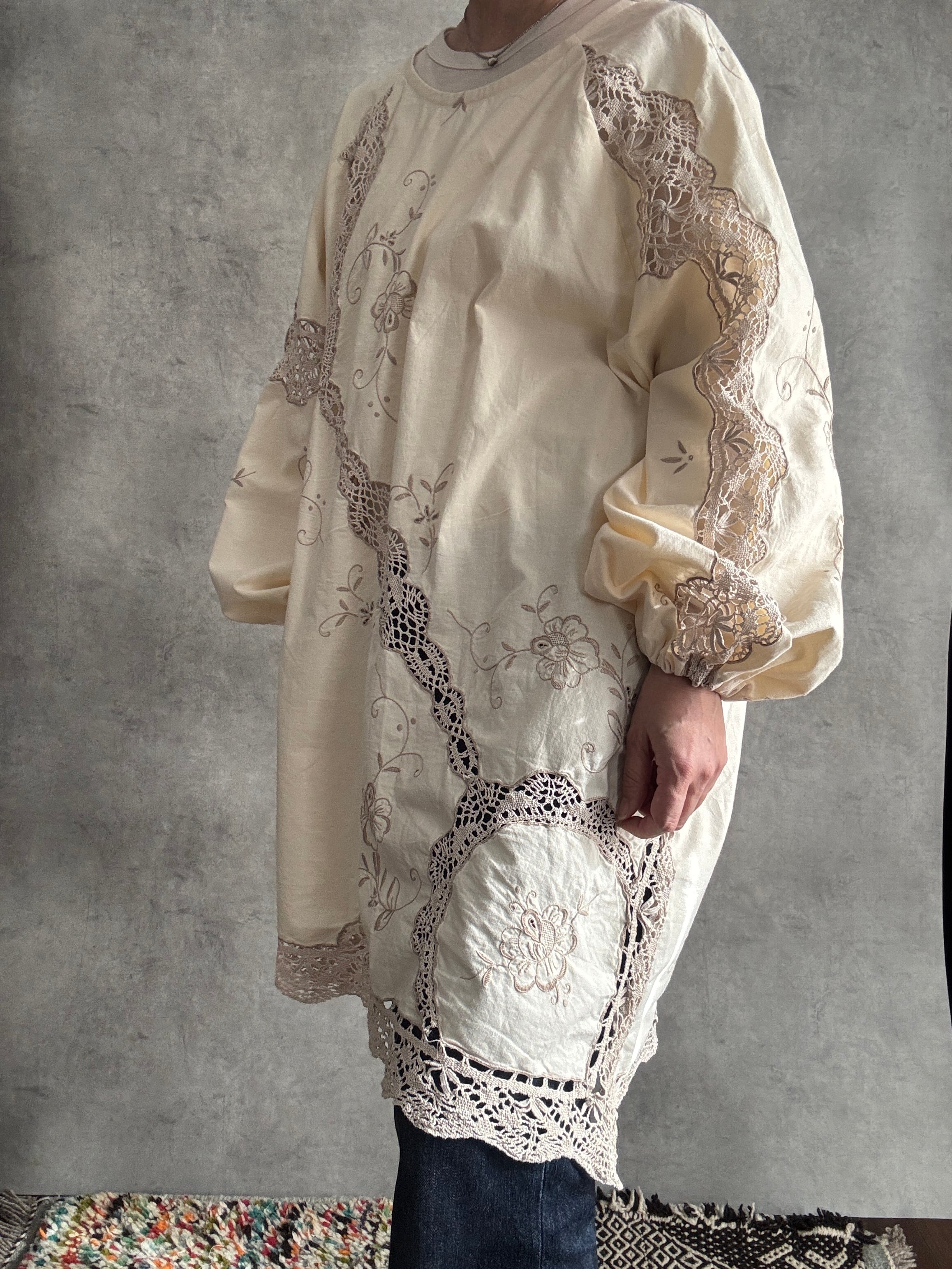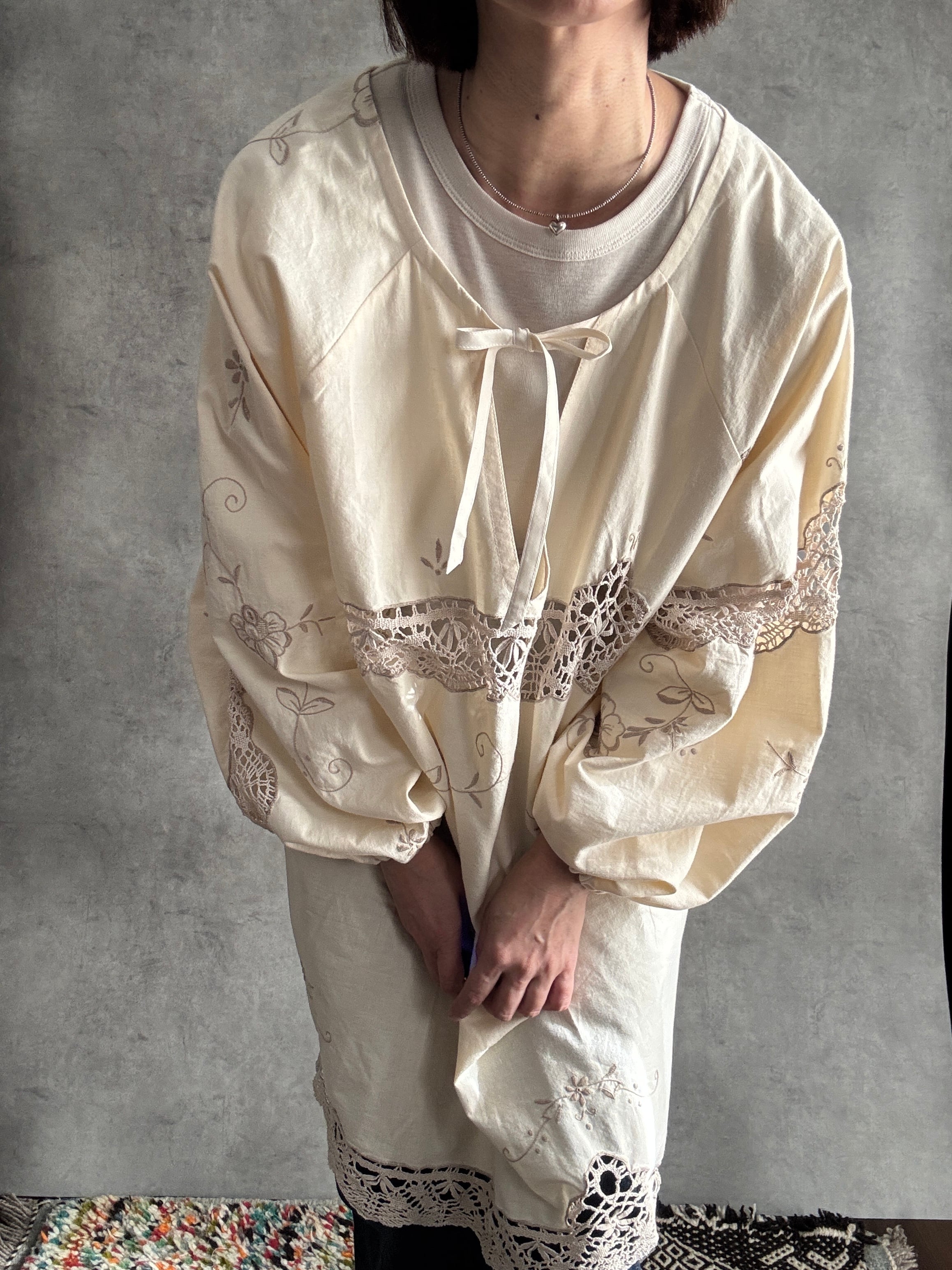 素材:おそらくヴィンテージコットンまたはコットンリネン(クロシェレース、刺繍入り)