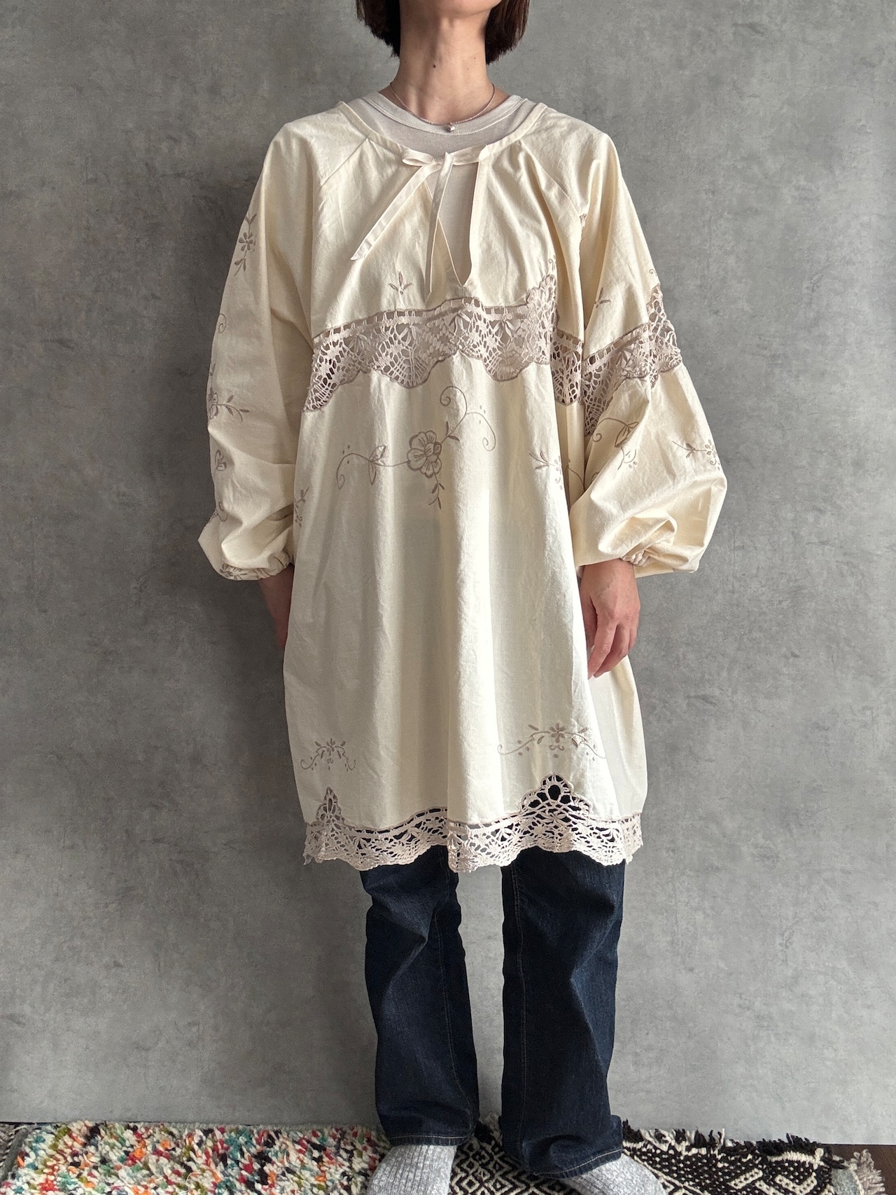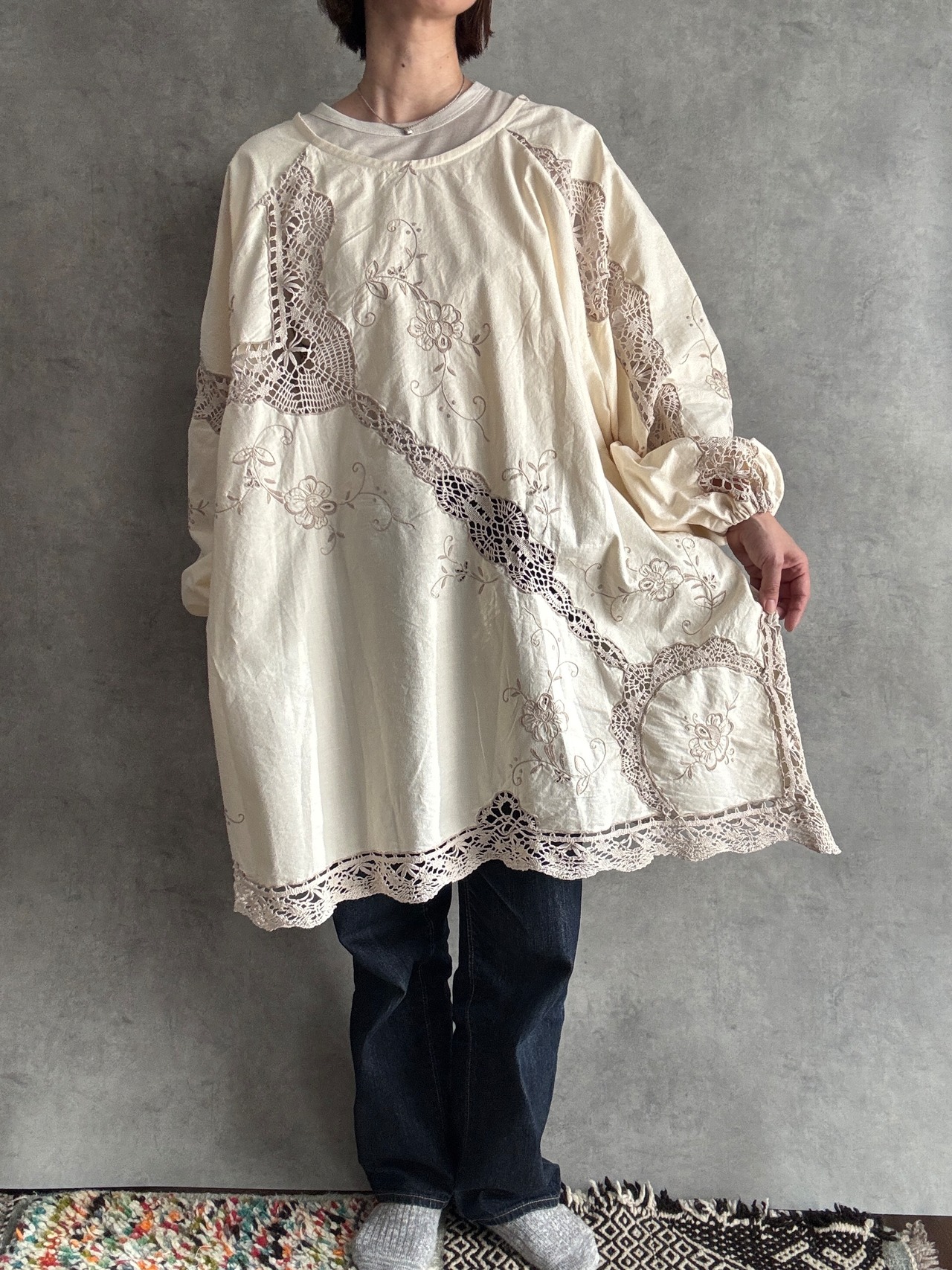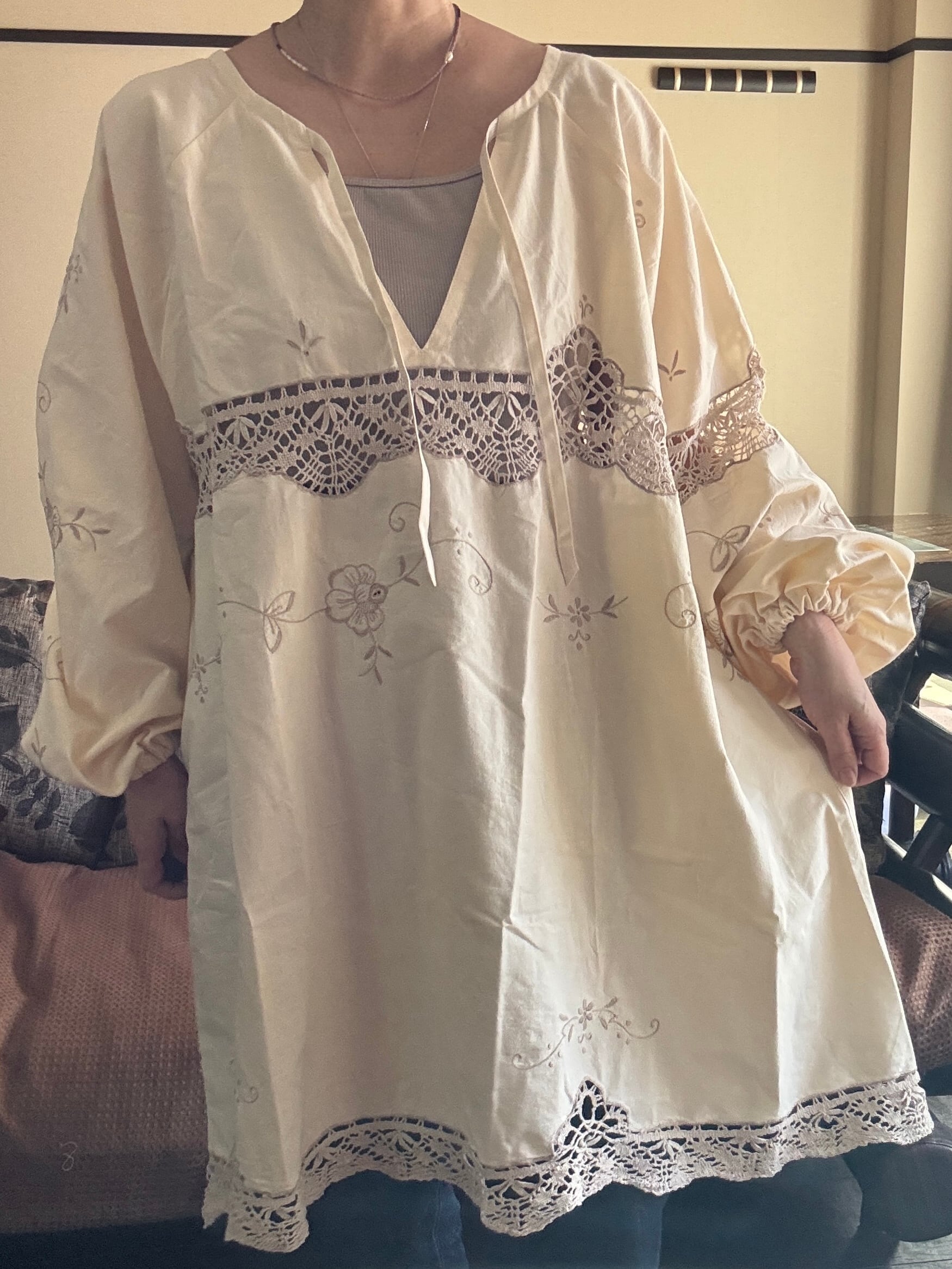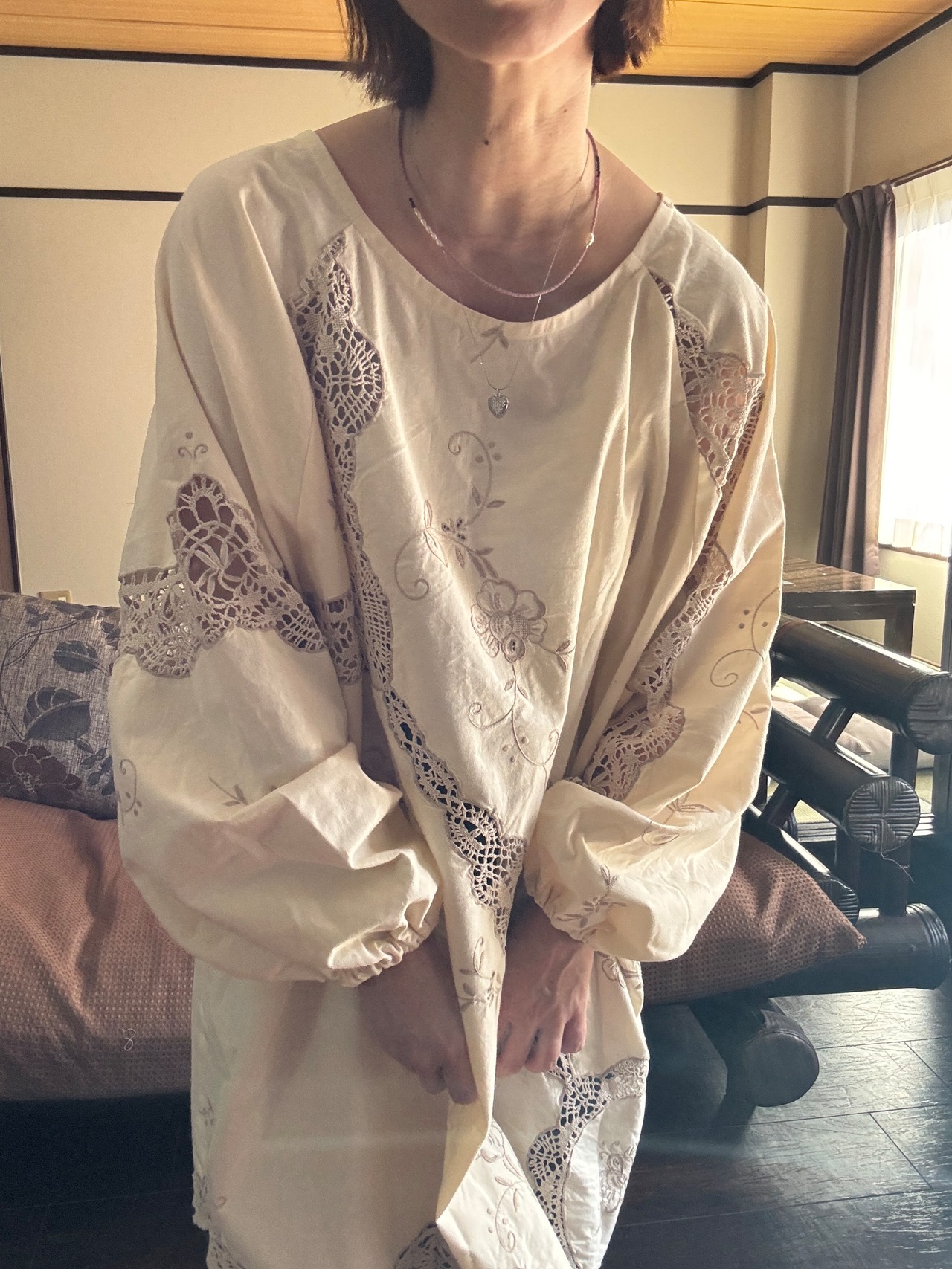 素材:おそらくヴィンテージコットンまたはコットンリネン(クロシェレース、刺繍入り)